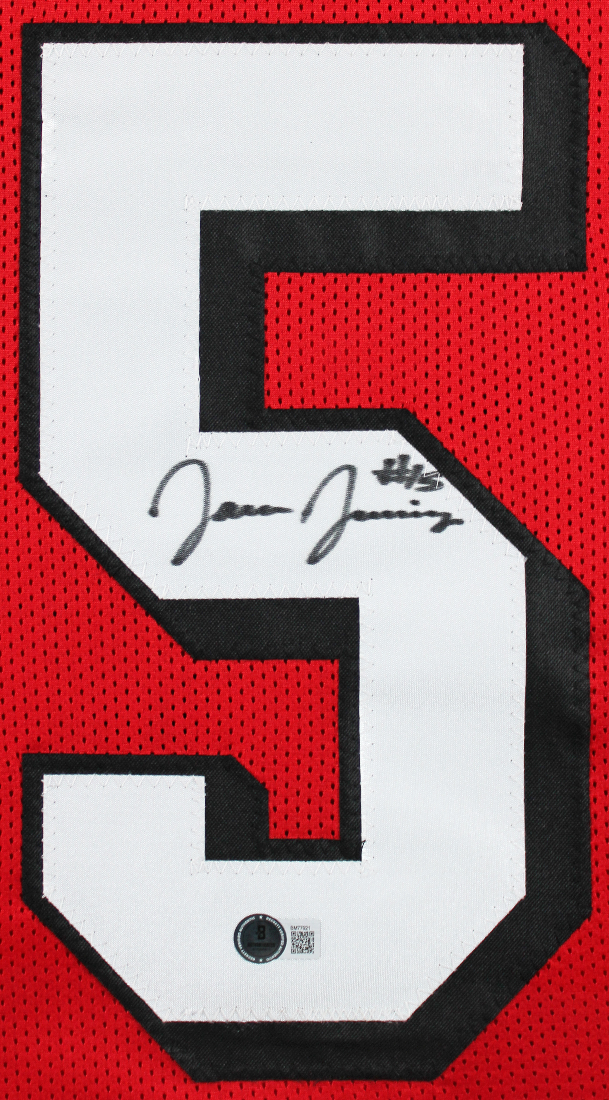This Autographed w/ Dropshadow Red Pro Style Framed Jersey has been Personally Signed by Jauan Jennings of the San Francisco 49ers. This item is 100% Authentic to include a hologram by Beckett Authentication Services. This item will come with an affixed Beckett Authentication Services (BAS) authentication sticker, which includes a scannable QR code to verify authenticity. Please note that Beckett no longer provides serial-numbered COA cards, and the attached BAS sticker will serve as the complete authentication for this item. We conducted an autograph signing with Jauan Jennings where multiples of the same item were signed. While the photographs are representative of this item, the size, placement and strength of the signature may vary. Each item is hand signed, therefore, each autograph is unique. This item can be verified through BAS. This item has been professionally framed to overall dimensions of approximately 32 x 37 inches. This is a X-Large sized, non-branded, custom-stitched Framed Jersey. This jersey will be framed to order, it will take 3-4 days from purchase date for it to ship.