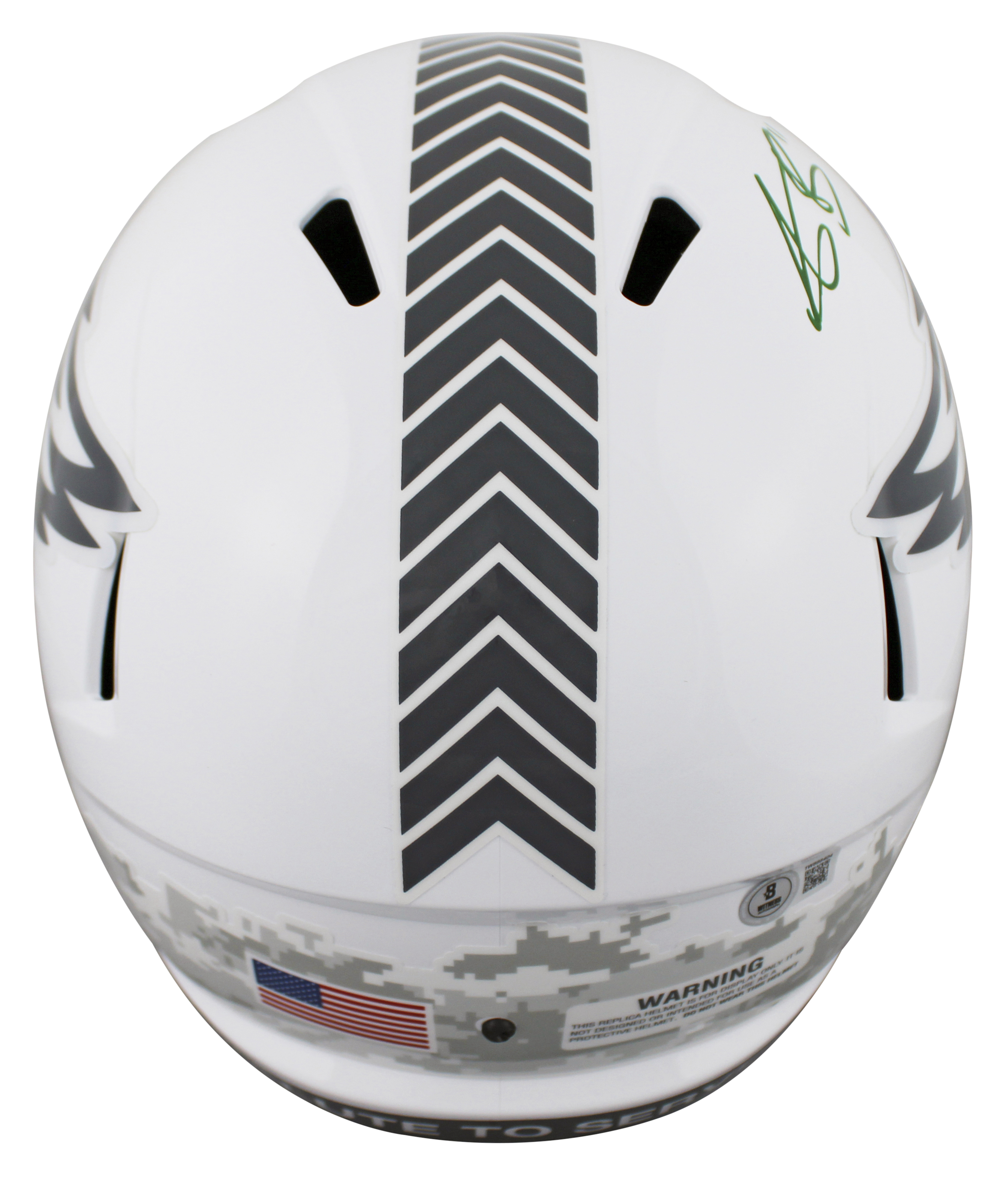 This Autographed Alternate 2024 Salute To Service III Riddell Full Size Speed Rep Helmet has been Personally Signed by A.J. Brown of the Philadelphia Eagles. This item is 100% Authentic to include a hologram by Beckett Authentication Services. This item will come with an affixed Beckett Authentication Services (BAS) authentication sticker, which includes a scannable QR code to verify authenticity. Please note that Beckett no longer provides serial-numbered COA cards, and the attached BAS sticker will serve as the complete authentication for this item. This is a BAS Witnessed Protection Program item which means a Beckett Authentication Service representative was present when this item was being signed. We conducted an autograph signing with A.J. Brown where multiples of the same item were signed. While the photographs are representative of this item, the size, placement and strength of the signature may vary. Each item is hand signed, therefore, each autograph is unique. This item can be verified through BAS Witnessed.