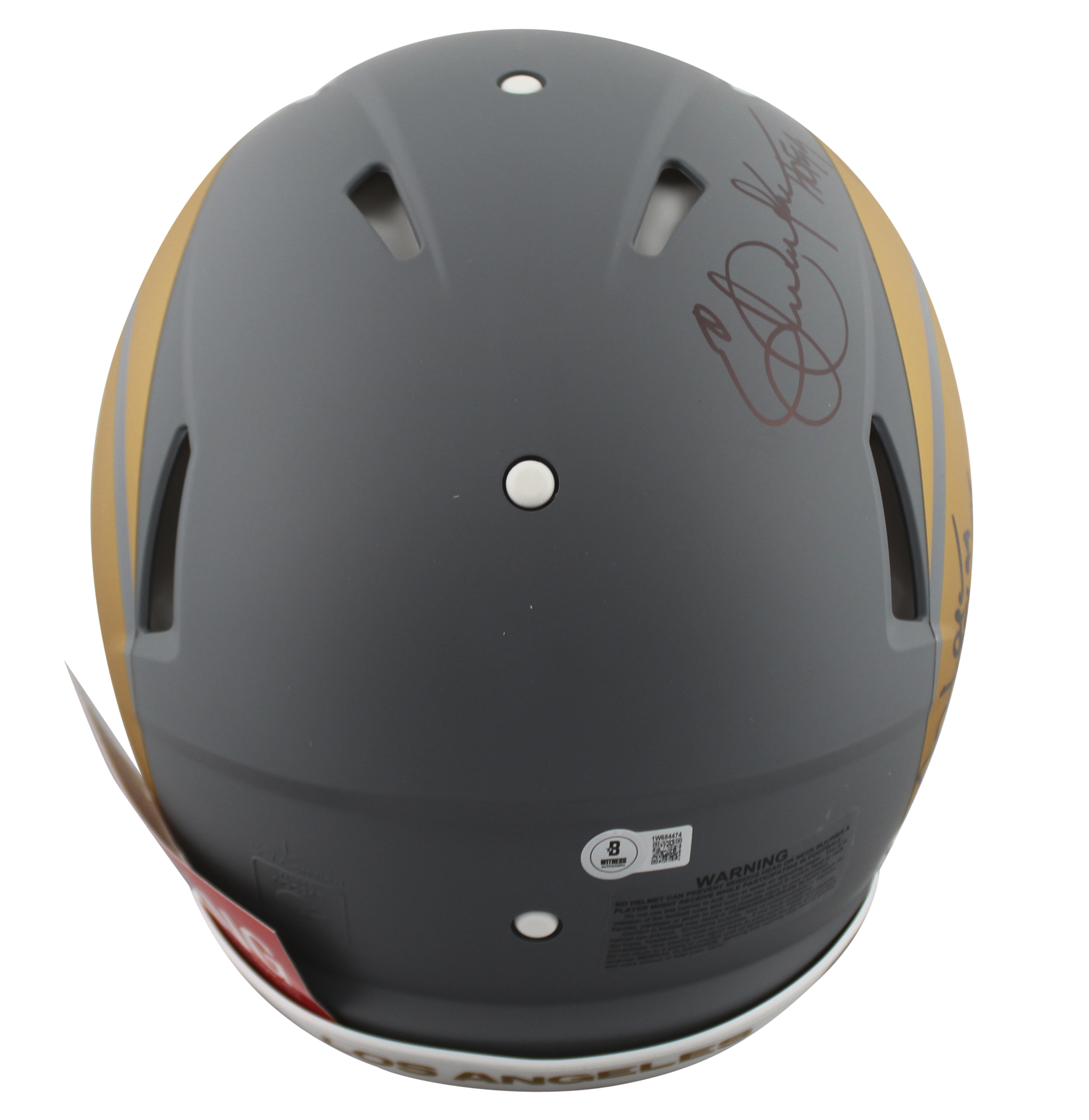 This Autographed Alternate Slate Riddell Full Size Speed Proline Helmet W/ Uv Mirrored Back Acrylic Display Case with the inscription of "HOF 99 (Dickerson)" has been Personally Signed by Jerome Bettis, Eric Dickerson, & Marshall Faulk of the Los Angeles Rams. This item is 100% Authentic to include a hologram by Beckett Authentication Services. This item may come with the new Beckett Authentication hologram that has a scannable QR code rather than the traditional COA. If you would like to have a COA, you are welcome to reach out to Beckett for a printed certification once you receive your item. This is a BAS Witnessed Protection Program item which means a Beckett Authentication Service representative was present when this item was being signed. We conducted an autograph signing with Jerome Bettis, Eric Dickerson, & Marshall Faulk where multiples of the same item were signed. While the photographs are representative of this item, the size, placement and strength of the signature may vary. Each item is hand signed, therefore, each autograph is unique. This item can be verified through BAS Witnessed.