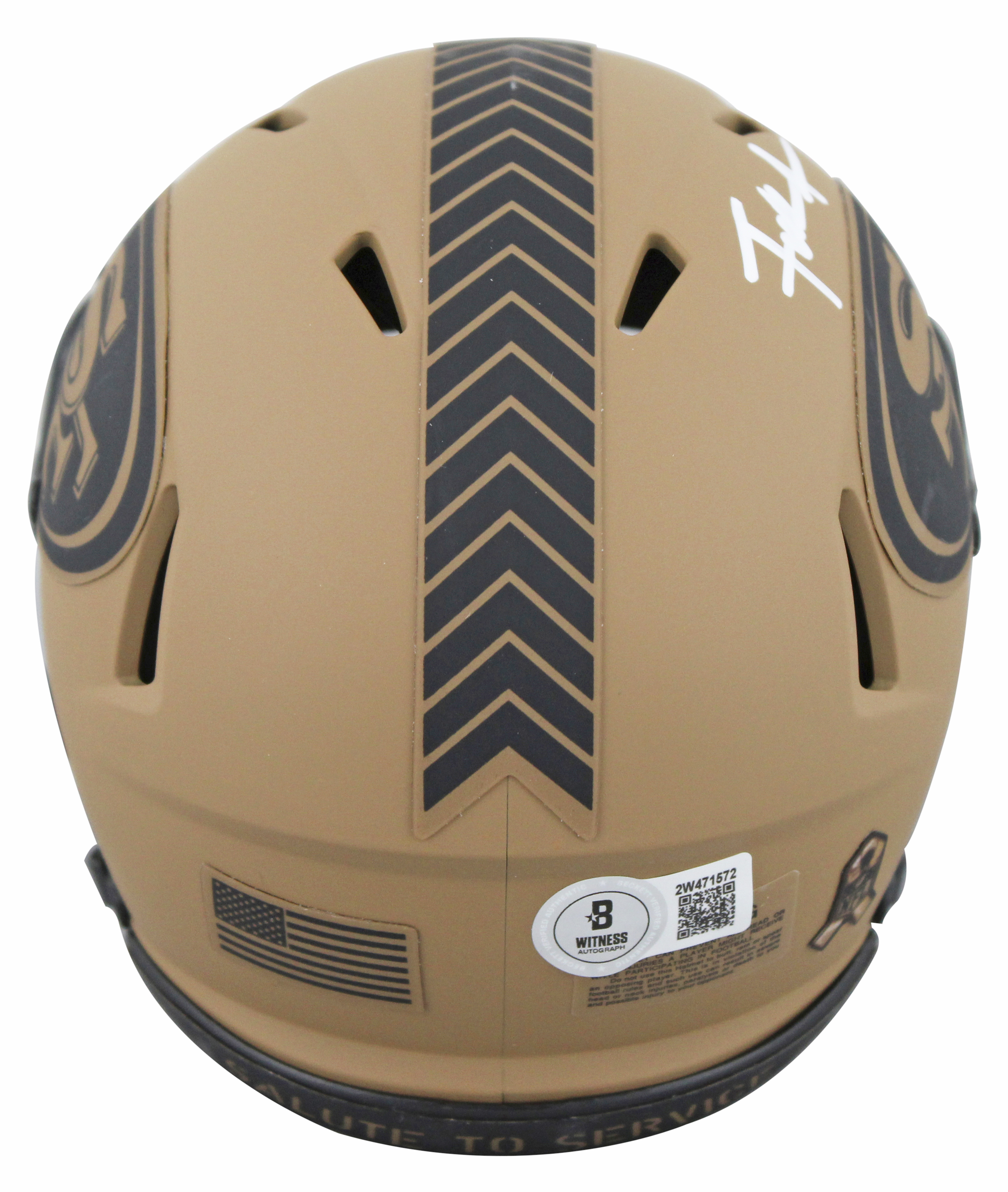 This Autographed Alternate 2023 Salute To Service II Speed Mini Helmet W/ Uv Mirrored Back Acrylic Display Case has been Personally Signed by Frank Gore of the San Francisco 49ers. This item is 100% Authentic to include a hologram by Beckett Authentication Services. This item will come with an affixed Beckett Authentication Services (BAS) authentication sticker, which includes a scannable QR code to verify authenticity. Please note that Beckett no longer provides serial-numbered COA cards, and the attached BAS sticker will serve as the complete authentication for this item. This is a BAS Witnessed Protection Program item which means a Beckett Authentication Service representative was present when this item was being signed. We conducted an autograph signing with Frank Gore where multiples of the same item were signed. While the photographs are representative of this item, the size, placement and strength of the signature may vary. Each item is hand signed, therefore, each autograph is unique. This item can be verified through BAS Witnessed.