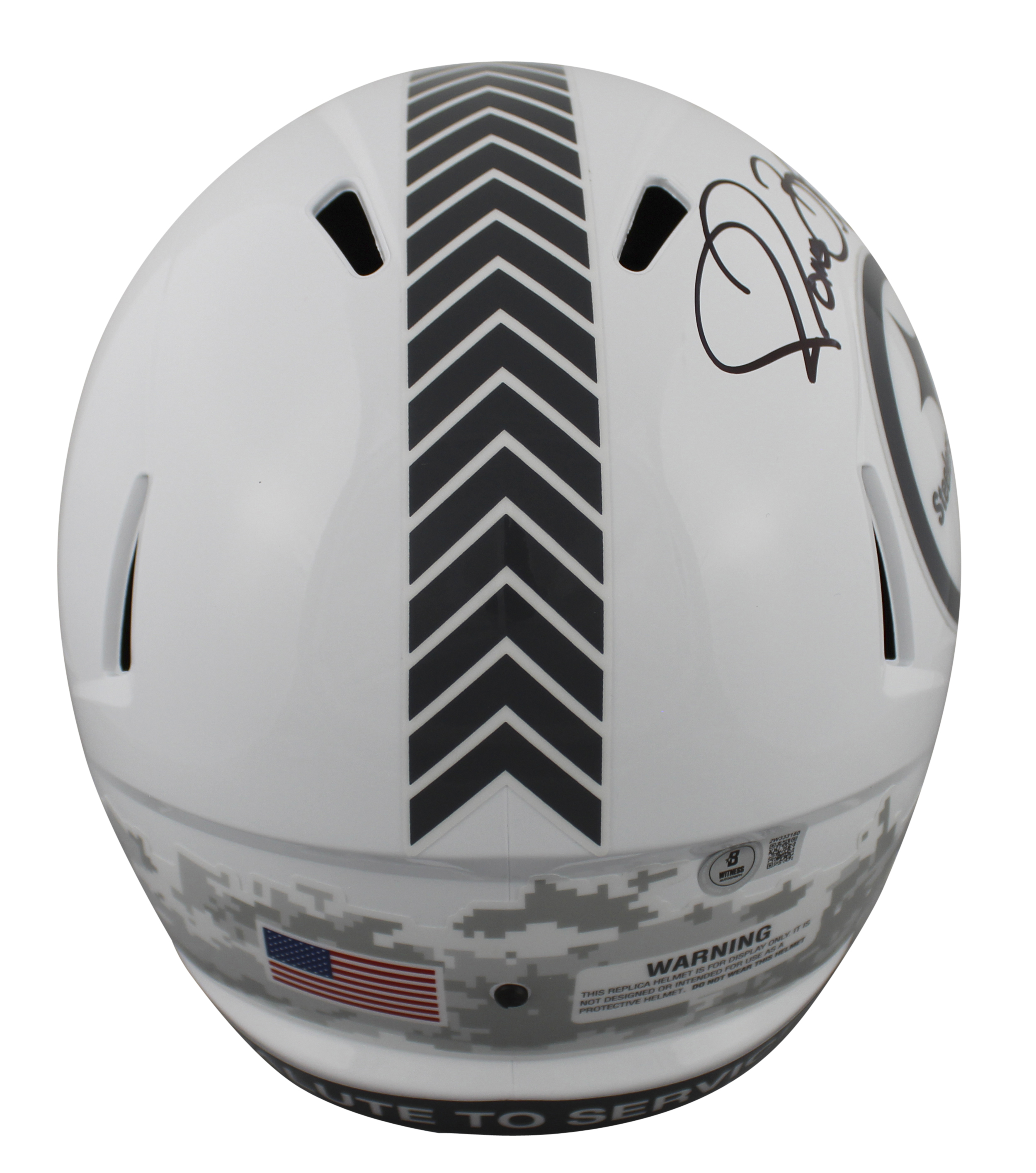 This Autographed Alternate 2024 Salute To Service III Riddell Full Size Speed Rep Helmet has been Personally Signed by Jerome Bettis of the Pittsburgh Steelers. This item is 100% Authentic to include a hologram by Beckett Authentication Services. This item will come with an affixed Beckett Authentication Services (BAS) authentication sticker, which includes a scannable QR code to verify authenticity. Please note that Beckett no longer provides serial-numbered COA cards, and the attached BAS sticker will serve as the complete authentication for this item. This is a BAS Witnessed Protection Program item which means a Beckett Authentication Service representative was present when this item was being signed. We conducted an autograph signing with Jerome Bettis where multiples of the same item were signed. While the photographs are representative of this item, the size, placement and strength of the signature may vary. Each item is hand signed, therefore, each autograph is unique. This item can be verified through BAS Witnessed.