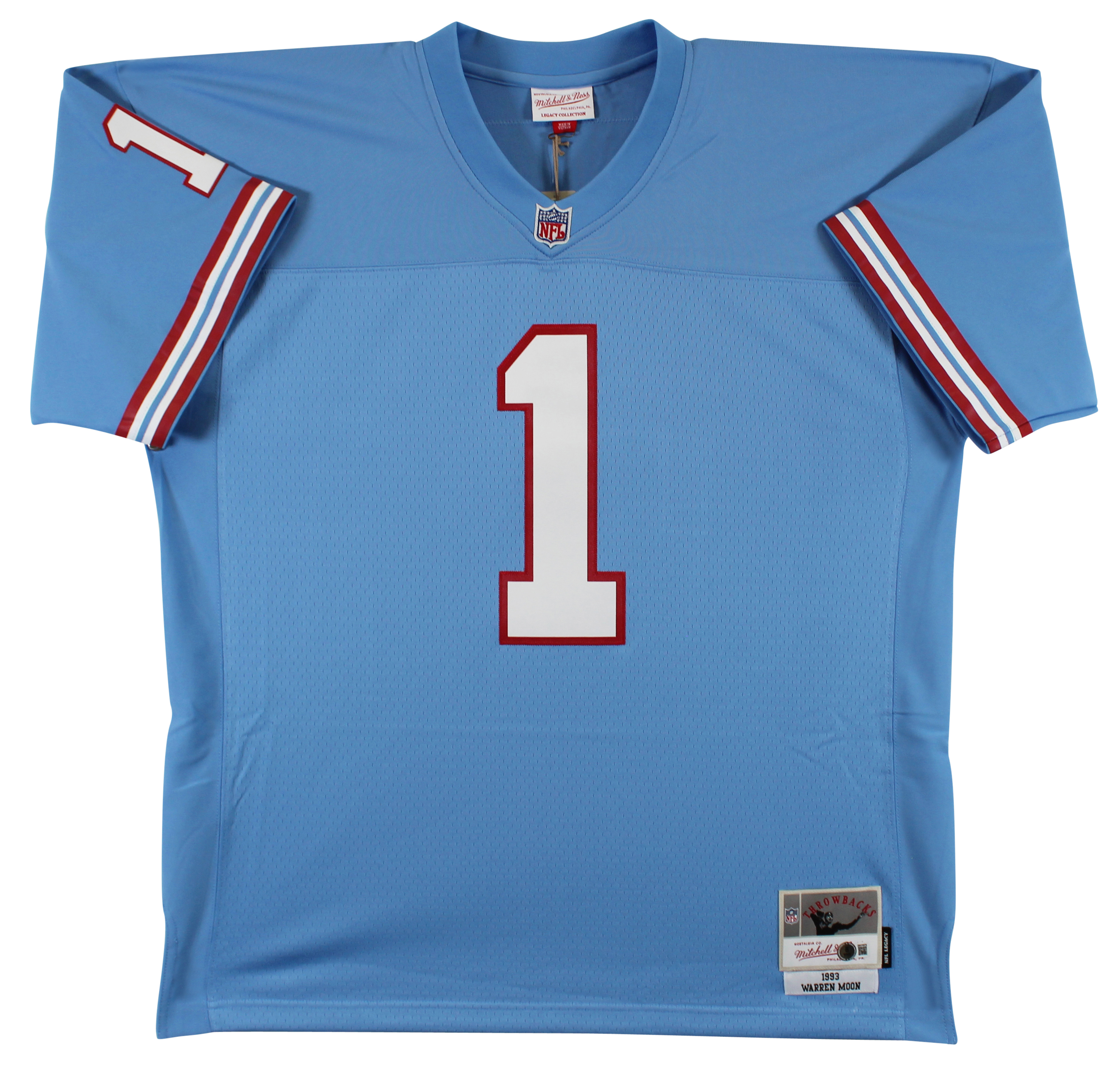 This Autographed Light Blue 1993 Mitchell & Ness Throwback Jersey with the inscription of "HOF 06, OPOY 90, 9x Pro Bowl, 291 Pass TDs, 49,325 Pass Yds" has been Personally Signed by Warren Moon of the Houston Oilers. This item is 100% Authentic to include a hologram by Beckett Authentication Services. This item will come with an affixed Beckett Authentication Services (BAS) authentication sticker, which includes a scannable QR code to verify authenticity. Please note that Beckett no longer provides serial-numbered COA cards, and the attached BAS sticker will serve as the complete authentication for this item. This is a BAS Witnessed Protection Program item which means a Beckett Authentication Service representative was present when this item was being signed. We have multiples of this same item. While the photographs are representative of this item, the size, placement and strength of the signature may vary. Each item is hand signed, therefore, each autograph is unique. This is a X-Large sized Jersey.