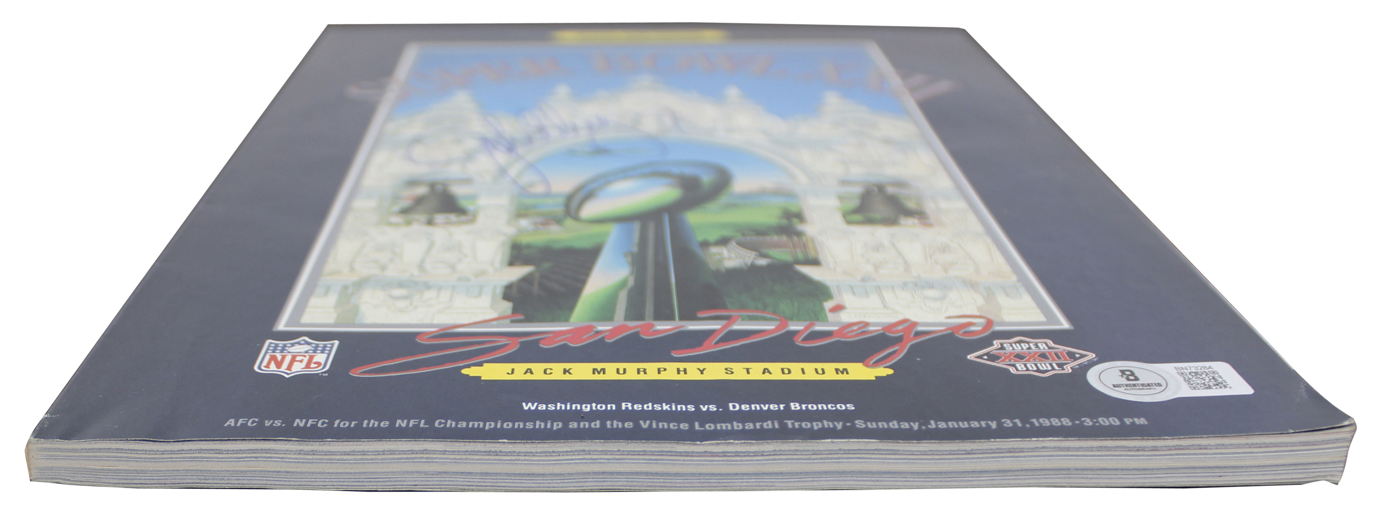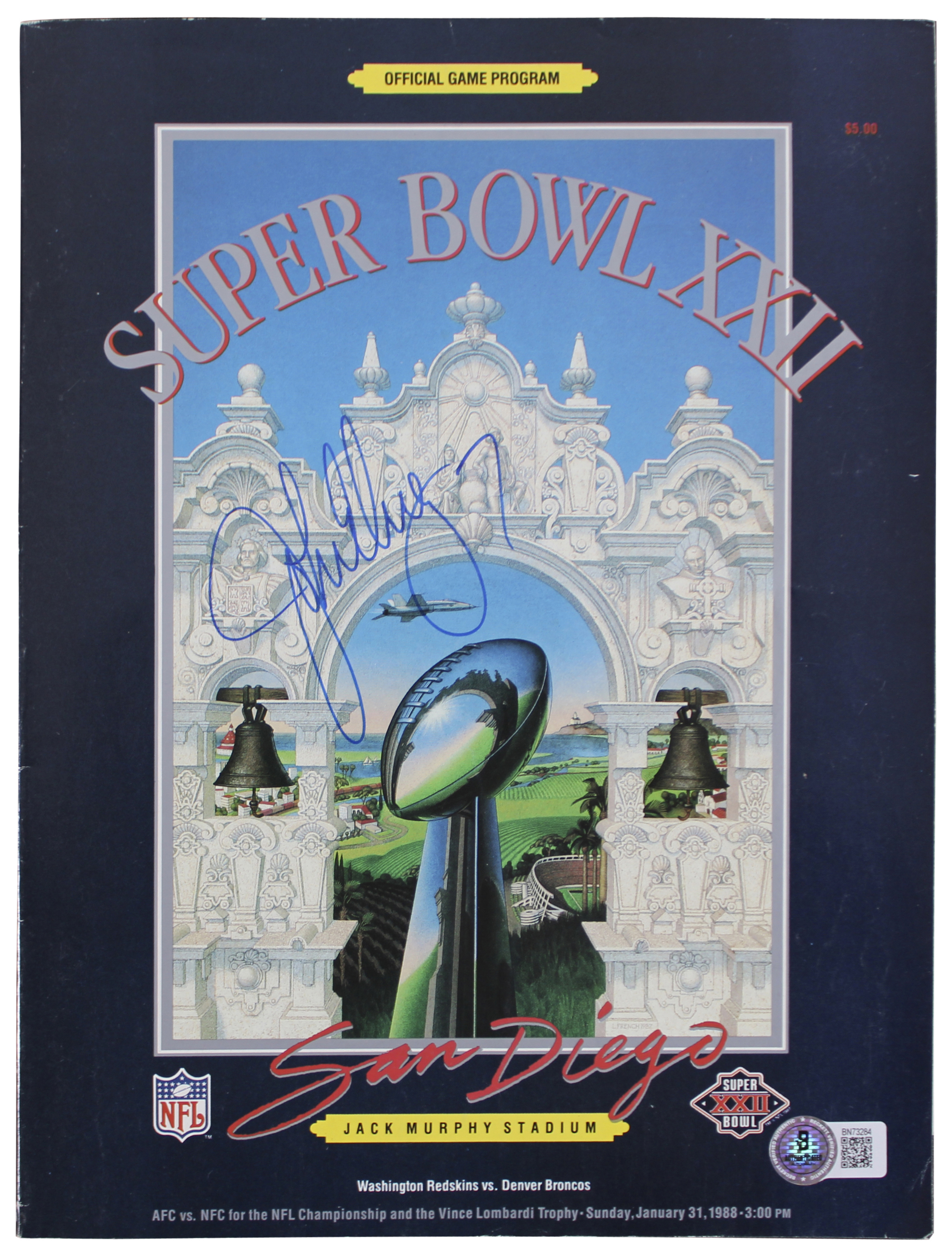 This Autographed Official Super Bowl XXII Program has been Personally Signed by John Elway of the Denver Broncos. This item is 100% Authentic to include a hologram by Beckett Authentication Services. This item will come with an affixed Beckett Authentication Services (BAS) authentication sticker, which includes a scannable QR code to verify authenticity. Please note that Beckett no longer provides serial-numbered COA cards, and the attached BAS sticker will serve as the complete authentication for this item. The authenticity can be verified on Beckett Authentication Services website.