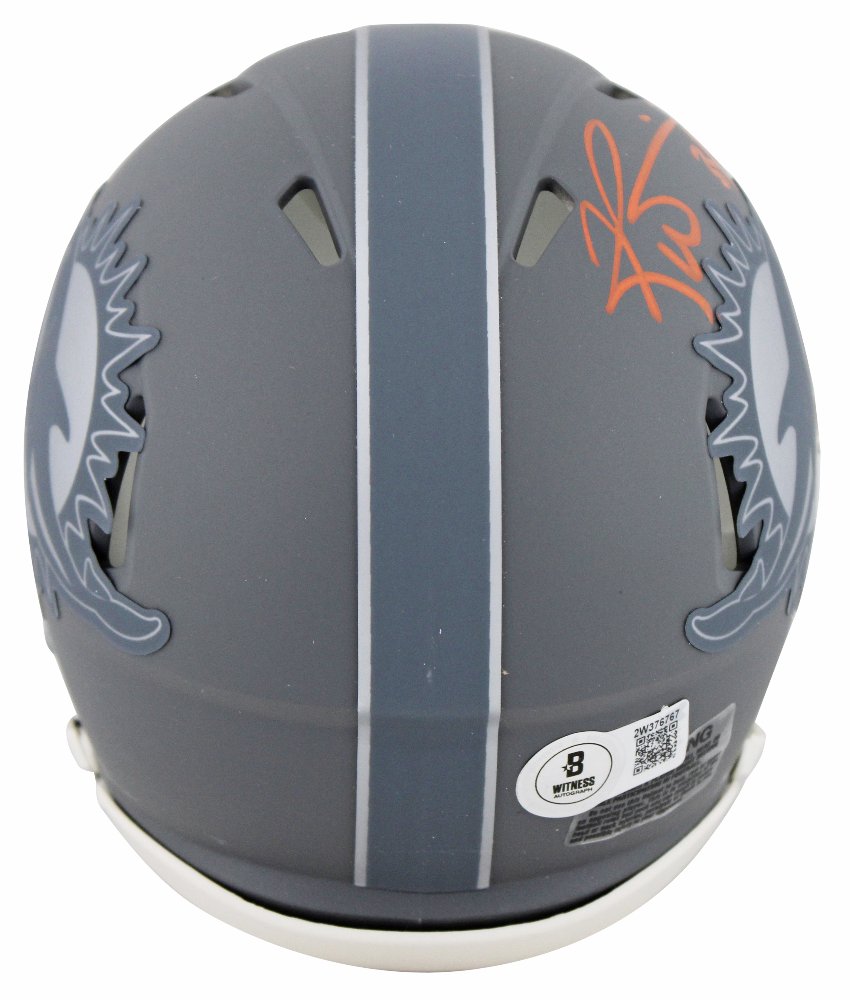 This Autographed Alternate Slate Speed Mini Helmet W/ Uv Mirrored Back Acrylic Display Case has been Personally Signed by Ricky Williams of the Miami Dolphins. This item is 100% Authentic to include a hologram by Beckett Authentication Services. This item will come with an affixed Beckett Authentication Services (BAS) authentication sticker, which includes a scannable QR code to verify authenticity. Please note that Beckett no longer provides serial-numbered COA cards, and the attached BAS sticker will serve as the complete authentication for this item. This is a BAS Witnessed Protection Program item which means a Beckett Authentication Service representative was present when this item was being signed. We conducted an autograph signing with Ricky Williams where multiples of the same item were signed. While the photographs are representative of this item, the size, placement and strength of the signature may vary. Each item is hand signed, therefore, each autograph is unique. This item can be verified through BAS Witnessed.