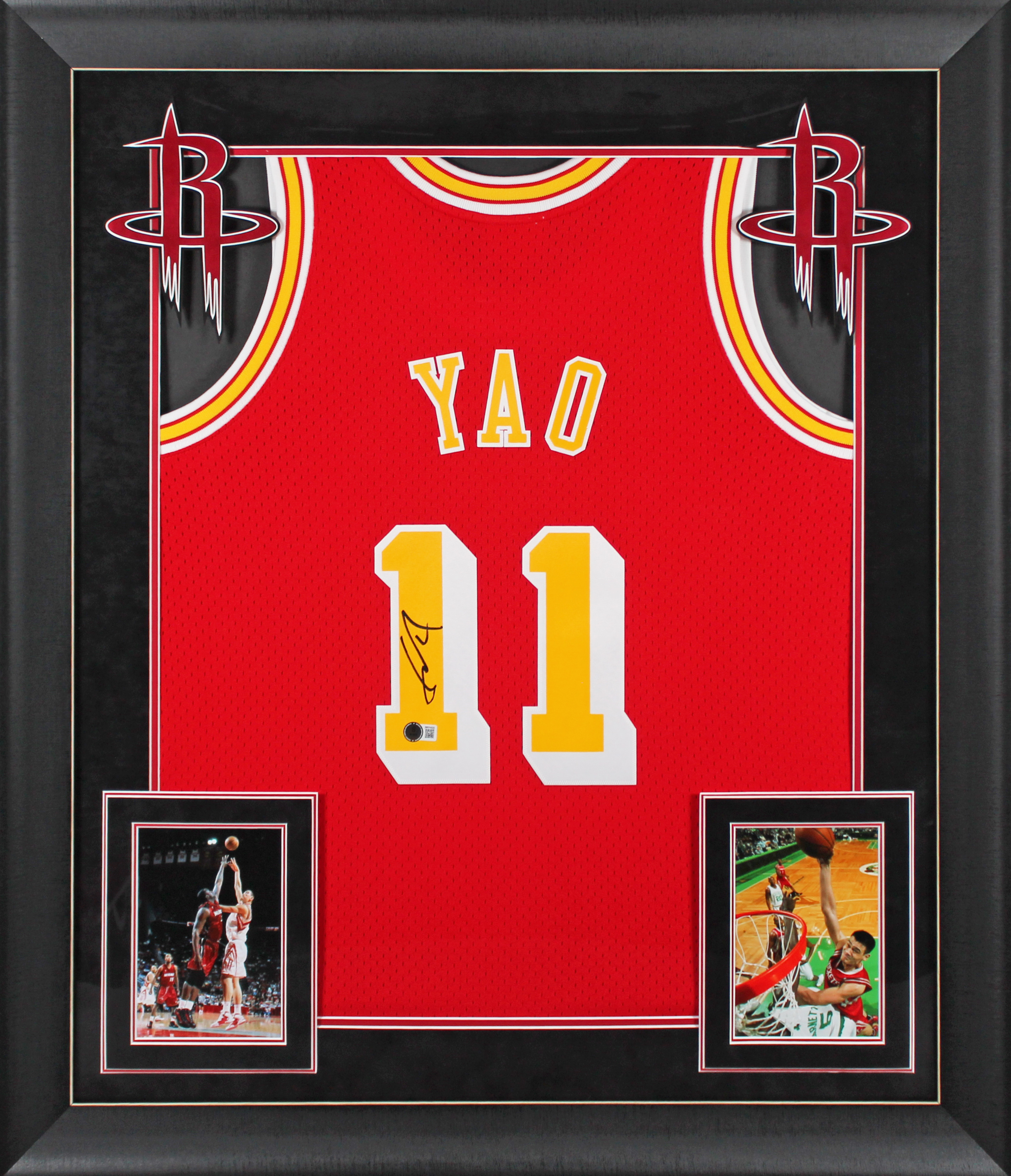 This Autographed Red Mitchell & Ness 2004-05 Hardwood Classics Swingman Framed Jersey has been Personally Signed by Yao Ming of the Houston Rockets. This item is 100% Authentic to include a hologram by Beckett Authentication Services. This item will come with an affixed Beckett Authentication Services (BAS) authentication sticker, which includes a scannable QR code to verify authenticity. Please note that Beckett no longer provides serial-numbered COA cards, and the attached BAS sticker will serve as the complete authentication for this item. This is a BAS Witnessed Protection Program item which means a Beckett Authentication Service representative was present when this item was being signed. We conducted an autograph signing with Yao Ming where multiples of the same item were signed. While the photographs are representative of this item, the size, placement and strength of the signature may vary. Each item is hand signed, therefore, each autograph is unique. This item can be verified through BAS Witnessed. This item has been professionally framed to overall dimensions of approximately 32 x 37 inches. This jersey will be framed to order, it will take 3-4 days from purchase date for it to ship.