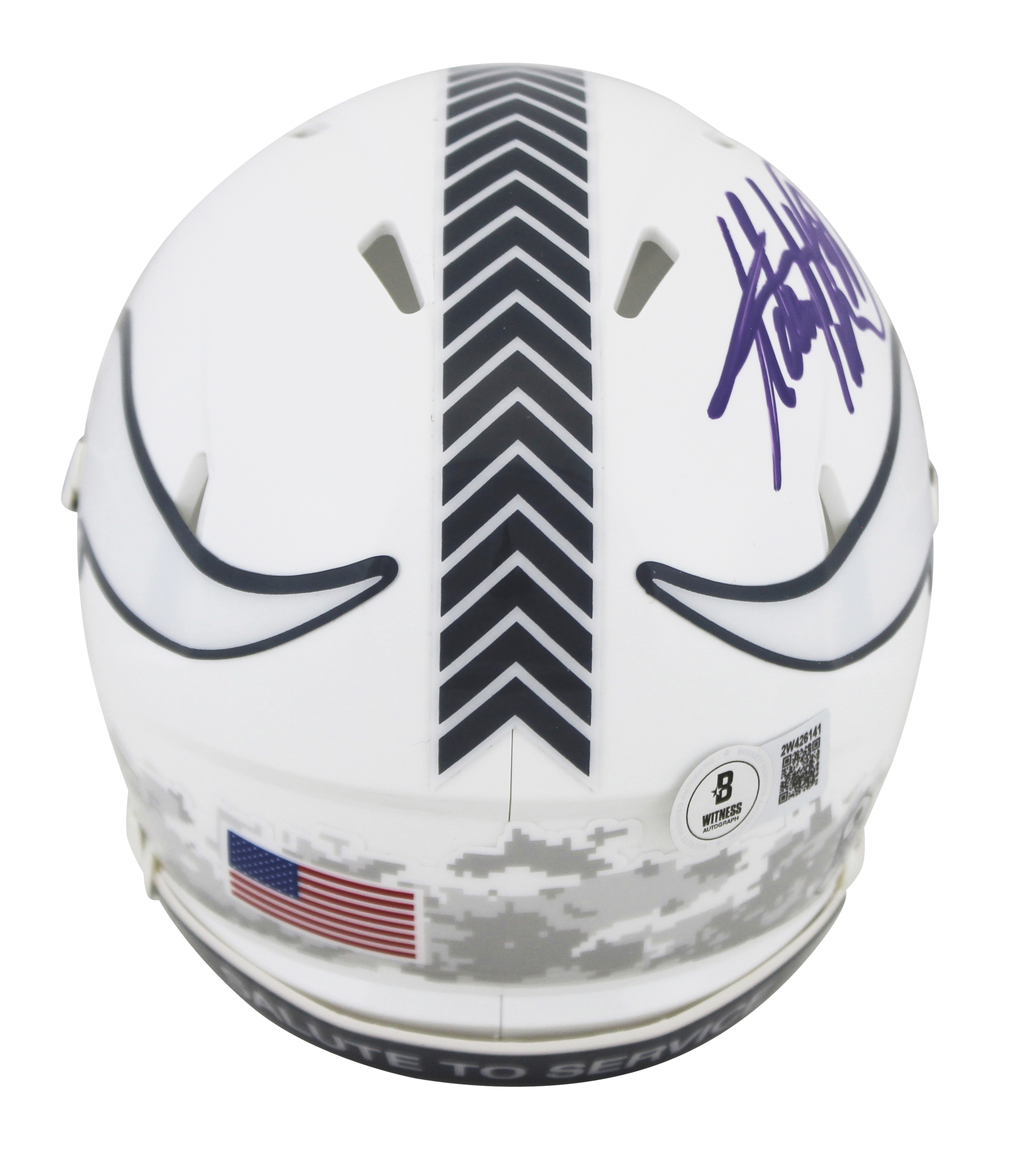 This Autographed Alternate 2024 Salute To Service III Speed Mini Helmet has been Personally Signed by Adrian Peterson of the Minnesota Vikings. This item is 100% Authentic to include a hologram by Beckett Authentication Services. This item will come with an affixed Beckett Authentication Services (BAS) authentication sticker, which includes a scannable QR code to verify authenticity. Please note that Beckett no longer provides serial-numbered COA cards, and the attached BAS sticker will serve as the complete authentication for this item. This is a BAS Witnessed Protection Program item which means a Beckett Authentication Service representative was present when this item was being signed. We conducted an autograph signing with Adrian Peterson where multiples of the same item were signed. While the photographs are representative of this item, the size, placement and strength of the signature may vary. Each item is hand signed, therefore, each autograph is unique. This item can be verified through BAS Witnessed.