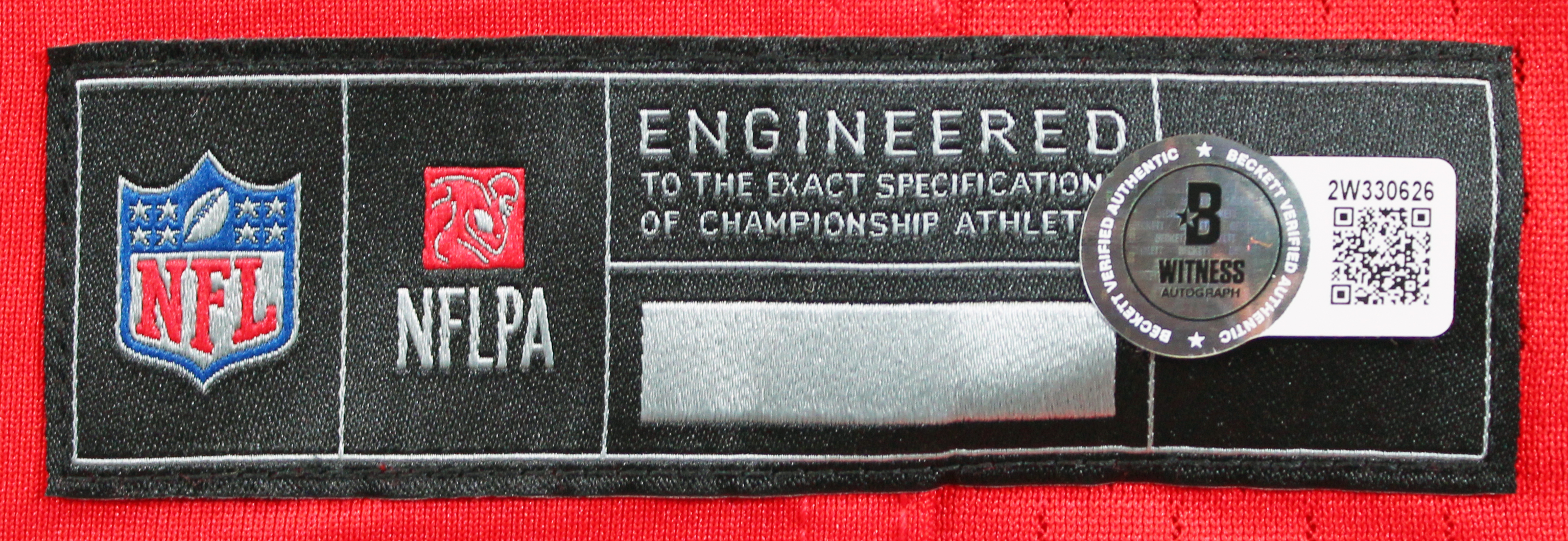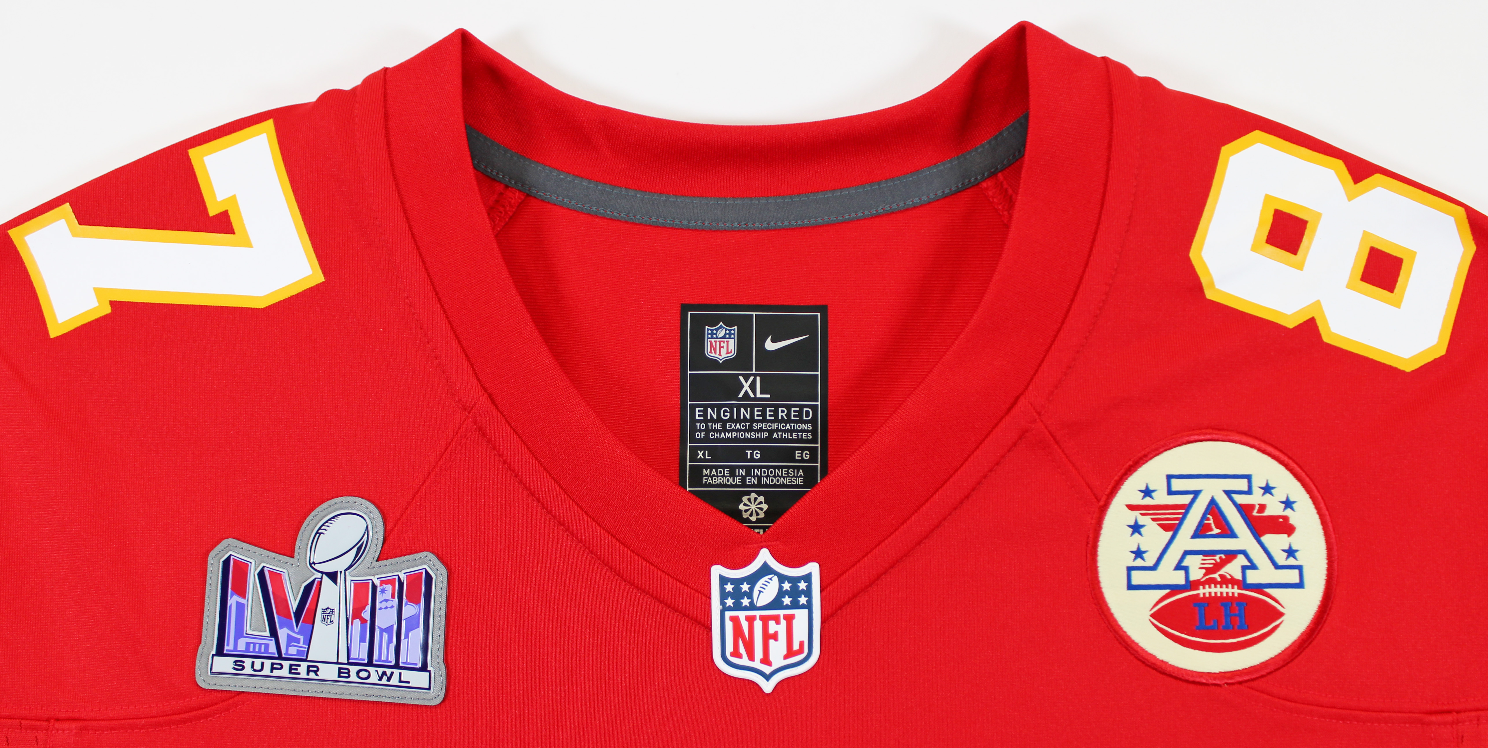 This Autographed w/ Super Bowl LVIII Patch Red Nike Game Jersey has been Personally Signed by Travis Kelce of the Kansas City Chiefs. This item is 100% Authentic to include a hologram by Beckett Authentication Services. This item may come with the new Beckett Authentication hologram that has a scannable QR code rather than the traditional COA. If you would like to have a COA, you are welcome to reach out to Beckett for a printed certification once you receive your item. This is a BAS Witnessed Protection Program item which means a Beckett Authentication Service representative was present when this item was being signed. We conducted an autograph signing with Travis Kelce where multiples of the same item were signed. While the photographs are representative of this item, the size, placement and strength of the signature may vary. Each item is hand signed, therefore, each autograph is unique. This item can be verified through BAS Witnessed. This is a X-Large sized Jersey.