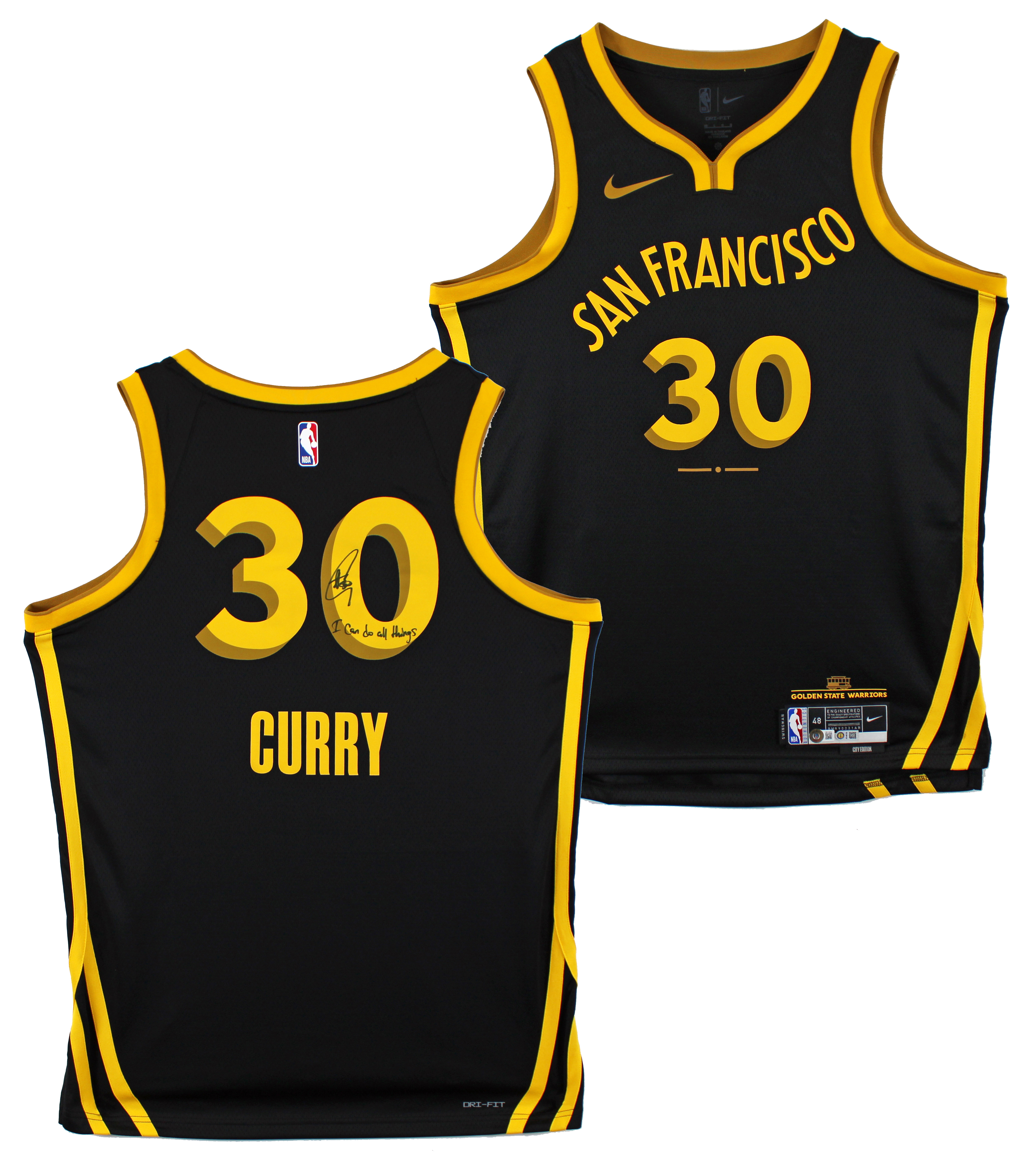 This Autographed Black Nike 2023 City Edition Swingman Jersey with the inscription of "I Can Do All Things" has been Personally Signed by Stephen Curry of the Golden State Warriors. This item is 100% Authentic to include a hologram by Beckett Authentication Services. This item will come with an affixed Beckett Authentication Services (BAS) authentication sticker, which includes a scannable QR code to verify authenticity. Please note that Beckett no longer provides serial-numbered COA cards, and the attached BAS sticker will serve as the complete authentication for this item. This is a BAS Witnessed Protection Program item which means a Beckett Authentication Service representative was present when this item was being signed. We have multiples of this same item. While the photographs are representative of this item, the size, placement and strength of the signature may vary. Each item is hand signed, therefore, each autograph is unique. Multiple sizes available. Reach out for availability.