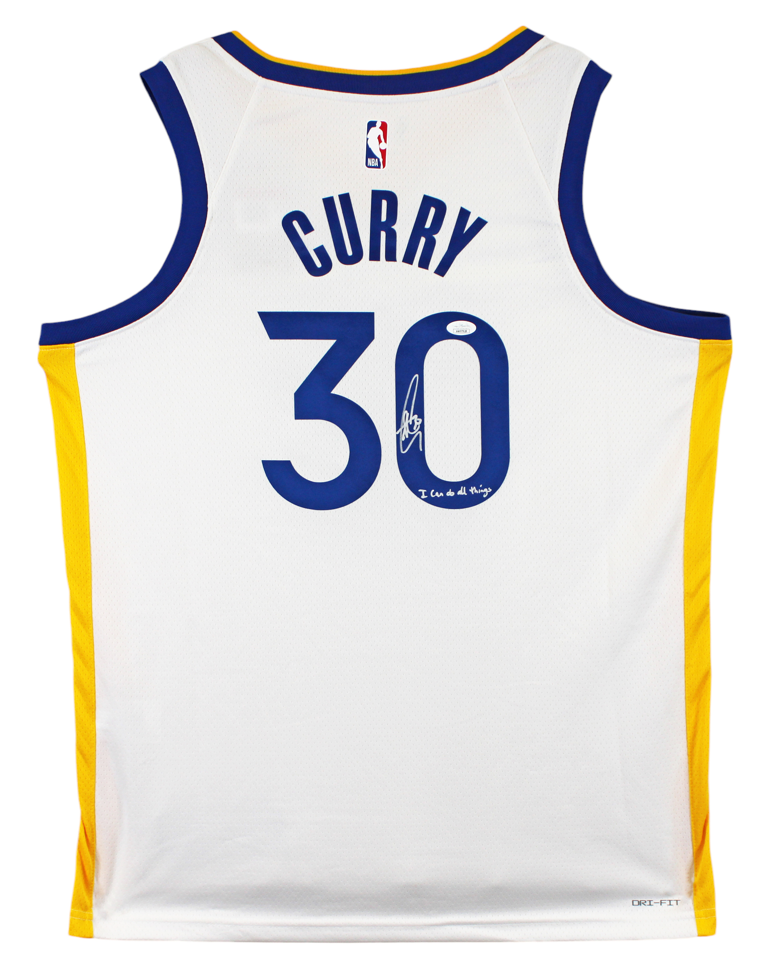 This Autographed White Nike Association Edition Swingman Jersey with the inscription of "I Can Do All Things" has been Personally Signed by Stephen Curry of the Golden State Warriors. This item is 100% Authentic to include a Certificate of Authenticity (COA) / hologram by JSA. We have multiples of this same item. While the photographs are representative of this item, the size, placement and strength of the signature may vary. Each item is hand signed, therefore, each autograph is unique. Multiple sizes available. Reach out for availability.