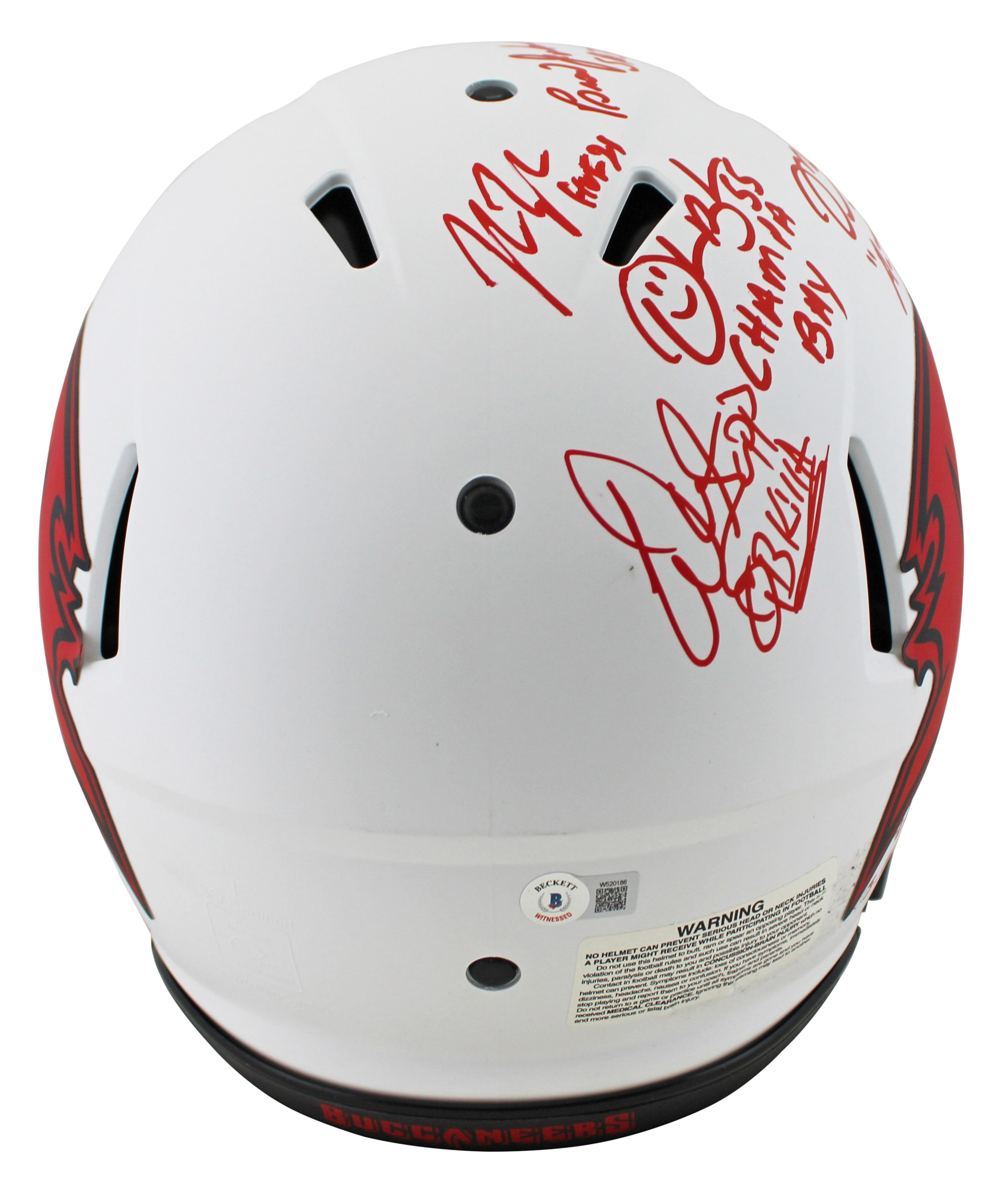 This Autographed Alternate Lunar Riddell Authentic Full Size Speed Proline Helmet with the inscription of "HOF 21 (Lynch), A-Train (Alstott), Champa Bay (Brooks), SB 37 Champs! (Johnson), HOF 23 (Barber), SB XXXVII MVP (Jackson), QB Killa (Sapp)" has been Personally Signed by John Lynch, Warren Sapp, Derrick Brooks, Brad Johnson, Dexter Jackson, Ronde Barber & Mike Alstott of the Tampa Bay Buccaneers. This item is 100% Authentic to include a hologram by Beckett Authentication Services. This item will come with an affixed Beckett Authentication Services (BAS) authentication sticker, which includes a scannable QR code to verify authenticity. Please note that Beckett no longer provides serial-numbered COA cards, and the attached BAS sticker will serve as the complete authentication for this item. This is a BAS Witnessed Protection Program item which means a Beckett Authentication Service representative was present when this item was being signed. We conducted an autograph signing with John Lynch, Warren Sapp, Derrick Brooks, Brad Johnson, Dexter Jackson, Ronde Barber & Mike Alstott where multiples of the same item were signed. While the photographs are representative of this item, the size, placement and strength of the signature may vary. Each item is hand signed, therefore, each autograph is unique. This item can be verified through BAS Witnessed.