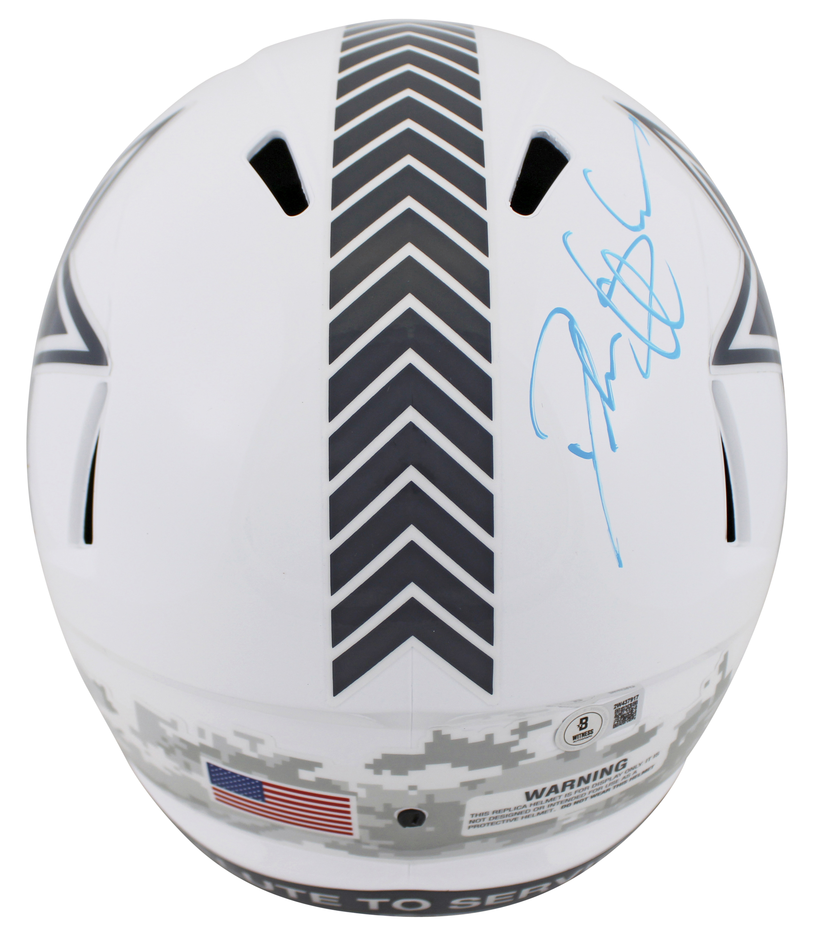 This Autographed Alternate 2024 Salute To Service III Riddell Full Size Speed Rep Helmet W/ Uv Mirrored Back Acrylic Display Case has been Personally Signed by Deion Sanders of the Dallas Cowboys. This item is 100% Authentic to include a hologram by Beckett Authentication Services. This item will come with an affixed Beckett Authentication Services (BAS) authentication sticker, which includes a scannable QR code to verify authenticity. Please note that Beckett no longer provides serial-numbered COA cards, and the attached BAS sticker will serve as the complete authentication for this item. This is a BAS Witnessed Protection Program item which means a Beckett Authentication Service representative was present when this item was being signed. We conducted an autograph signing with Deion Sanders where multiples of the same item were signed. While the photographs are representative of this item, the size, placement and strength of the signature may vary. Each item is hand signed, therefore, each autograph is unique. This item can be verified through BAS Witnessed.