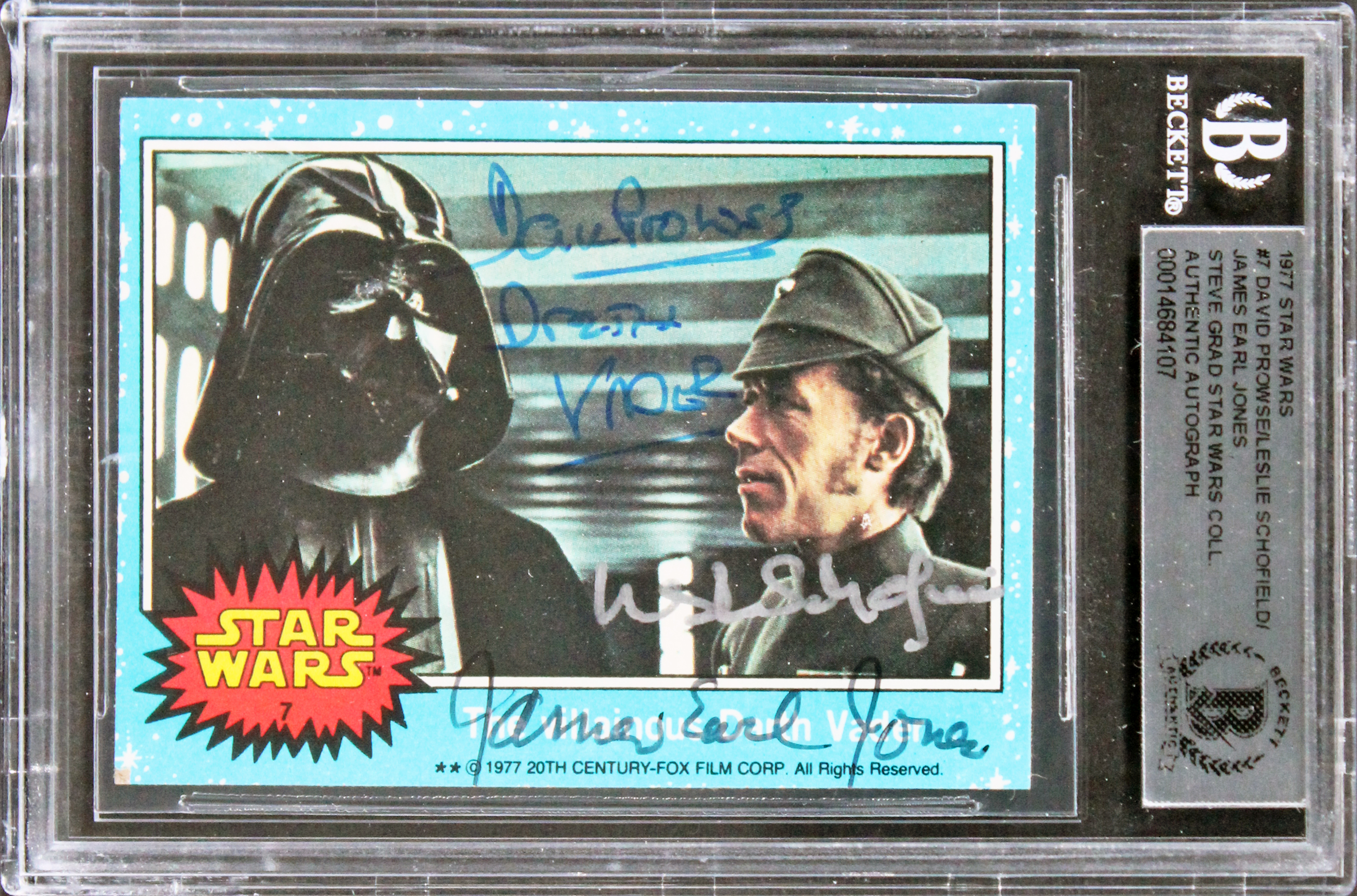 The authenticity can be verified on Beckett Authentication Services website. This Autographed Card with the inscription of "Darth Vader (Prowse)" has been Personally Signed by David Prowse, Leslie Schofield & James Earl Jones of Star Wars. This item is 100% Authentic, it comes slabbed and authenticated by Beckett Authentication Services. The authenticity can be verified on Beckett Authentication Services website. The plastic encapsulation has a small chip in the bottom left.