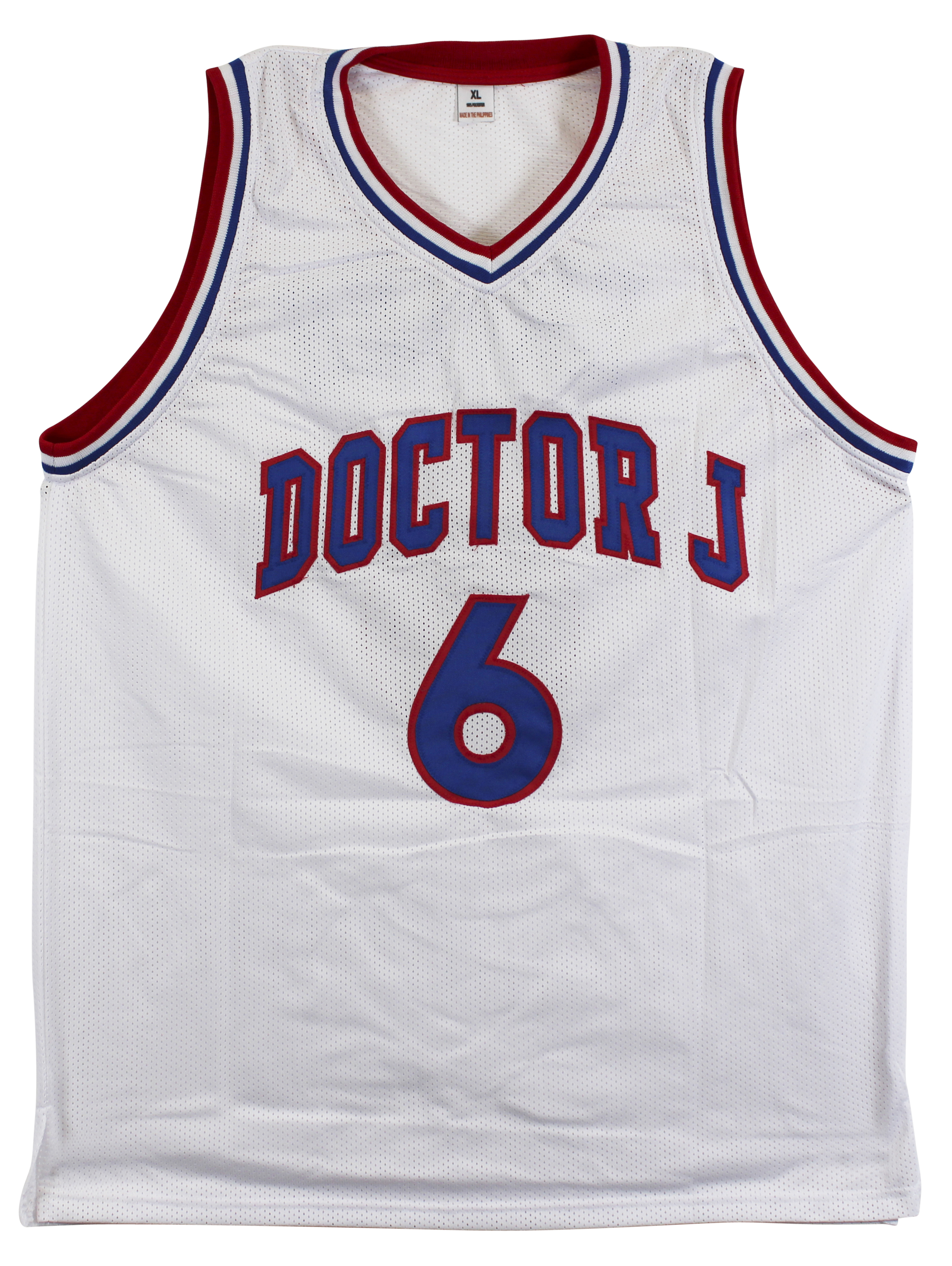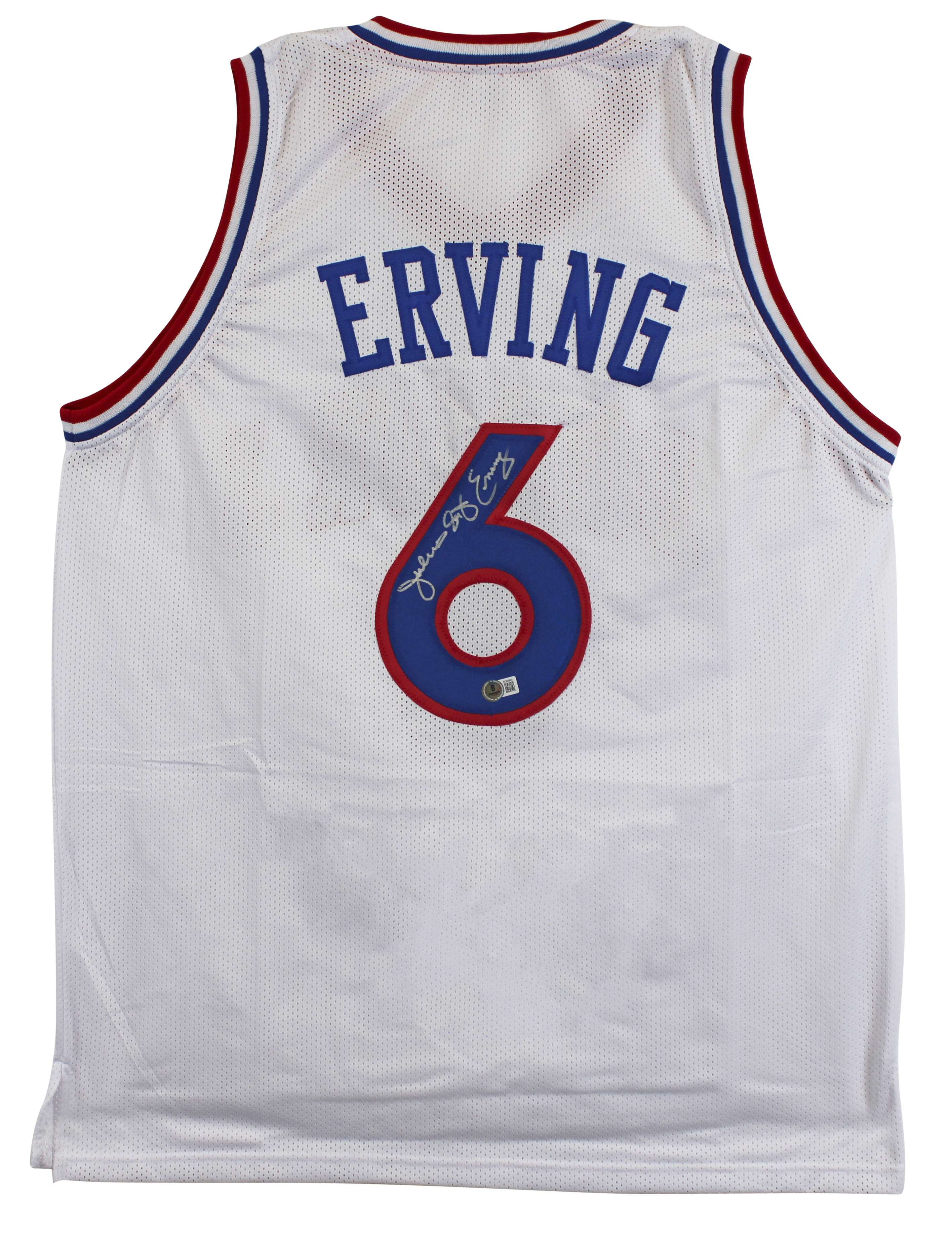 This Autographed White Pro Style Jersey has been Personally Signed by Julius "Dr. J" Erving of the Philadelphia 76ers. This item is 100% Authentic to include a hologram by Beckett Authentication Services. This item will come with an affixed Beckett Authentication Services (BAS) authentication sticker, which includes a scannable QR code to verify authenticity. Please note that Beckett no longer provides serial-numbered COA cards, and the attached BAS sticker will serve as the complete authentication for this item. We conducted an autograph signing with Julius "Dr. J" Erving where multiples of the same item were signed. While the photographs are representative of this item, the size, placement and strength of the signature may vary. Each item is hand signed, therefore, each autograph is unique. This item can be verified through BAS. This is a X-Large sized, non-branded, custom-stitched Jersey.