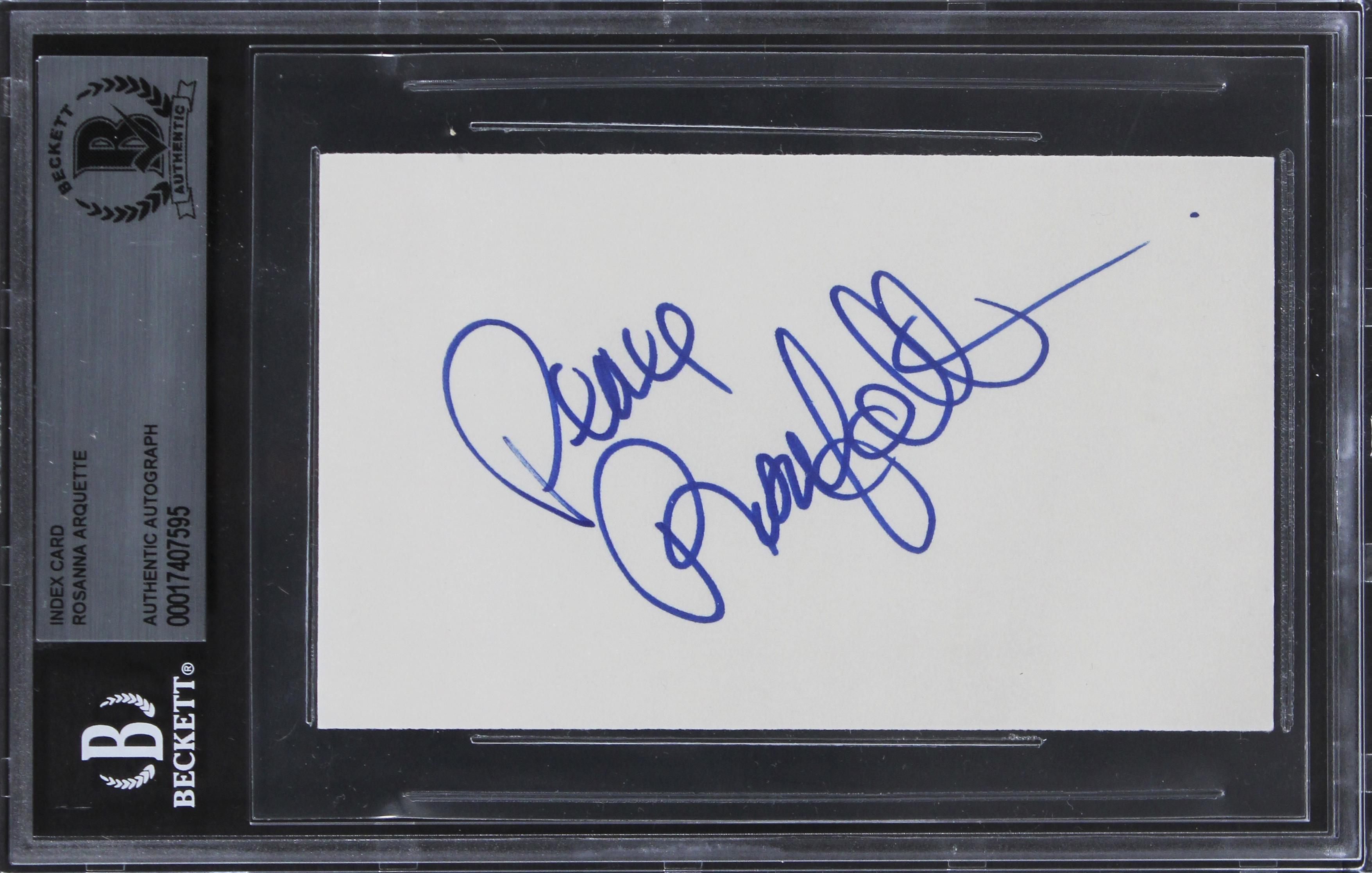 The authenticity can be verified on Beckett Authentication Services website. This Autographed 3x5 Index Card with the inscription of "Peace" has been Personally Signed by Rosanna Arquette of Crash. This item is 100% Authentic, it comes slabbed and authenticated by Beckett Authentication Services. The authenticity can be verified on Beckett Authentication Services website.
