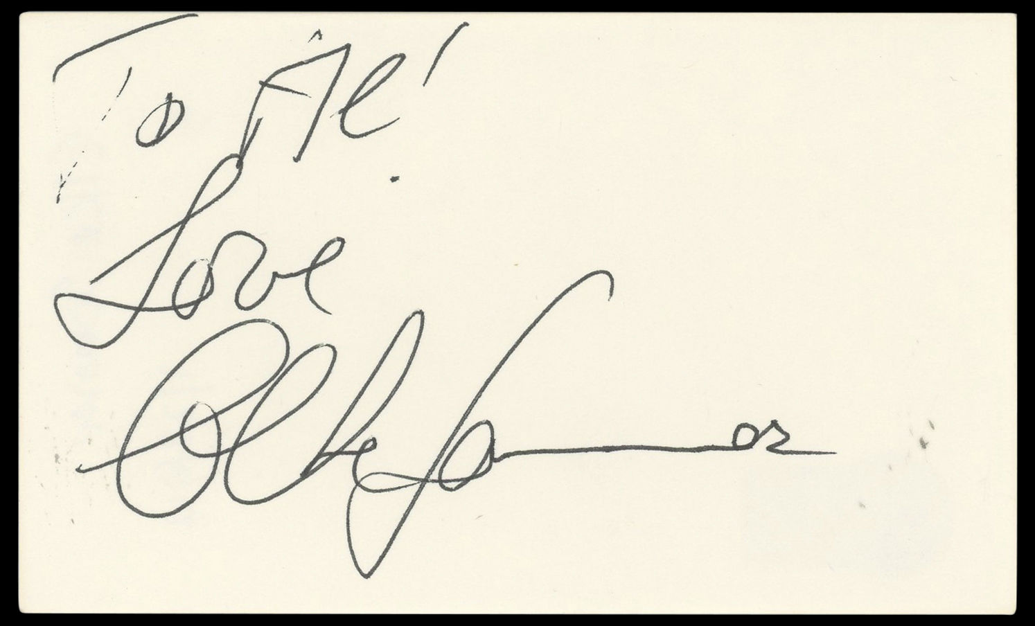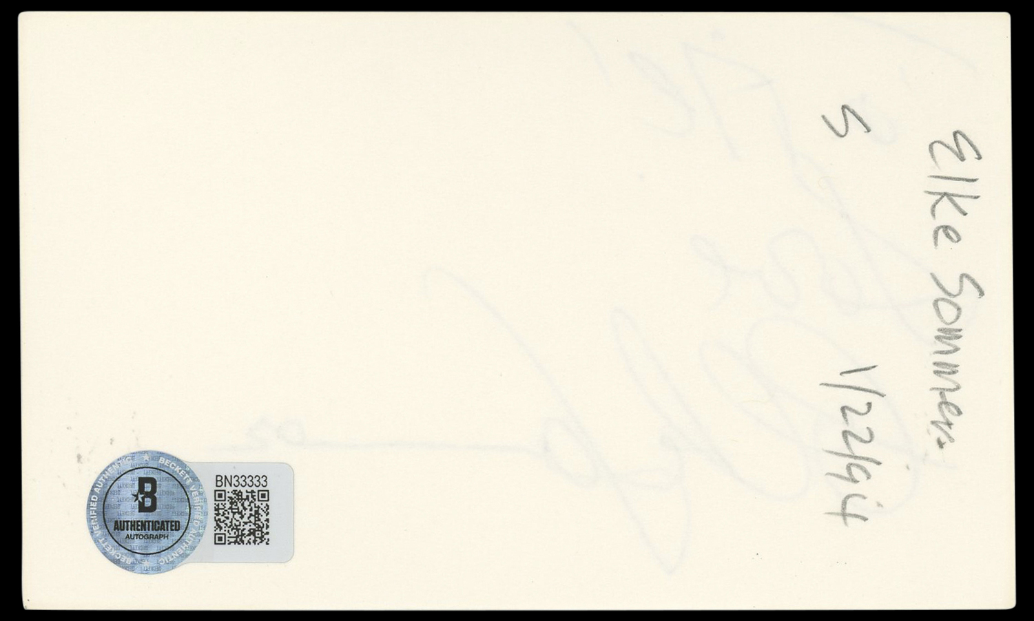 The authenticity can be verified on Beckett Authentication Services website. This Autographed 3x5 Index Card with the inscription of "To Al! Love" has been Personally Signed by Elke Sommer of The Pink Panther A Shot in the Dark. This item is 100% Authentic to include a hologram by Beckett Authentication Services. This item will come with an affixed Beckett Authentication Services (BAS) authentication sticker, which includes a scannable QR code to verify authenticity. Please note that Beckett no longer provides serial-numbered COA cards, and the attached BAS sticker will serve as the complete authentication for this item. The authenticity can be verified on Beckett Authentication Services website.