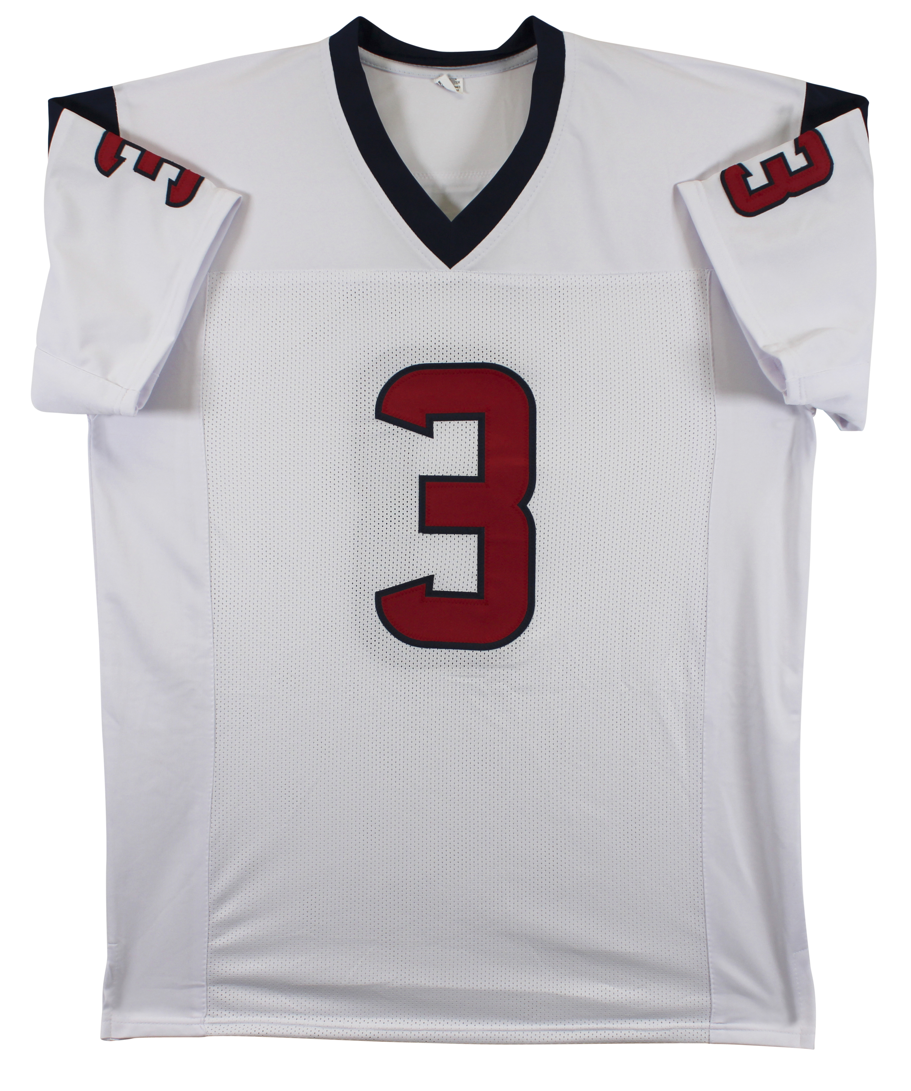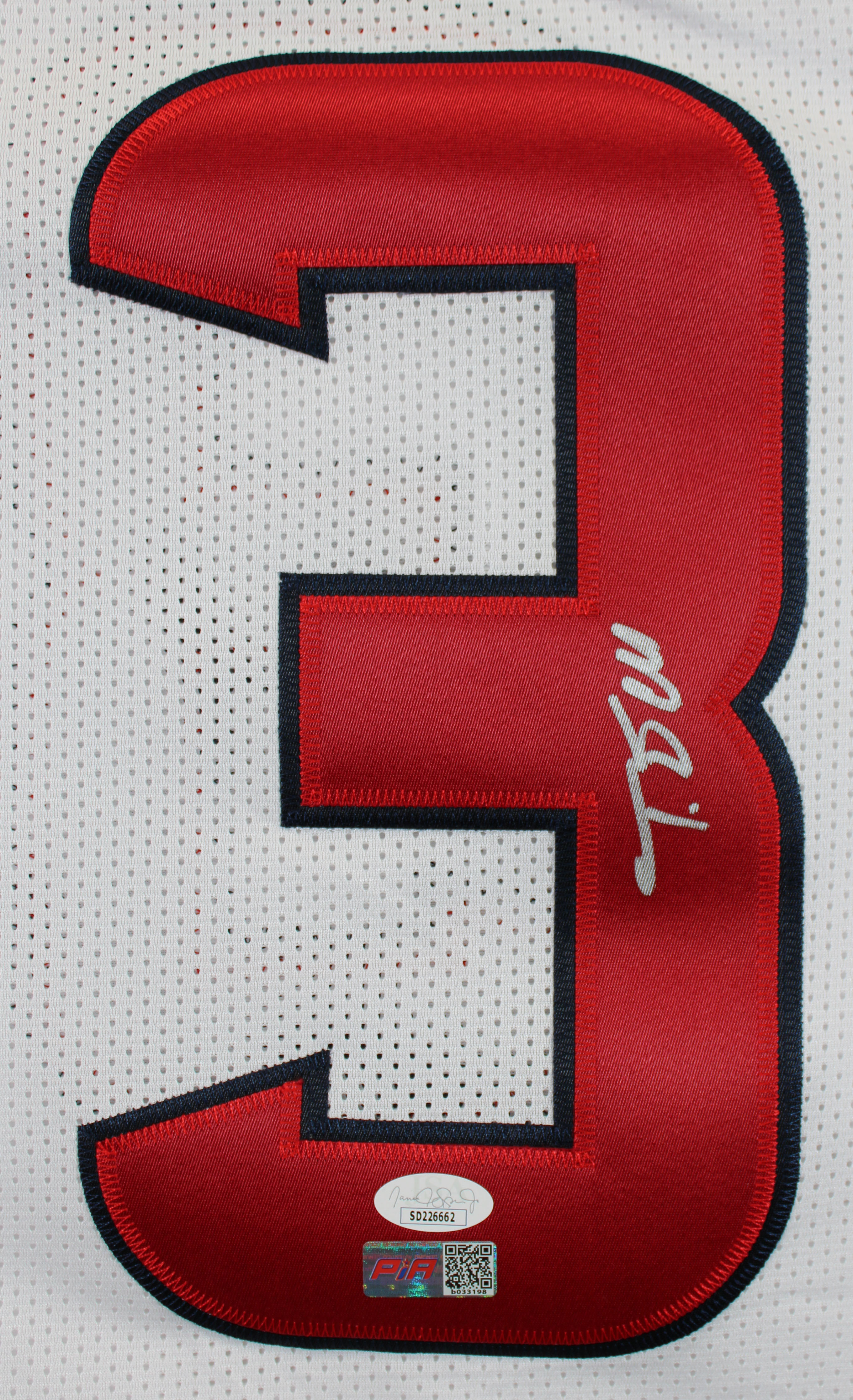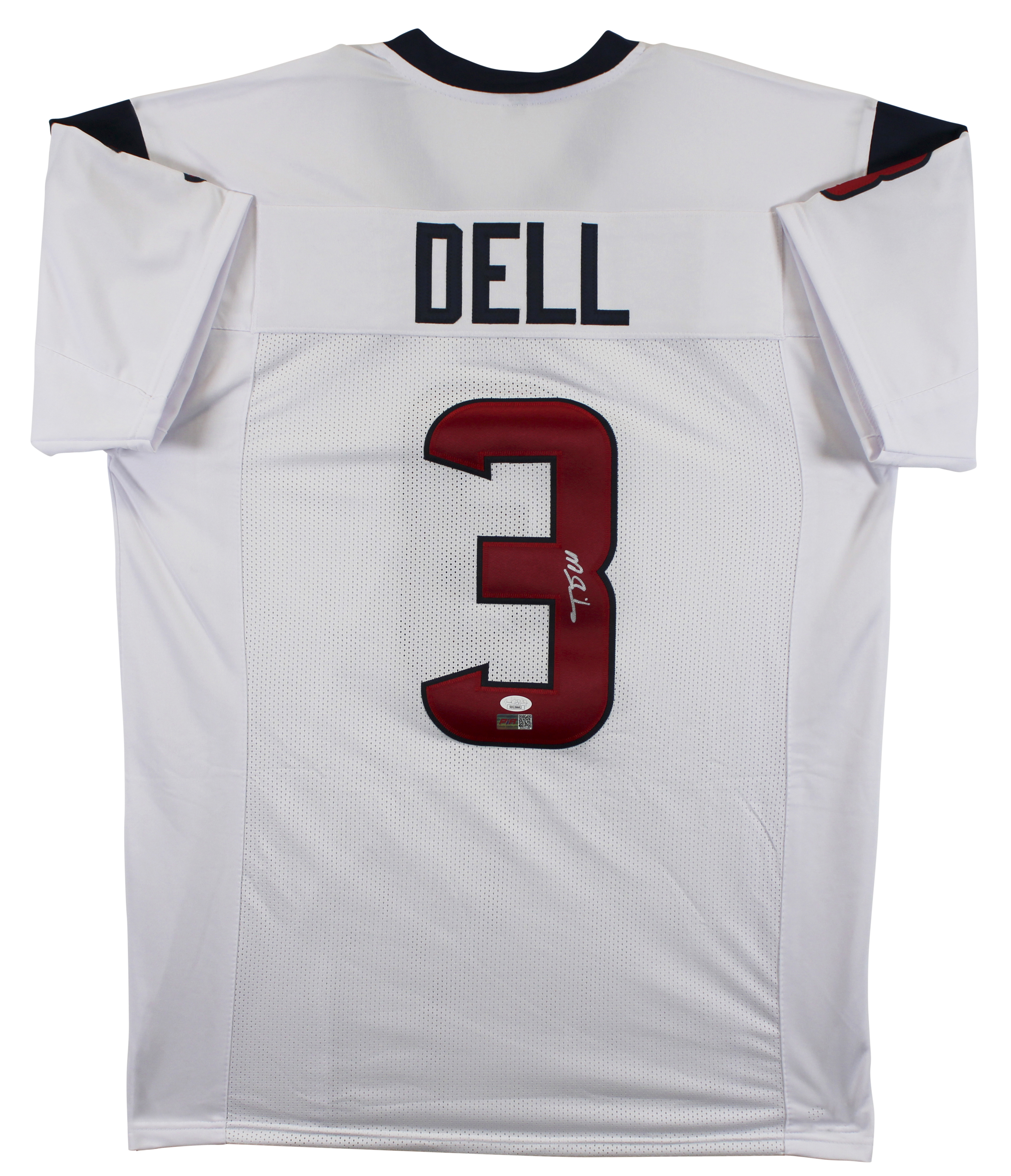 This Autographed White Pro Style Jersey has been Personally Signed by Tank Dell of the Houston Texans. This item is 100% Authentic to include a Certificate of Authenticity (COA) / hologram by JSA. We conducted an autograph signing with Tank Dell where multiples of the same item were signed. While the photographs are representative of this item, the size, placement and strength of the signature may vary. Each item is hand signed, therefore, each autograph is unique. This item can be verified through JSA. This is a X-Large sized, non-branded, custom-stitched Jersey.