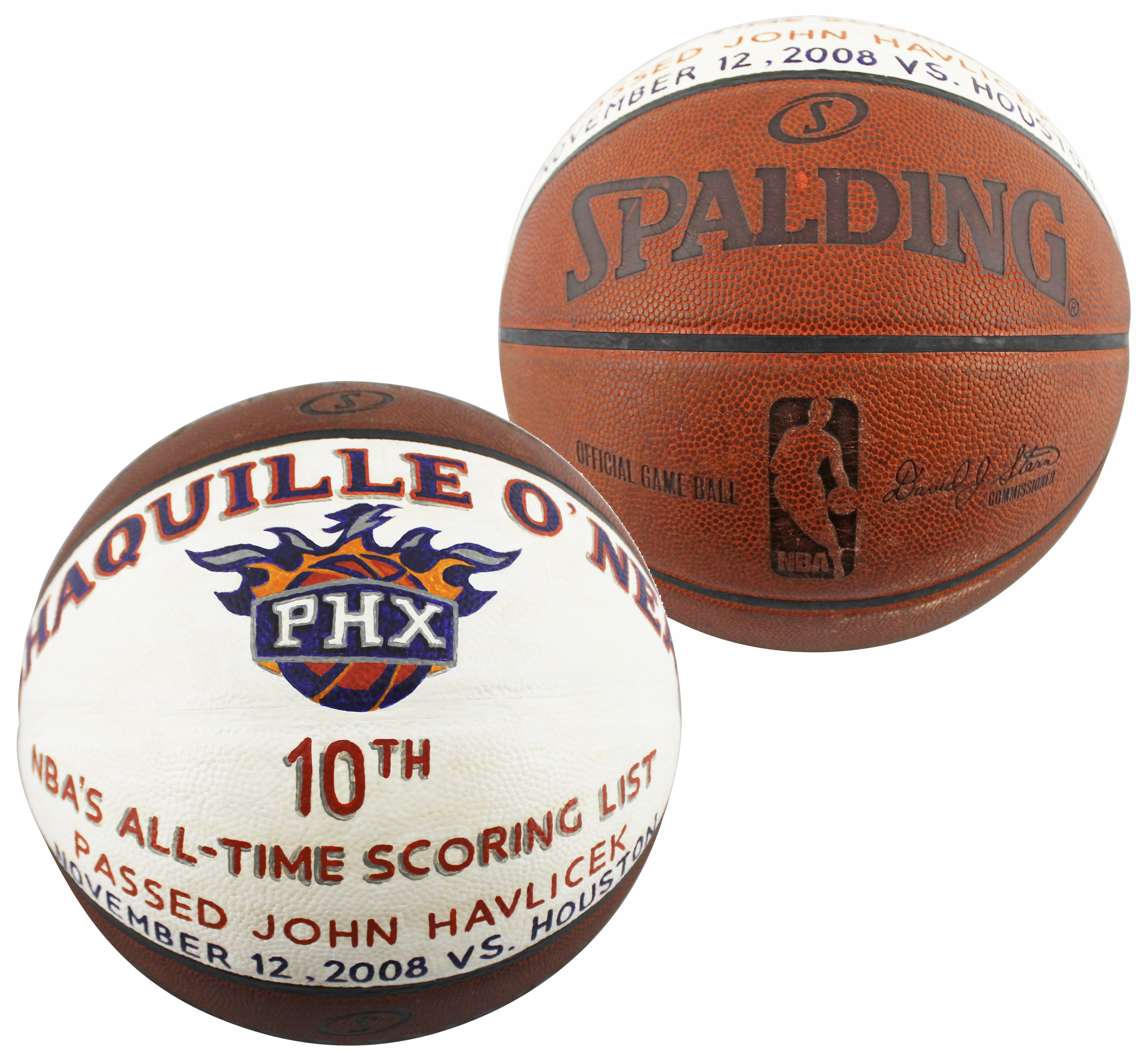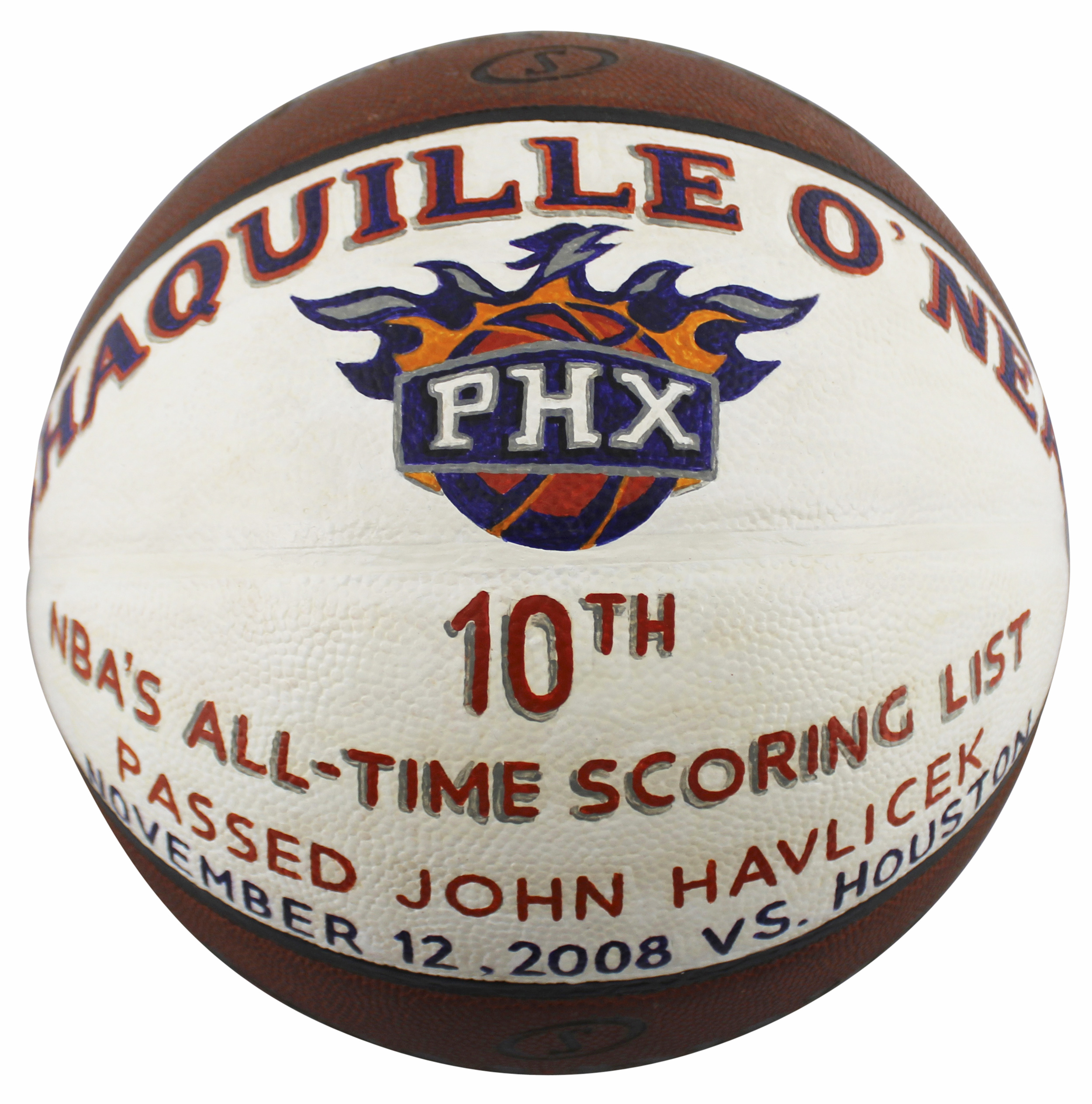 This Game Used September 12th, 2008, Spalding Official NBA Game Ball. This ball was used in the game Shaquille reached 10th on the official NBA Scoring list versus the Houston Rockets! After being gifted the ball from the Houston Rockets, Shaq commissioned an artist to paint the ball to commemorate the achievement. This ball originates from Shaquille���s personal collection and comes with a signed letter of provenance from Shaquille. This ball is not autographed.