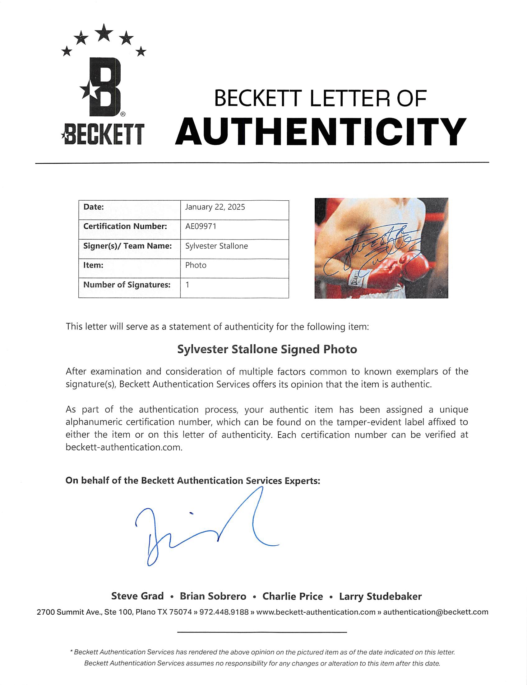 This Autographed Horizontal Boxing 16x20 Photo has been Personally Signed by Sylvester Stallone of Rocky. This item is 100% Authentic to include a Certificate of Authenticity (COA) / hologram by Beckett Authentication Services. We have multiples of this same item. While the photographs are representative of this item, the size, placement and strength of the signature may vary. Each item is hand signed, therefore, each autograph is unique.
