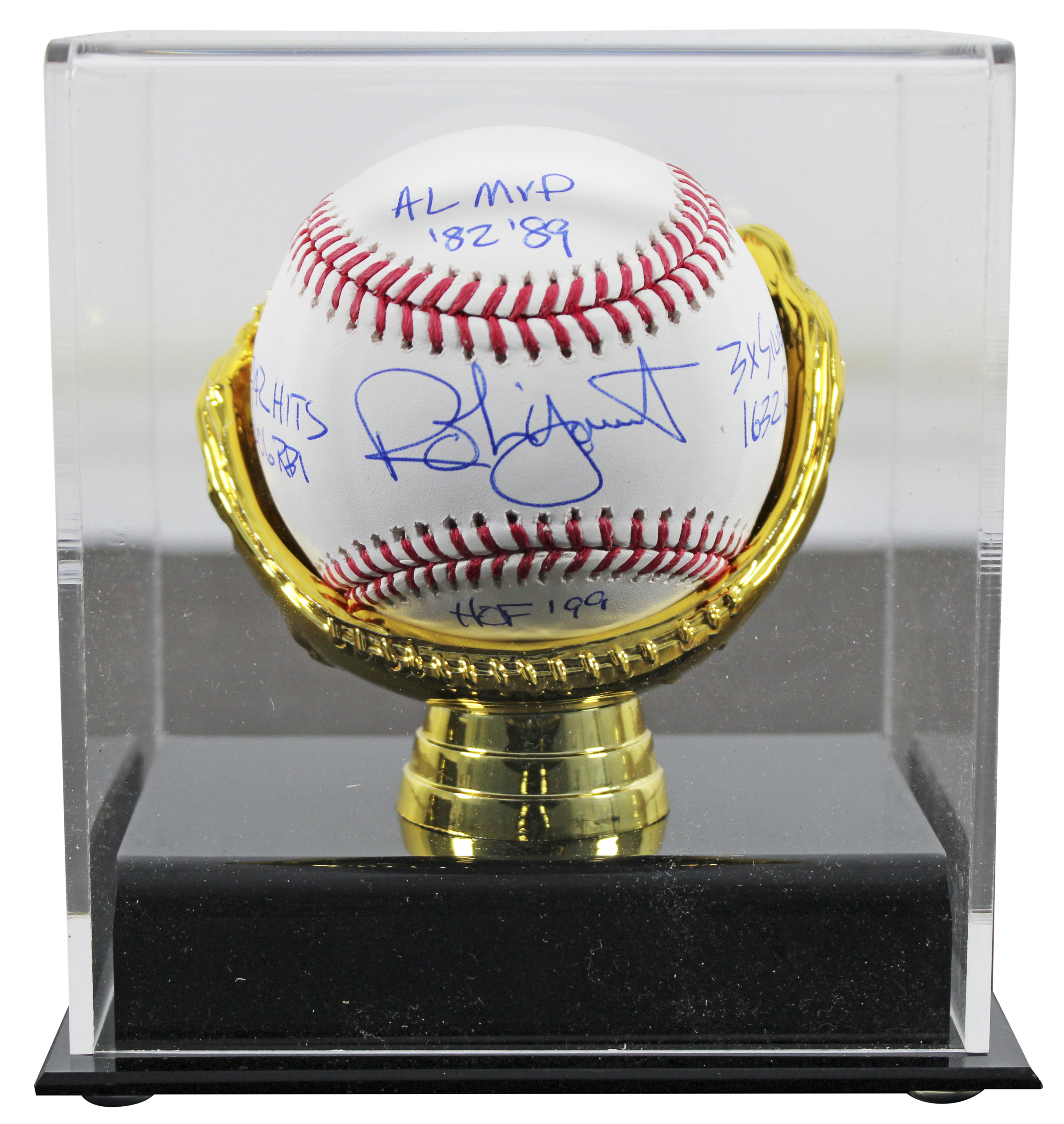 This Autographed OML Baseball Baseball Gold Glove Acrylic Display Case with the inscription of "3142 Hits, 1406 RBI, 1632 Hits, AL MVP '82, '89, 3x Silver Slugger & HOF '99" has been Personally Signed by Robin Yount of the Milwaukee Brewers. This item is 100% Authentic to include a hologram by Beckett Authentication Services. This item may come with the new Beckett Authentication hologram that has a scannable QR code rather than the traditional COA. If you would like to have a COA, you are welcome to reach out to Beckett for a printed certification once you receive your item. This is a BAS Witnessed Protection Program item which means a Beckett Authentication Service representative was present when this item was being signed. We conducted an autograph signing with Robin Yount where multiples of the same item were signed. While the photographs are representative of this item, the size, placement and strength of the signature may vary. Each item is hand signed, therefore, each autograph is unique. This item can be verified through BAS Witnessed.