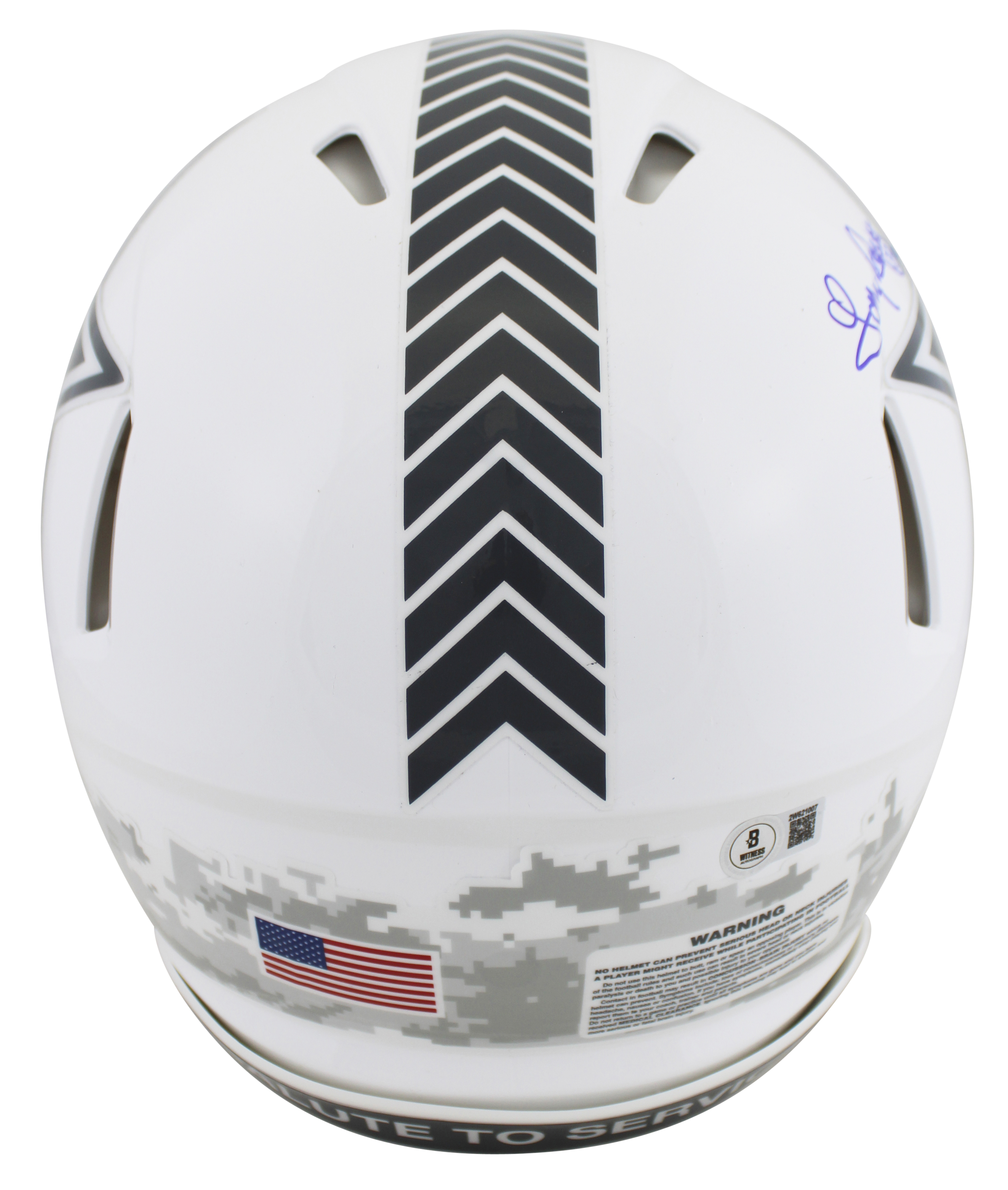 This Autographed Alternate 2024 Salute To Service III Riddell Authentic Full Size Speed Proline Helmet has been Personally Signed by Tony Dorsett of the Dallas Cowboys. This item is 100% Authentic to include a hologram by Beckett Authentication Services. This item will come with an affixed Beckett Authentication Services (BAS) authentication sticker, which includes a scannable QR code to verify authenticity. Please note that Beckett no longer provides serial-numbered COA cards, and the attached BAS sticker will serve as the complete authentication for this item. This is a BAS Witnessed Protection Program item which means a Beckett Authentication Service representative was present when this item was being signed. We conducted an autograph signing with Tony Dorsett where multiples of the same item were signed. While the photographs are representative of this item, the size, placement and strength of the signature may vary. Each item is hand signed, therefore, each autograph is unique. This item can be verified through BAS Witnessed.
