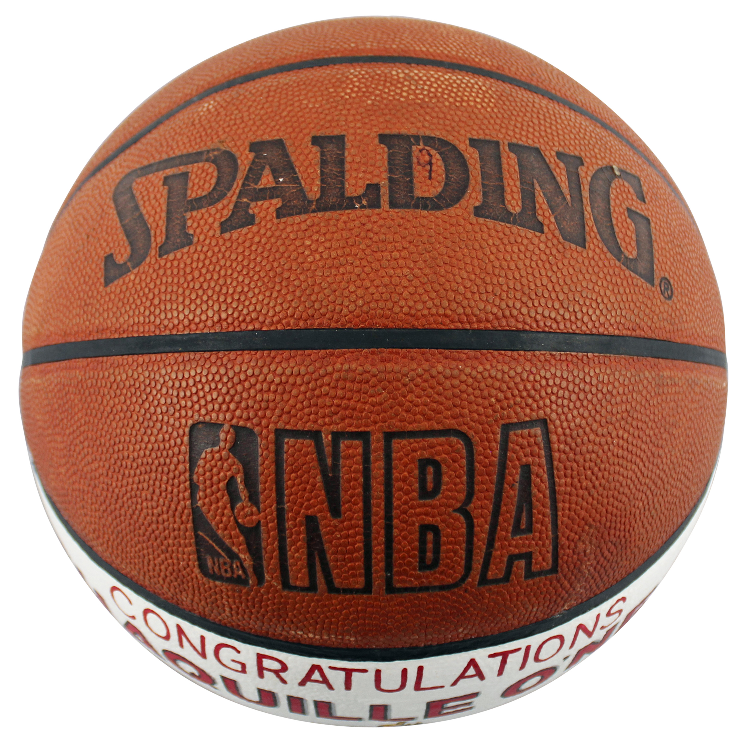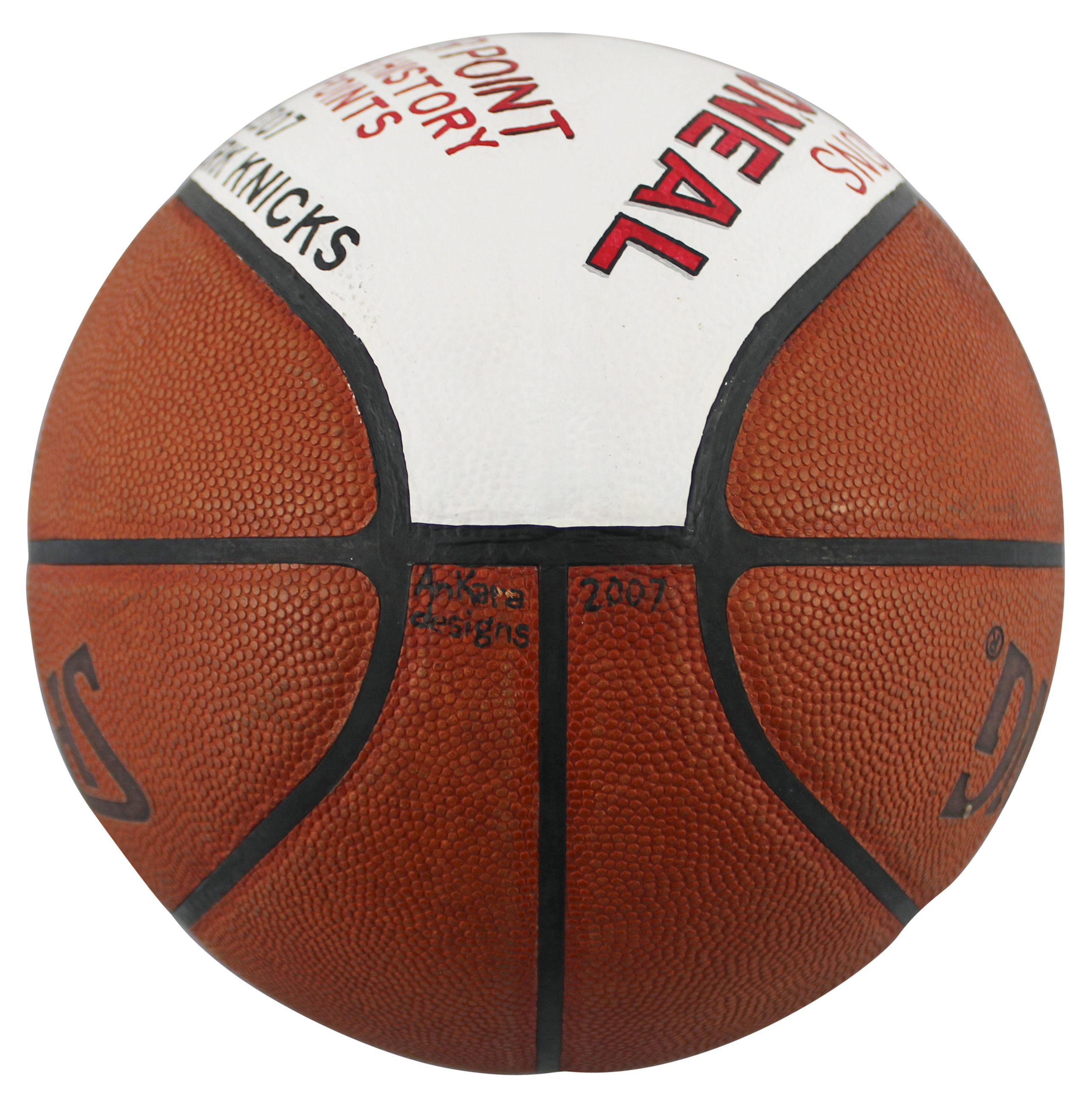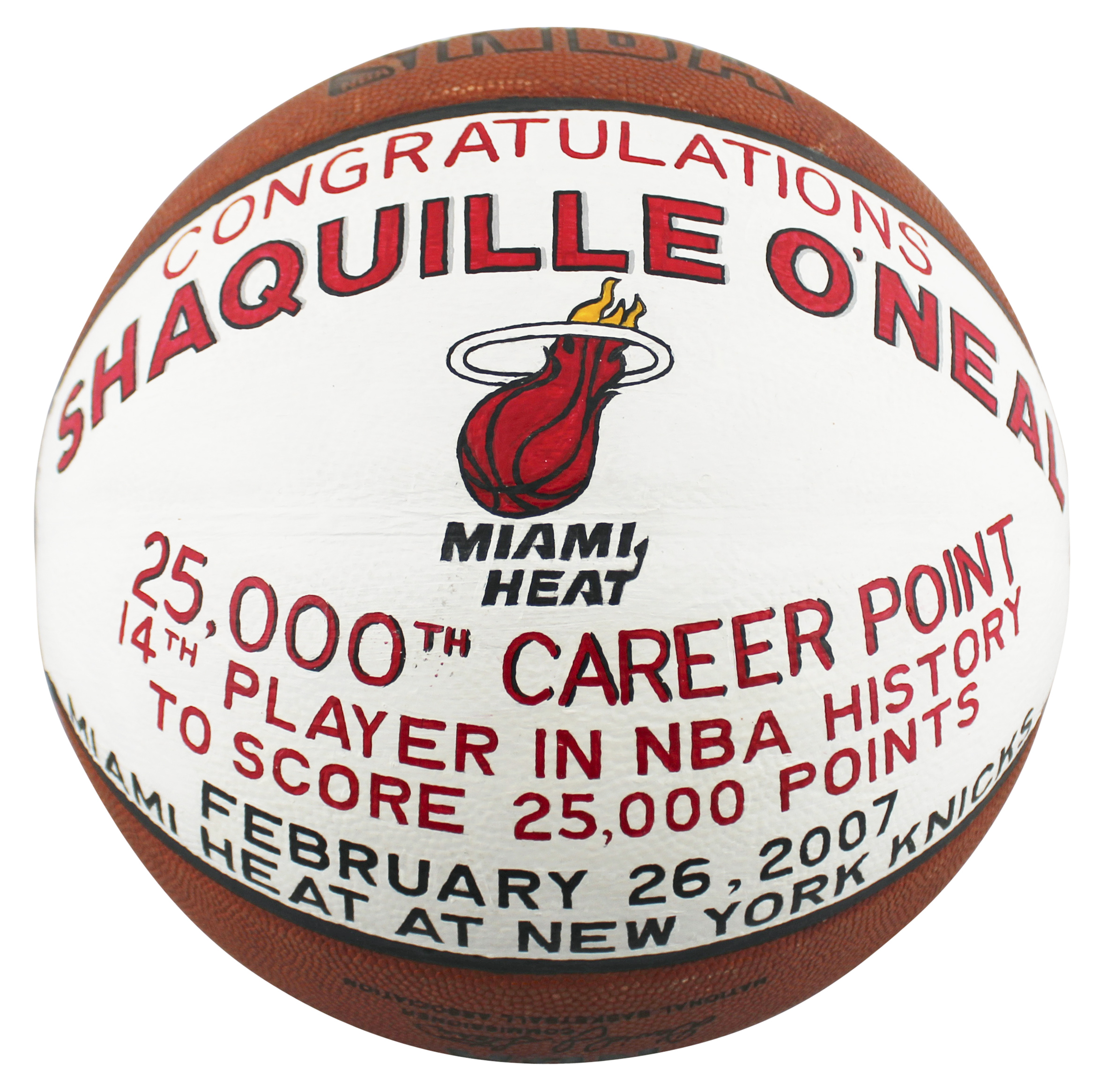 This Game Used February 26th, 2007, Spalding Official NBA Game Ball. This ball was used in the game Shaquille reached 25,000 Career Points versus the New York Knicks! After being gifted the ball from the New York Knicks, Shaq commissioned an artist to paint the ball to commemorate the achievement. This ball originates from Shaquille���s personal collection and comes with a signed letter of provenance from Shaquille. This ball is not autographed.