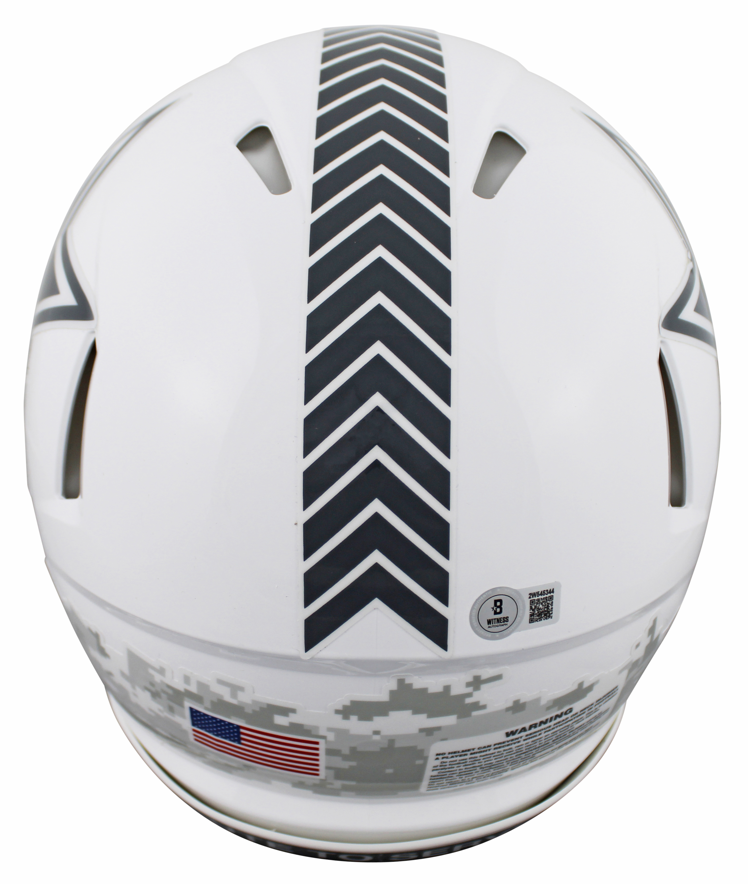 This Autographed Alternate 2024 Salute To Service III Riddell Full Size Speed Proline Helmet W/ Uv Mirrored Back Acrylic Display Case with the inscription of "HOF 85" has been Personally Signed by Roger Staubach of the Dallas Cowboys. This item is 100% Authentic to include a hologram by Beckett Authentication Services. This item will come with an affixed Beckett Authentication Services (BAS) authentication sticker, which includes a scannable QR code to verify authenticity. Please note that Beckett no longer provides serial-numbered COA cards, and the attached BAS sticker will serve as the complete authentication for this item. This is a BAS Witnessed Protection Program item which means a Beckett Authentication Service representative was present when this item was being signed. We conducted an autograph signing with Roger Staubach where multiples of the same item were signed. While the photographs are representative of this item, the size, placement and strength of the signature may vary. Each item is hand signed, therefore, each autograph is unique. This item can be verified through BAS Witnessed.