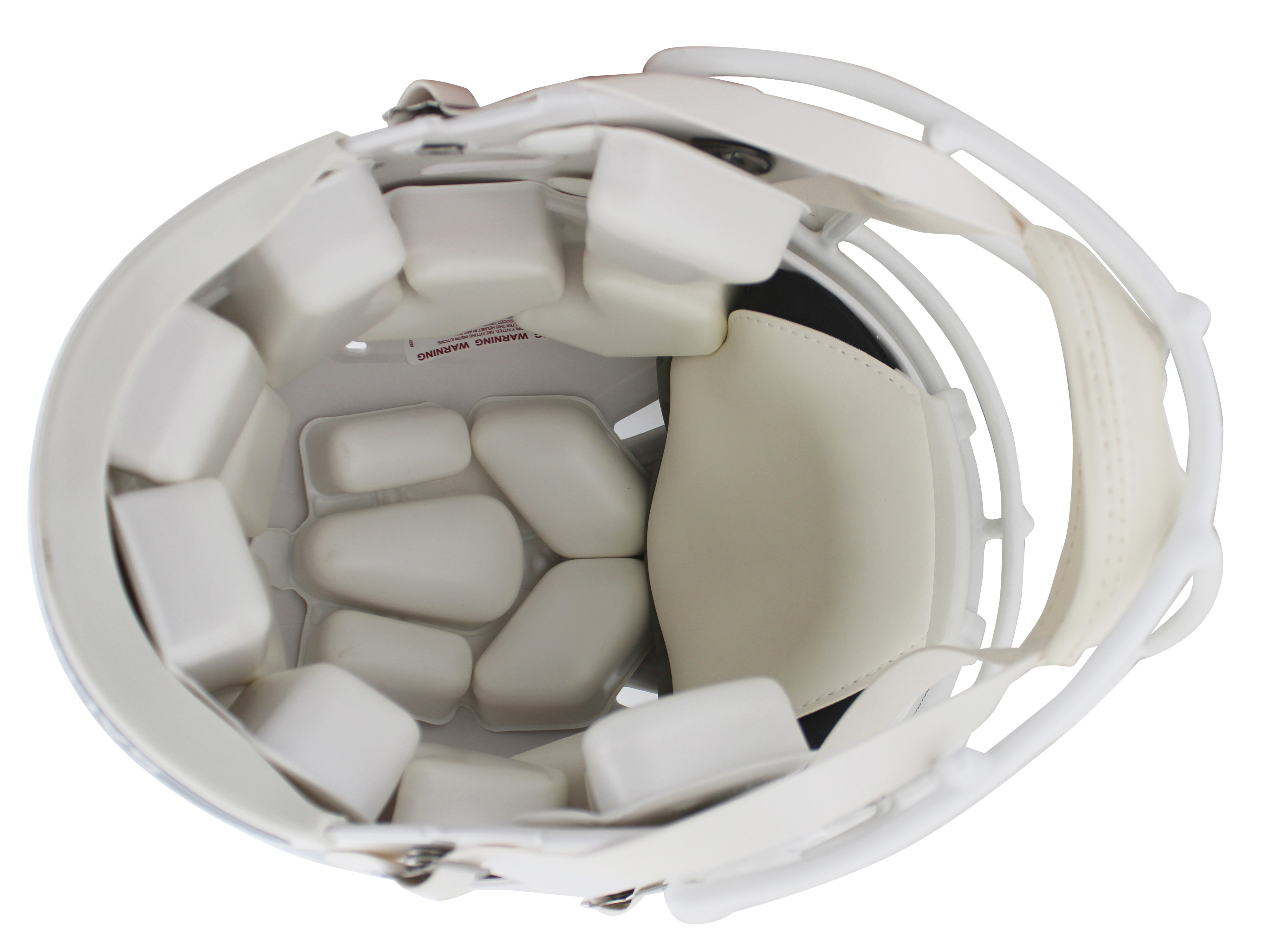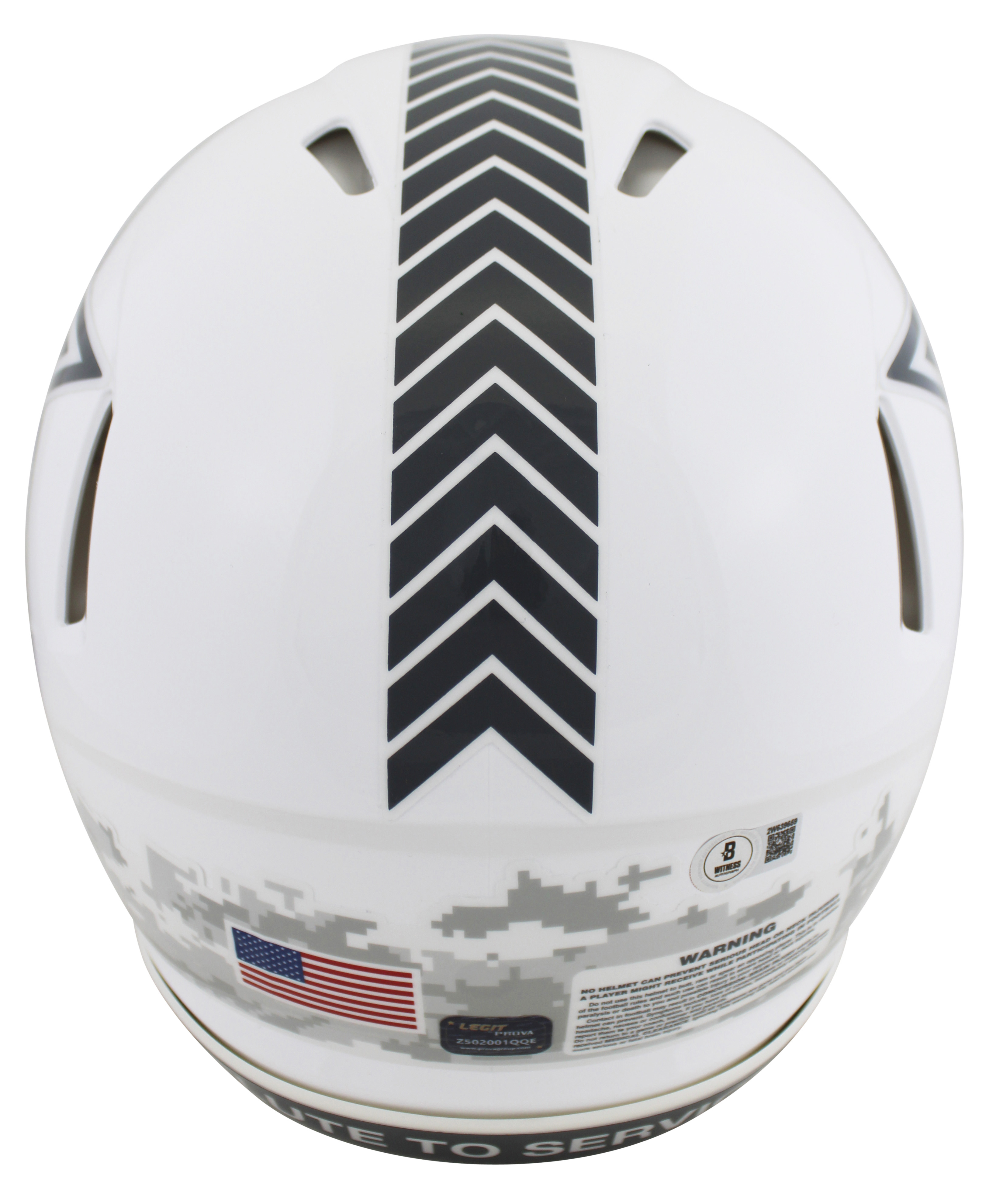 This Autographed Alternate 2024 Salute To Service III Riddell Authentic Full Size Speed Proline Helmet has been Personally Signed by Emmitt Smith of the Dallas Cowboys. This item is 100% Authentic to include a hologram by Beckett Authentication Services. This item will come with an affixed Beckett Authentication Services (BAS) authentication sticker, which includes a scannable QR code to verify authenticity. Please note that Beckett no longer provides serial-numbered COA cards, and the attached BAS sticker will serve as the complete authentication for this item. This is a BAS Witnessed Protection Program item which means a Beckett Authentication Service representative was present when this item was being signed. We conducted an autograph signing with Emmitt Smith where multiples of the same item were signed. While the photographs are representative of this item, the size, placement and strength of the signature may vary. Each item is hand signed, therefore, each autograph is unique. This item can be verified through BAS Witnessed.