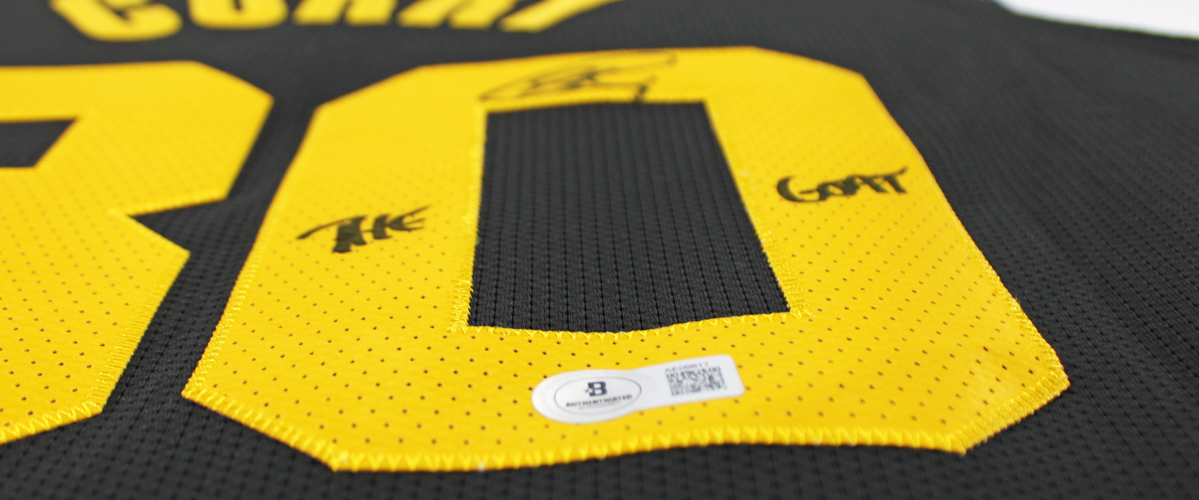 This Autographed Black Nike 2021 City Edition Authentic Jersey with the inscription of "The Goat" has been Personally Signed by Stephen Curry of the Golden State Warriors. This item is 100% Authentic to include a hologram by Beckett Authentication Services. This item will come with an affixed Beckett Authentication Services (BAS) authentication sticker, which includes a scannable QR code to verify authenticity. Please note that Beckett no longer provides serial-numbered COA cards, and the attached BAS sticker will serve as the complete authentication for this item. We have multiples of this same item. While the photographs are representative of this item, the size, placement and strength of the signature may vary. Each item is hand signed, therefore, each autograph is unique. Multiple sizes available. Reach out for availability.
