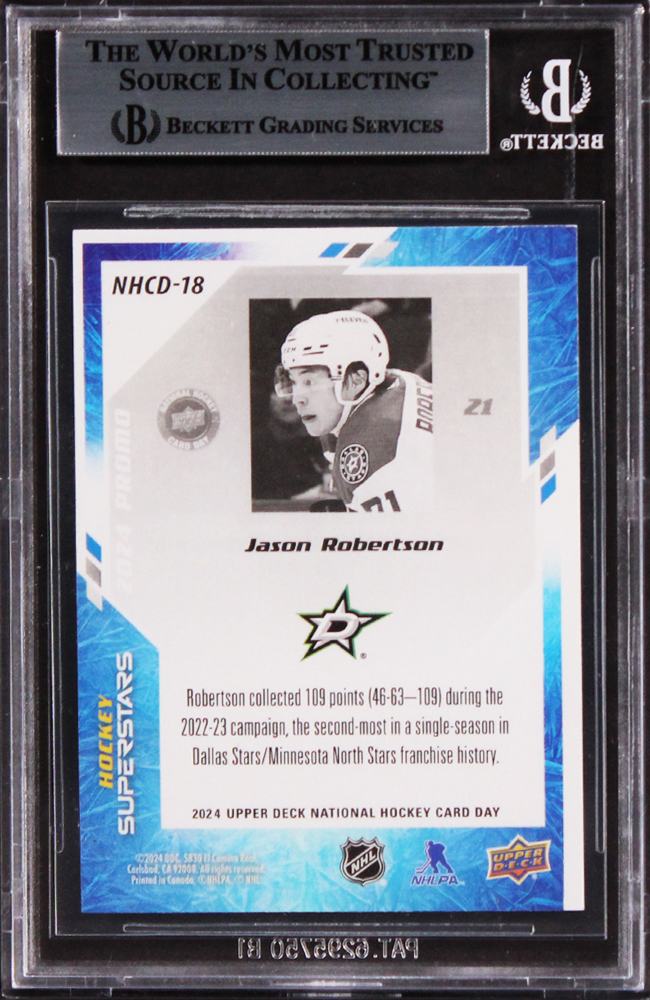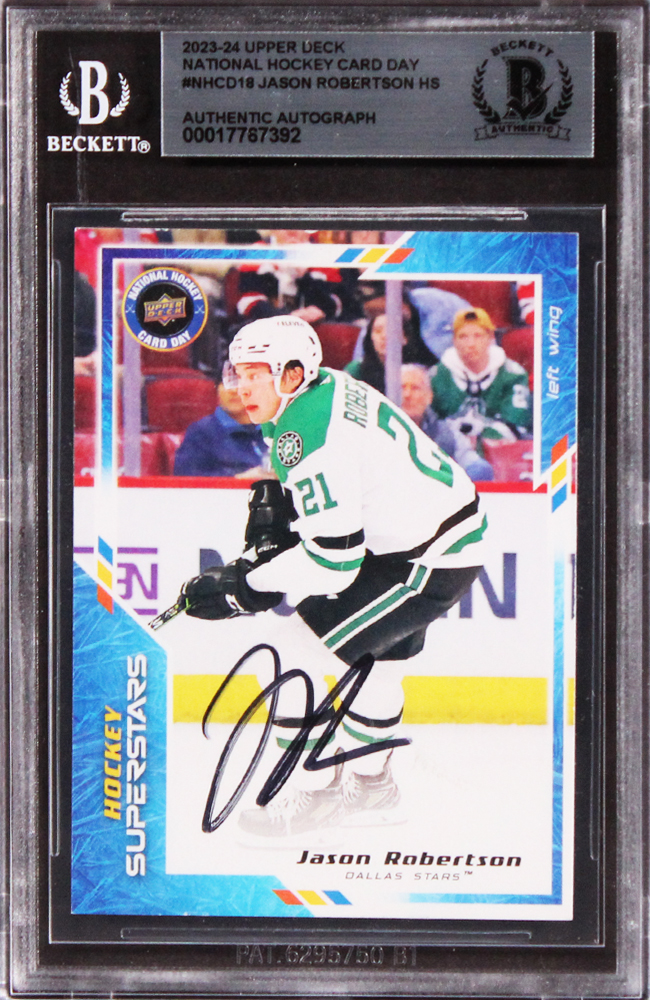 This Autographed 2023 Upper Deck National Hockey Card Day #NHCD18 Card has been Personally Signed by Jason Robertson of the Dallas Stars. This item is 100% Authentic, it comes slabbed and authenticated by Beckett Authentication Services. The authenticity can be verified on Beckett Authentication Services website.