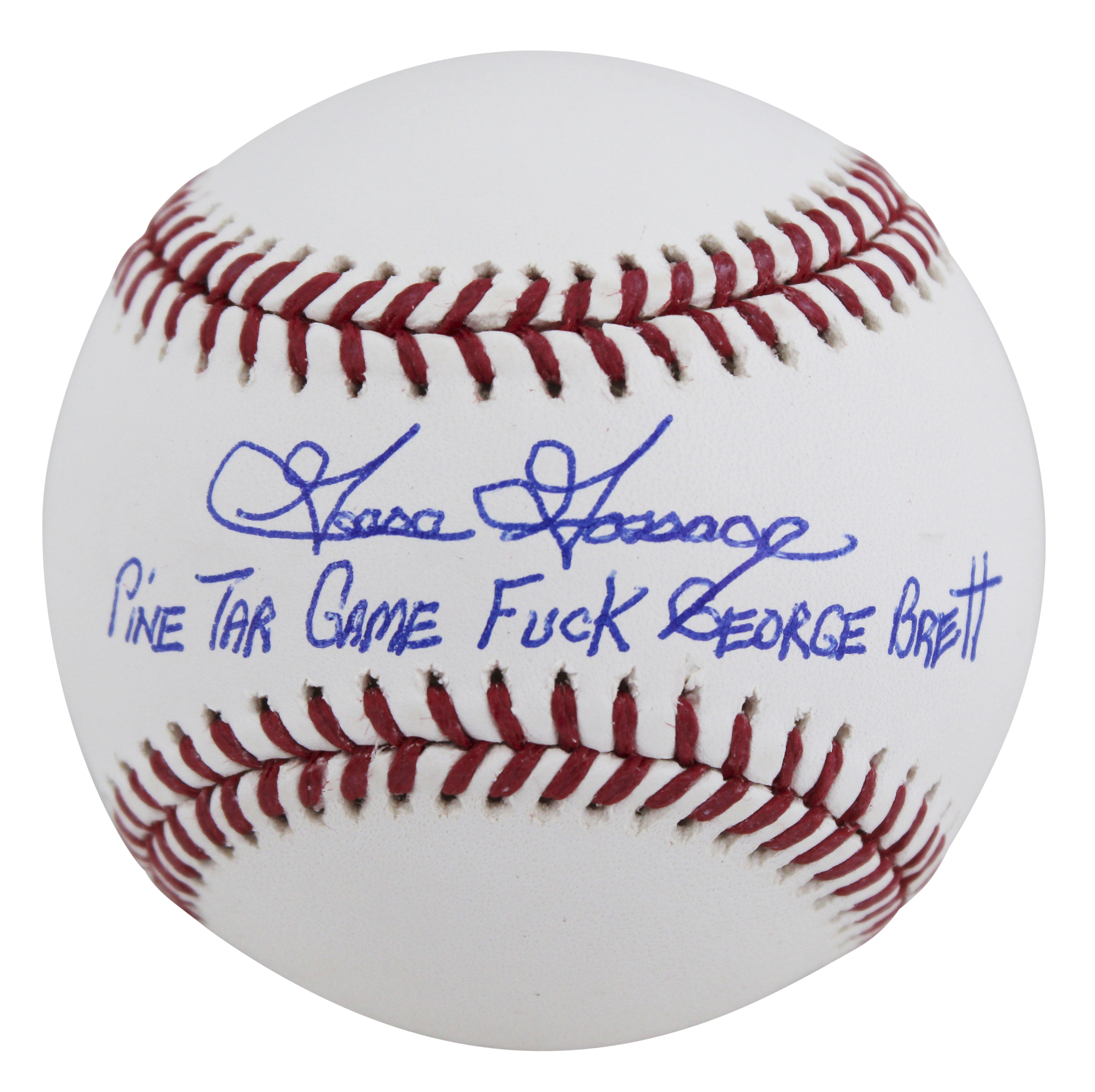 This Autographed OML Baseball Baseball Gold Glove Acrylic Display Case with the inscription of "Pine Tar Game F*** George Brett" has been Personally Signed by Goose Gossage of the New York Yankees. This item is 100% Authentic to include a hologram by Beckett Authentication Services. This item will come with an affixed Beckett Authentication Services (BAS) authentication sticker, which includes a scannable QR code to verify authenticity. Please note that Beckett no longer provides serial-numbered COA cards, and the attached BAS sticker will serve as the complete authentication for this item. This is a BAS Witnessed Protection Program item which means a Beckett Authentication Service representative was present when this item was being signed. We conducted an autograph signing with Goose Gossage where multiples of the same item were signed. While the photographs are representative of this item, the size, placement and strength of the signature may vary. Each item is hand signed, therefore, each autograph is unique. This item can be verified through BAS Witnessed.