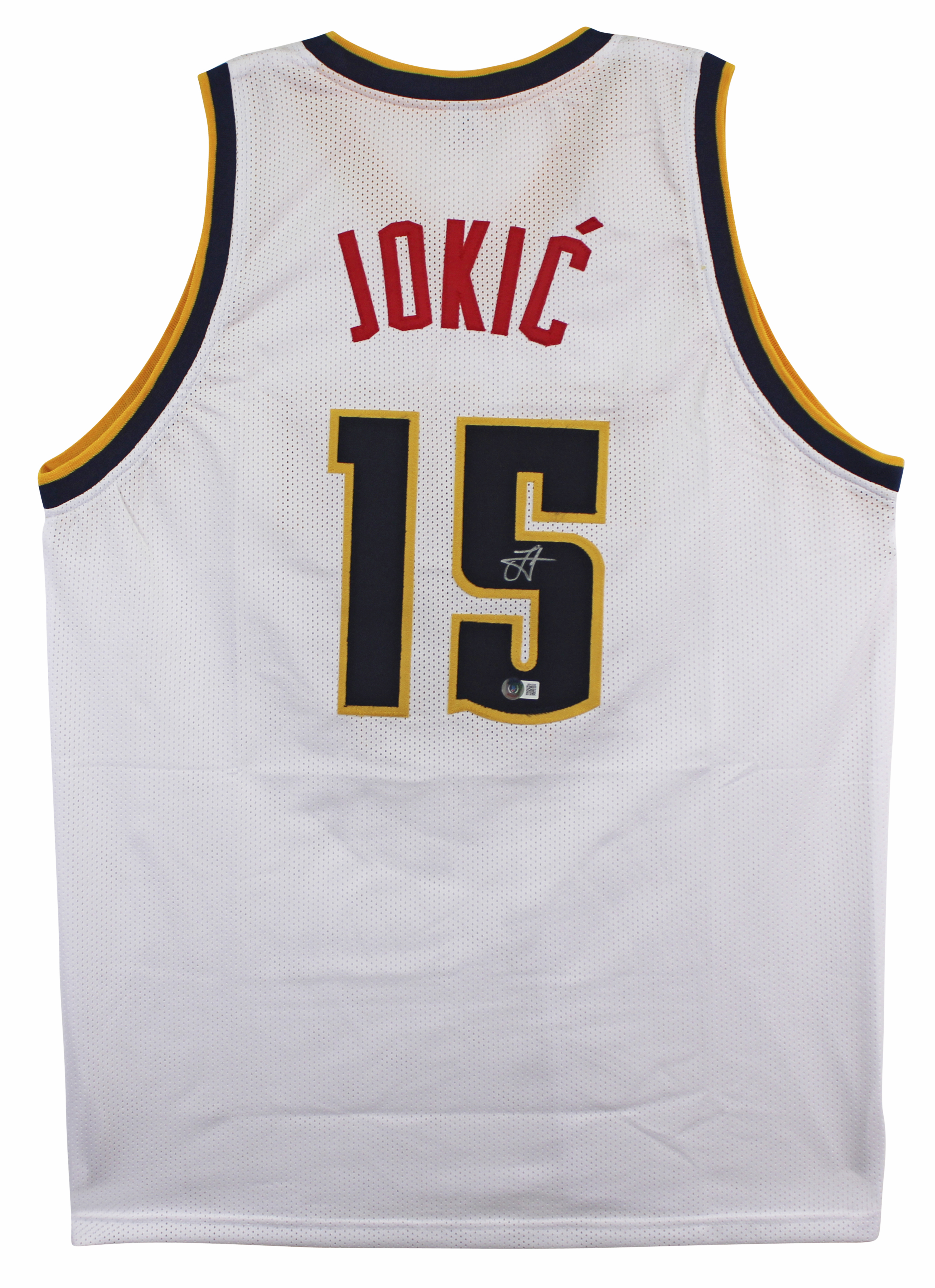This Autographed White Pro Style Jersey has been Personally Signed by Nikola Jokic of the Denver Nuggets. This item is 100% Authentic to include a hologram by Beckett Authentication Services. This item will come with an affixed Beckett Authentication Services (BAS) authentication sticker, which includes a scannable QR code to verify authenticity. Please note that Beckett no longer provides serial-numbered COA cards, and the attached BAS sticker will serve as the complete authentication for this item. This is a BAS Witnessed Protection Program item which means a Beckett Authentication Service representative was present when this item was being signed. We have multiples of this same item. While the photographs are representative of this item, the size, placement and strength of the signature may vary. Each item is hand signed, therefore, each autograph is unique. This is a X-Large sized, non-branded, custom-stitched Jersey.