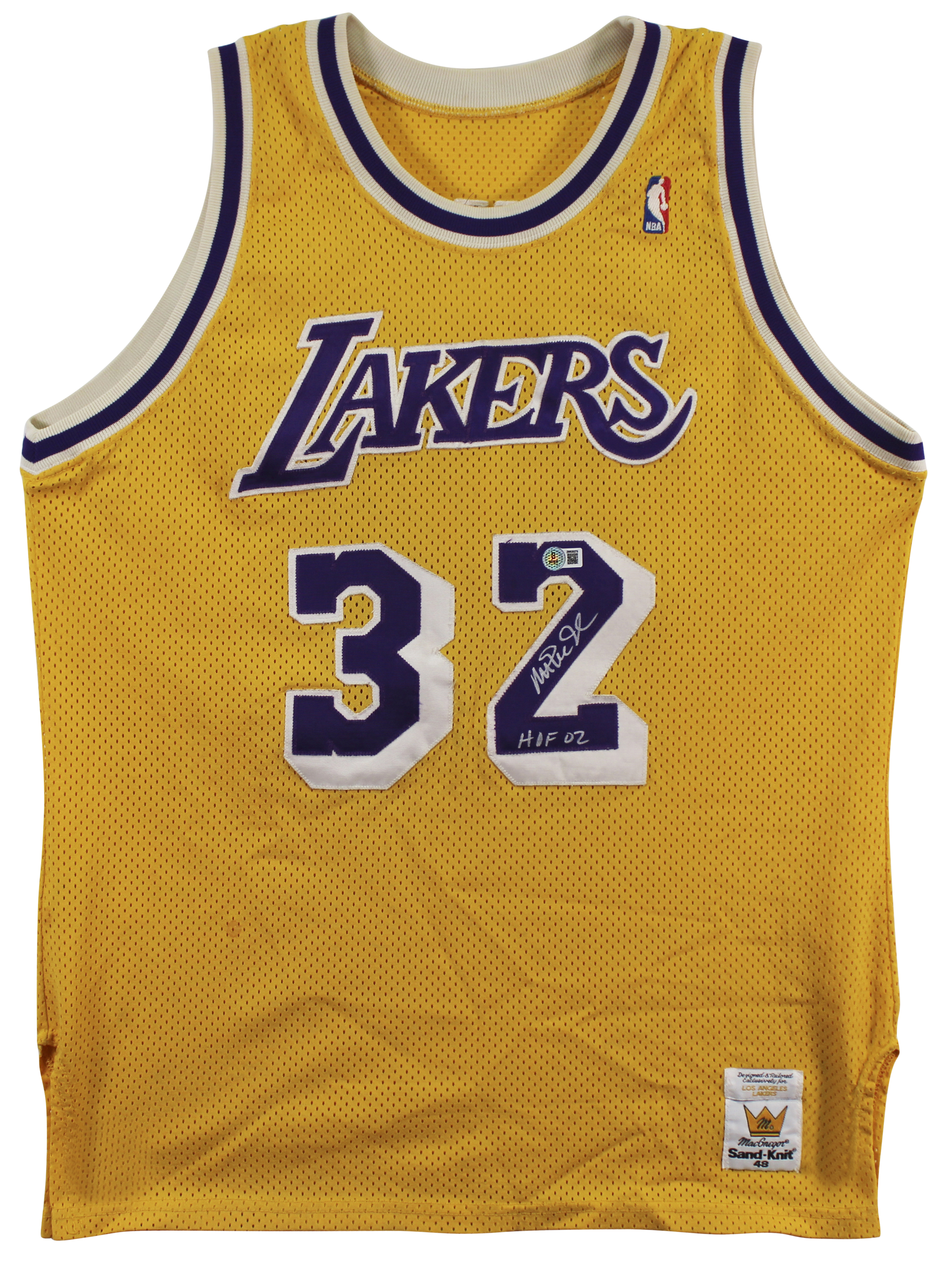 This Autographed Yellow Vintage MacGregor Sand-Knit Jersey with the inscription of "HOF 02" has been Personally Signed by Magic Johnson of the Los Angeles Lakers. This item is 100% Authentic to include a Certificate of Authenticity (COA) / hologram by Beckett Authentication Services. This is a BAS Witnessed Protection Program item which means a Beckett Authentication Service representative was present when this item was being signed. The authenticity can be verified on Beckett Authentication Services website. This is a X-Large sized Jersey.