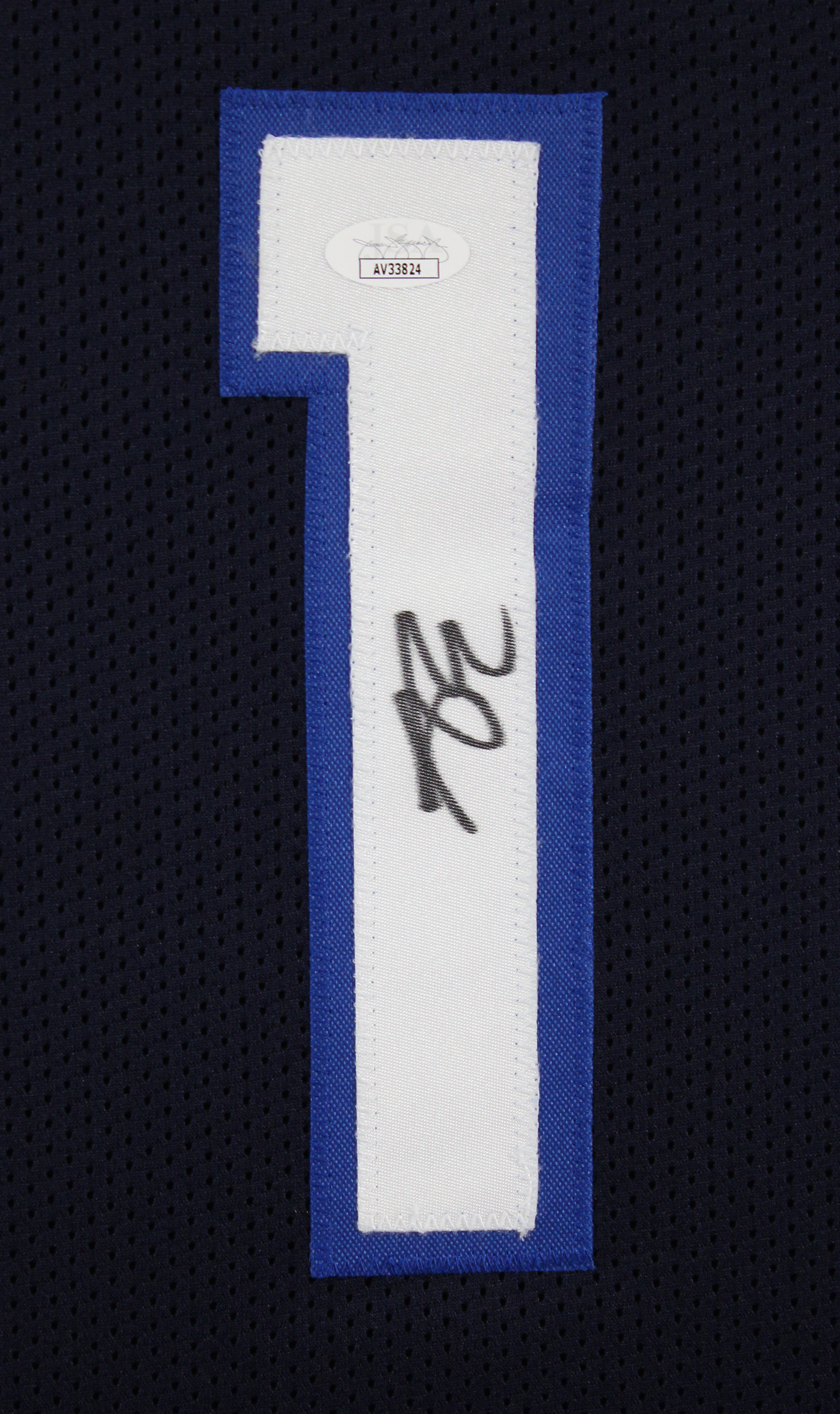 This Autographed Navy Blue Pro Style Framed Jersey has been Personally Signed by Anthony Edwards of the Minnesota Timberwolves. This item is 100% Authentic to include a Certificate of Authenticity (COA) / hologram by JSA. We have multiples of this same item. While the photographs are representative of this item, the size, placement and strength of the signature may vary. Each item is hand signed, therefore, each autograph is unique. This item has been professionally framed to overall dimensions of approximately 32 x 37 inches. This is a X-Large sized, non-branded, custom-stitched Framed Jersey. This jersey will be framed to order, it will take 3-4 days from purchase date for it to ship.