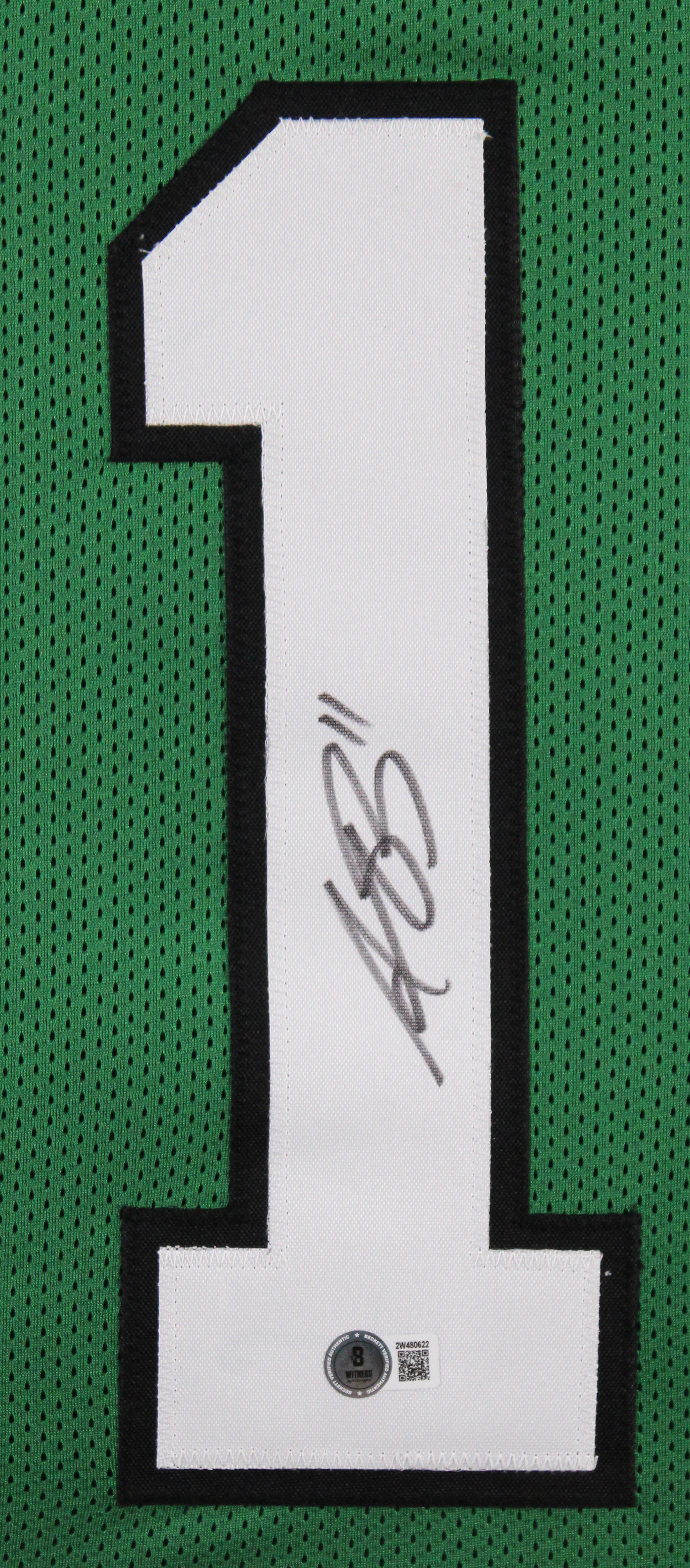 This Autographed Kelly Green Pro Style Framed Jersey has been Personally Signed by A.J. Brown of the Philadelphia Eagles. This item is 100% Authentic to include a hologram by Beckett Authentication Services. This item may come with the new Beckett Authentication hologram that has a scannable QR code rather than the traditional COA. If you would like to have a COA, you are welcome to reach out to Beckett for a printed certification once you receive your item. This is a BAS Witnessed Protection Program item which means a Beckett Authentication Service representative was present when this item was being signed. We conducted an autograph signing with A.J. Brown where multiples of the same item were signed. While the photographs are representative of this item, the size, placement and strength of the signature may vary. Each item is hand signed, therefore, each autograph is unique. This item can be verified through BAS Witnessed. This item has been professionally framed to overall dimensions of approximately 32 x 37 inches. This is a X-Large sized, non-branded, custom-stitched Framed Jersey. These jerseys are framed to order, it takes approximately 3-4 business days for framing to be completed.