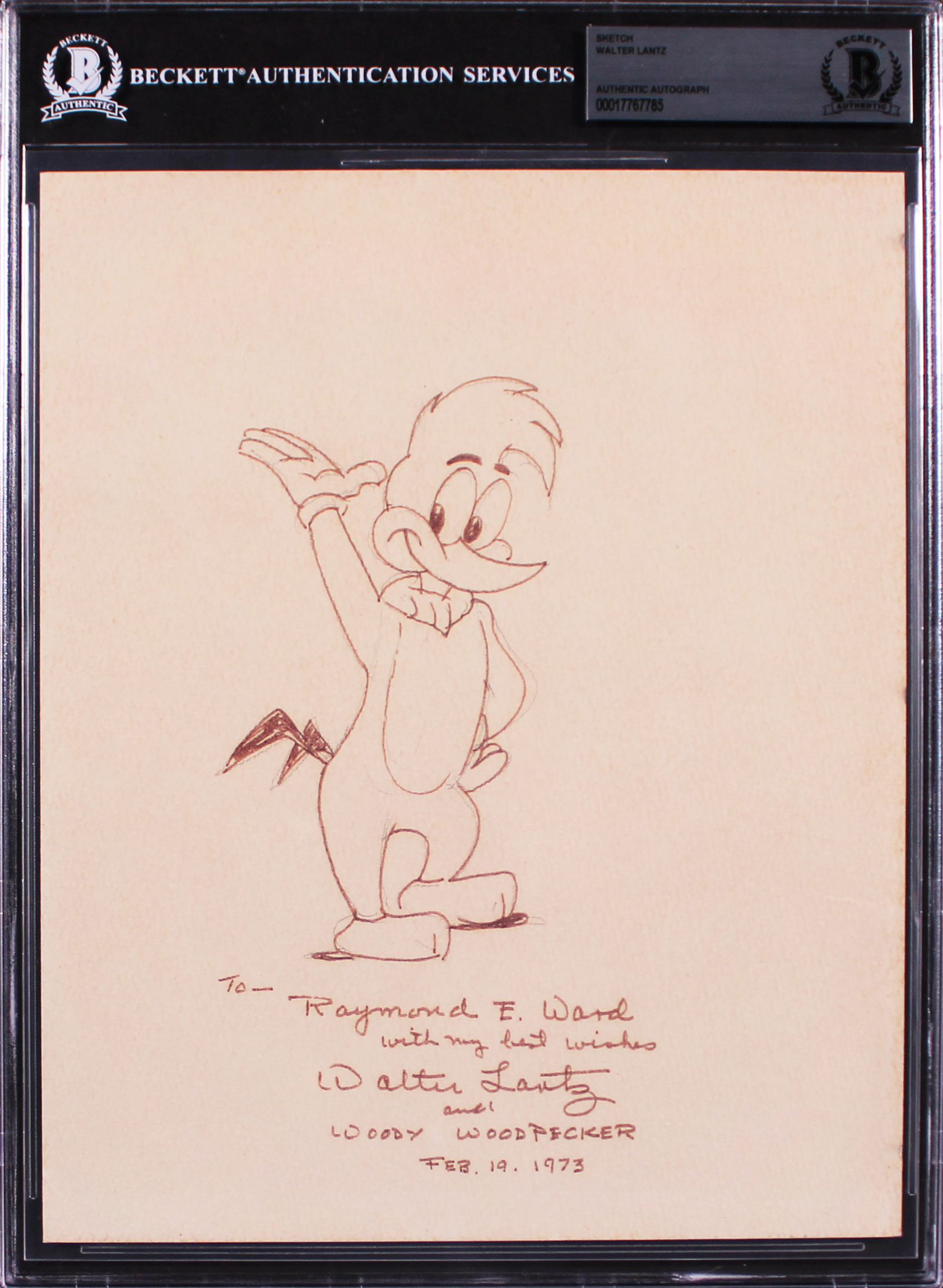 This Autographed Woody Woodpecker 8x10 Sketch with the inscription of "To Raymond E. Ward with my best wishes And Wood Woodpecker Feb. 19, 1973" has been Personally Signed by Walter Lantz of Woody Woodpecker. This item is 100% Authentic, it comes slabbed and authenticated by Beckett Authentication Services. The authenticity can be verified on Beckett Authentication Services website.