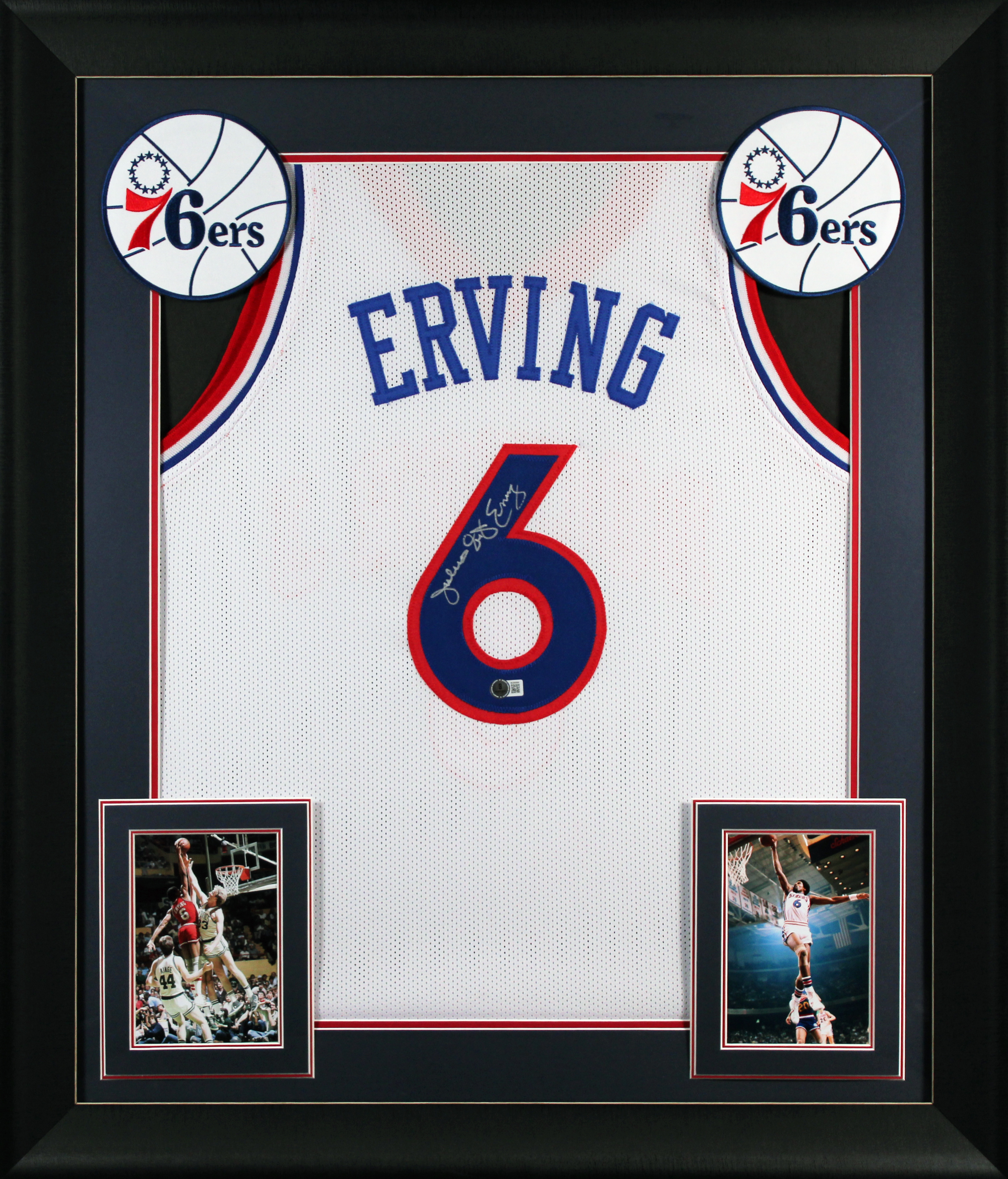 This Autographed White Pro Style Framed Jersey has been Personally Signed by Julius "Dr. J" Erving of the Philadelphia 76ers. This item is 100% Authentic to include a hologram by Beckett Authentication Services. This item may come with the new Beckett Authentication hologram that has a scannable QR code rather than the traditional COA. If you would like to have a COA, you are welcome to reach out to Beckett for a printed certification once you receive your item. This is a BAS Witnessed Protection Program item which means a Beckett Authentication Service representative was present when this item was being signed. We conducted an autograph signing with Julius "Dr. J" Erving where multiples of the same item were signed. While the photographs are representative of this item, the size, placement and strength of the signature may vary. Each item is hand signed, therefore, each autograph is unique. This item can be verified through BAS Witnessed. This item has been professionally framed to overall dimensions of approximately 32 x 37 inches. This is a X-Large sized, non-branded, custom-stitched Framed Jersey. This jersey will be framed to order, it will take approximately 3-4 business days from purchase date for it to ship.