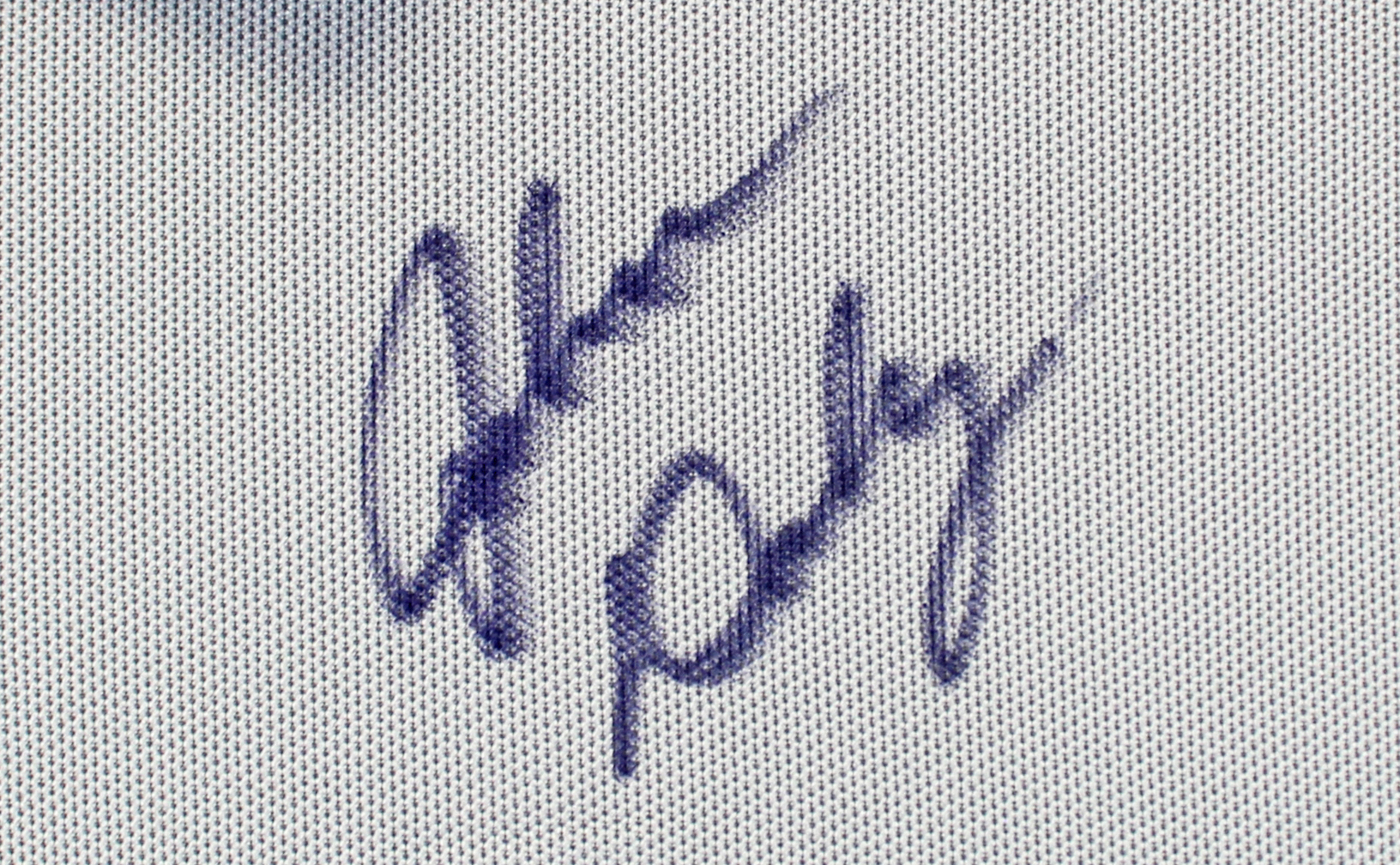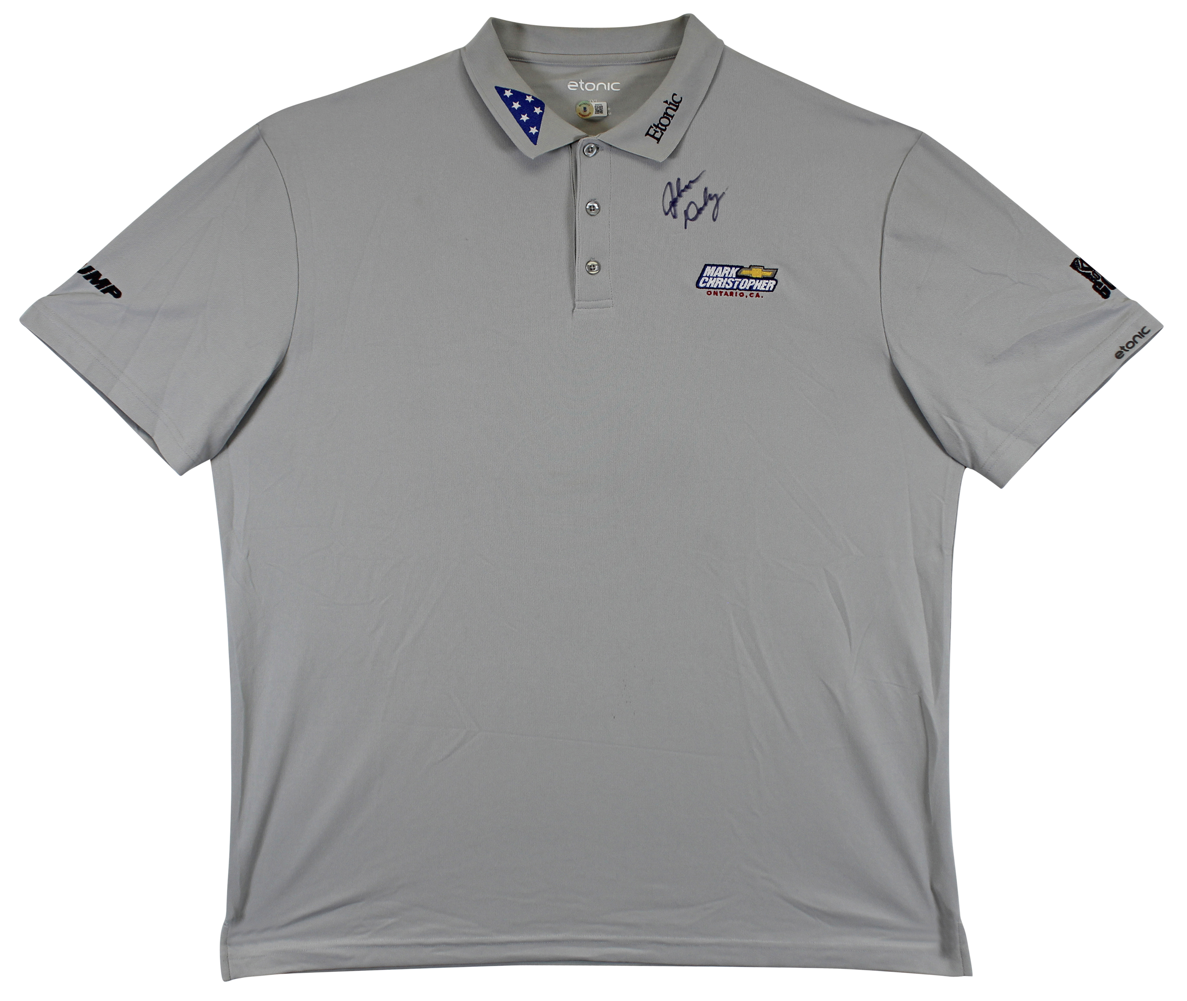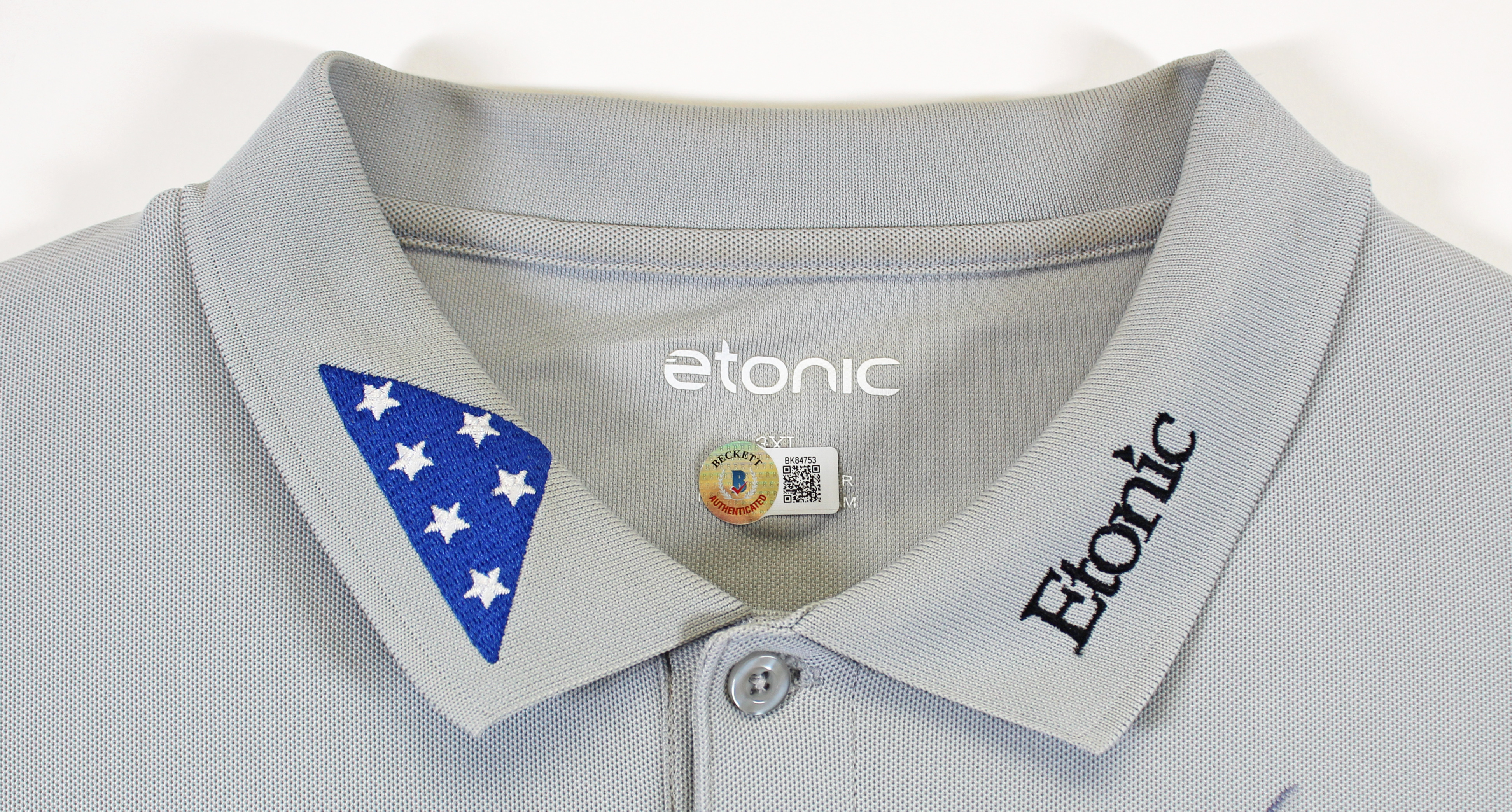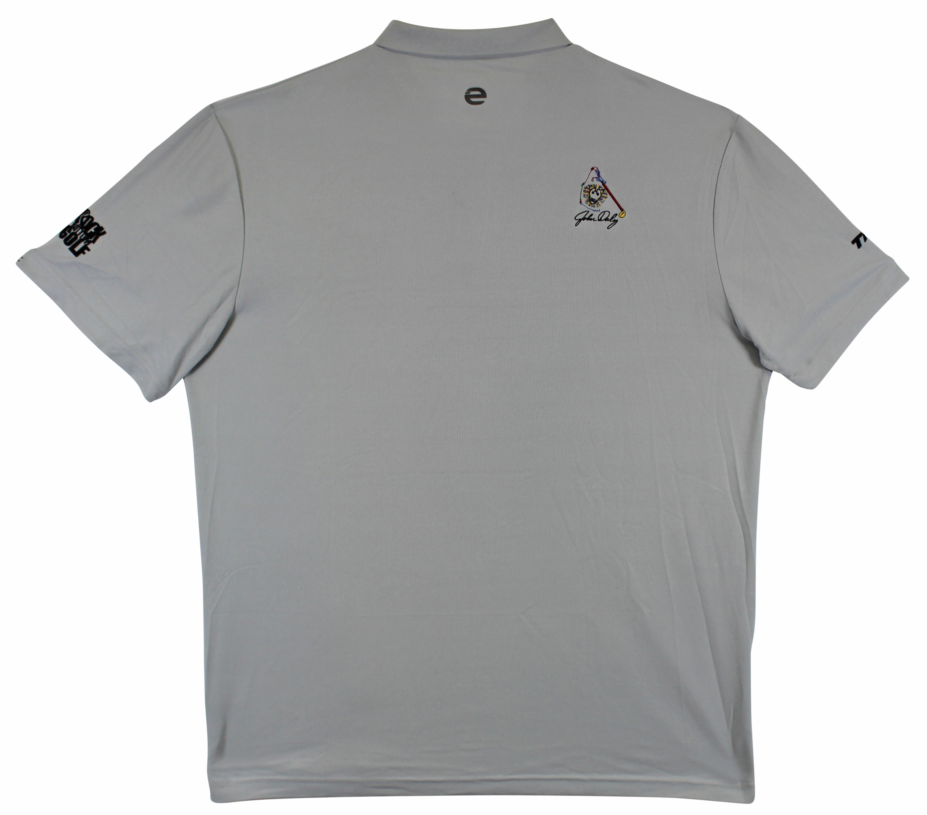 This Autographed Match Worn Grey Etonic Mark Christopher Rock Bottom Golf Trump Polo Shirt has been Personally Signed by John Daly. This item is 100% Authentic to include a hologram by Beckett Authentication Services. This item will come with an affixed Beckett Authentication Services (BAS) authentication sticker, which includes a scannable QR code to verify authenticity. Please note that Beckett no longer provides serial-numbered COA cards, and the attached BAS sticker will serve as the complete authentication for this item. The authenticity can be verified on Beckett Authentication Services website. This is a XXX-Large sized Shirt. This Match Worn Grey Etonic Mark Christopher Rock Bottom Golf Trump Polo shirt has been worn by John Daly, and comes with a letter of Authenticity from John Daly certifying this is match worn & provenance of the item coming from his personal collection.