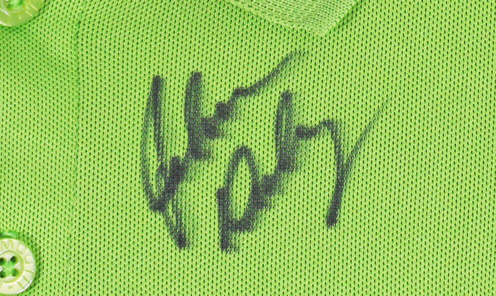 This Autographed Match Worn Green Loudmouth Mark Christopher Pitch & Play Trump ETS Rock Bottom Golf Polo Shirt has been Personally Signed by John Daly. This item is 100% Authentic to include a hologram by Beckett Authentication Services. This item will come with an affixed Beckett Authentication Services (BAS) authentication sticker, which includes a scannable QR code to verify authenticity. Please note that Beckett no longer provides serial-numbered COA cards, and the attached BAS sticker will serve as the complete authentication for this item. The authenticity can be verified on Beckett Authentication Services website. This is a XXX-Large sized Shirt. This Match Worn Green Loudmouth Mark Christopher Pitch & Play Trump ETS Rock Bottom Golf Polo shirt has been worn by John Daly, and comes with a letter of Authenticity from John Daly certifying this is match worn & provenance of the item coming from his personal collection.