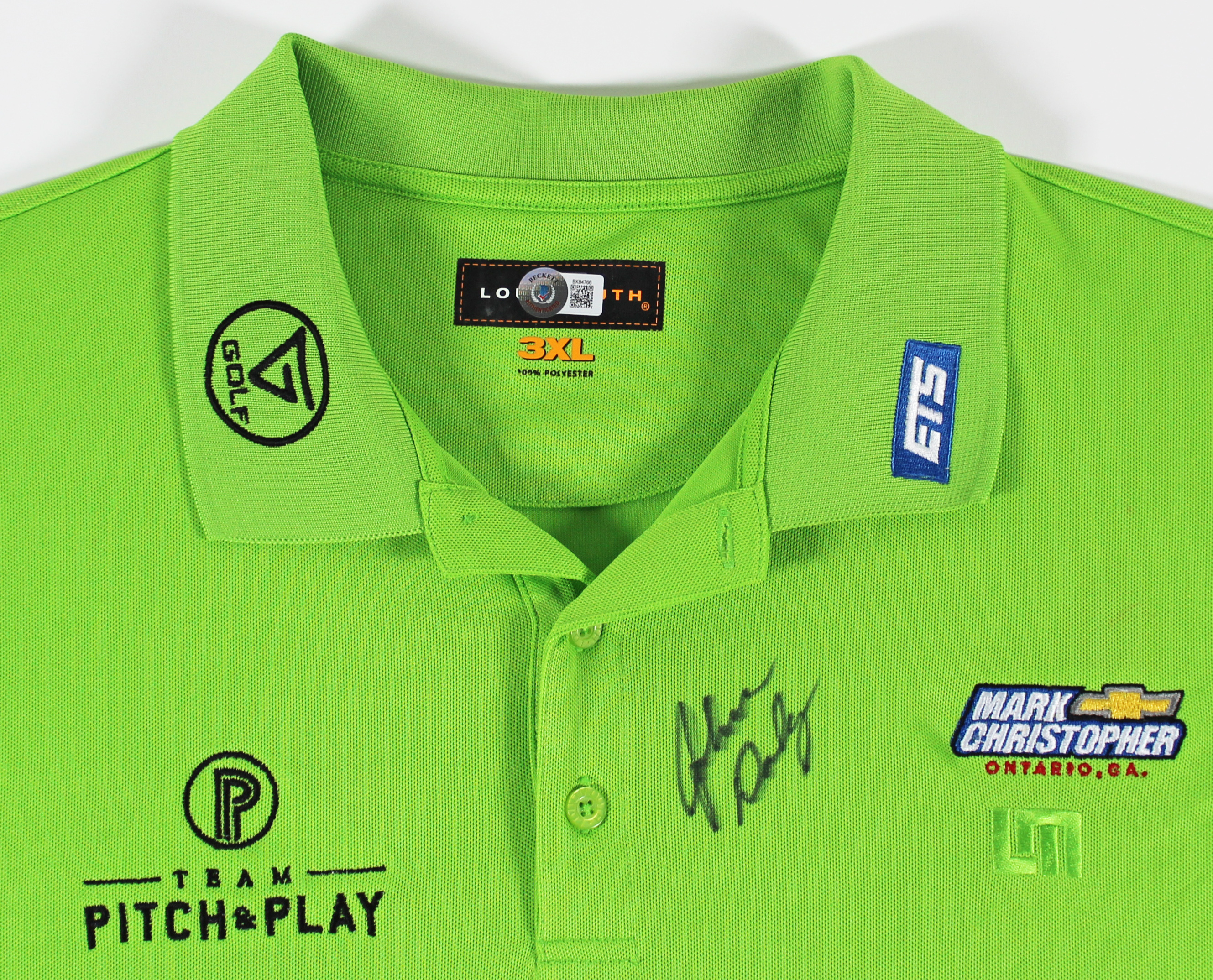 This Autographed Match Worn Green Loudmouth Mark Christopher Pitch & Play Trump ETS Rock Bottom Golf Polo Shirt has been Personally Signed by John Daly. This item is 100% Authentic to include a hologram by Beckett Authentication Services. This item will come with an affixed Beckett Authentication Services (BAS) authentication sticker, which includes a scannable QR code to verify authenticity. Please note that Beckett no longer provides serial-numbered COA cards, and the attached BAS sticker will serve as the complete authentication for this item. The authenticity can be verified on Beckett Authentication Services website. This is a XXX-Large sized Shirt. This Match Worn Green Loudmouth Mark Christopher Pitch & Play Trump ETS Rock Bottom Golf Polo shirt has been worn by John Daly, and comes with a letter of Authenticity from John Daly certifying this is match worn & provenance of the item coming from his personal collection.
