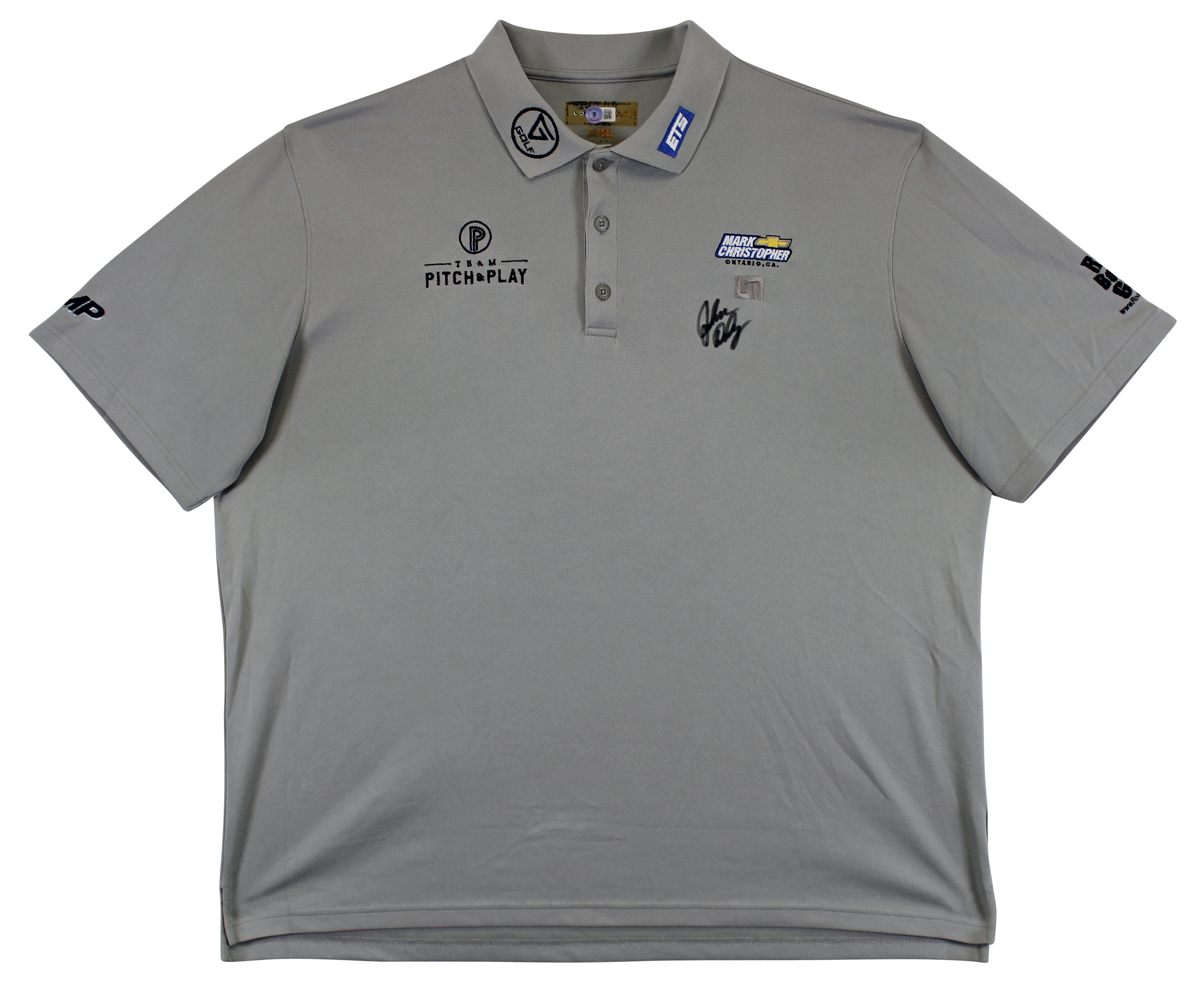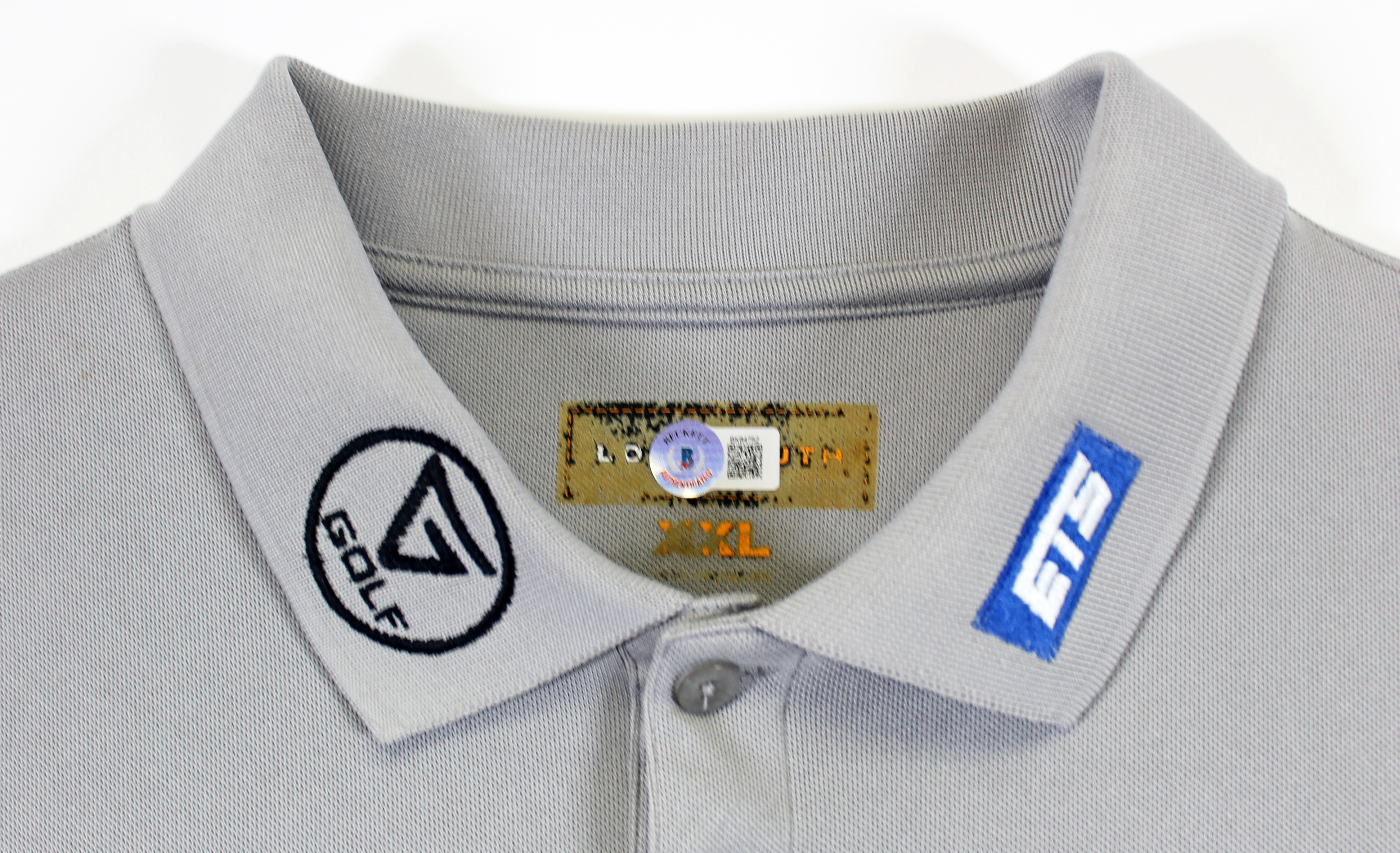This Autographed Match Worn Grey Loudmouth Mark Christopher Team Pitch & Play Rock Bottom Golf Trump Polo Shirt has been Personally Signed by John Daly. This item is 100% Authentic to include a hologram by Beckett Authentication Services. This item will come with an affixed Beckett Authentication Services (BAS) authentication sticker, which includes a scannable QR code to verify authenticity. Please note that Beckett no longer provides serial-numbered COA cards, and the attached BAS sticker will serve as the complete authentication for this item. The authenticity can be verified on Beckett Authentication Services website. This is a XX-Large sized Shirt. This Match Worn Grey Loudmouth Mark Christopher Team Pitch & Play Rock Bottom Golf Trump Polo shirt has been worn by John Daly, and comes with a letter of Authenticity from John Daly certifying this is match worn & provenance of the item coming from his personal collection.