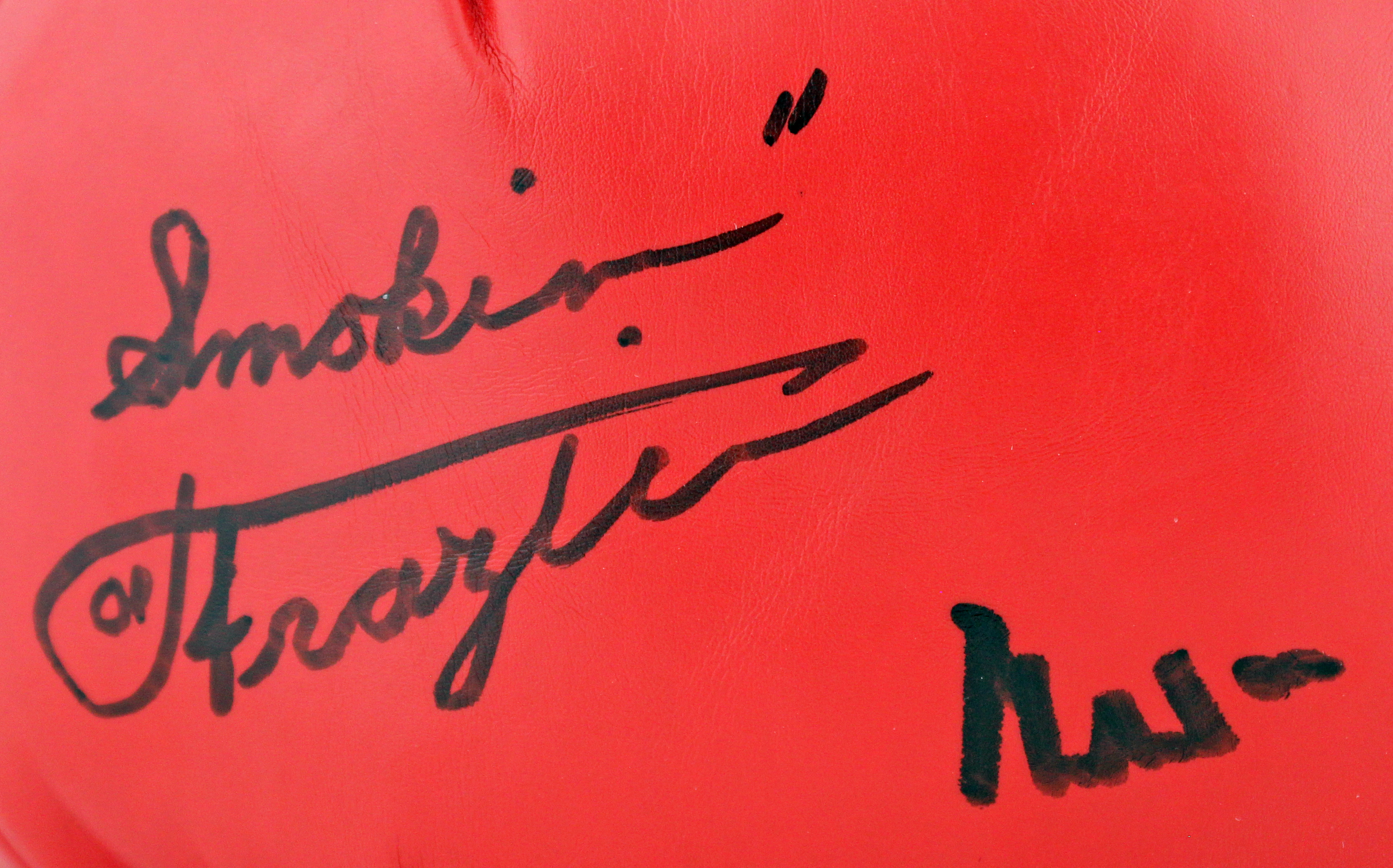 This Autographed Red Everlast Boxing Glove with the inscription of "Smokin (Frazier)" has been Personally Signed by Muhammad Ali & Joe Frazier. This item is 100% Authentic and comes with a PSA/DNA Certification Card and a matching numbered Hologram. The authenticity can be verified on Professional Sports Authenticator website.