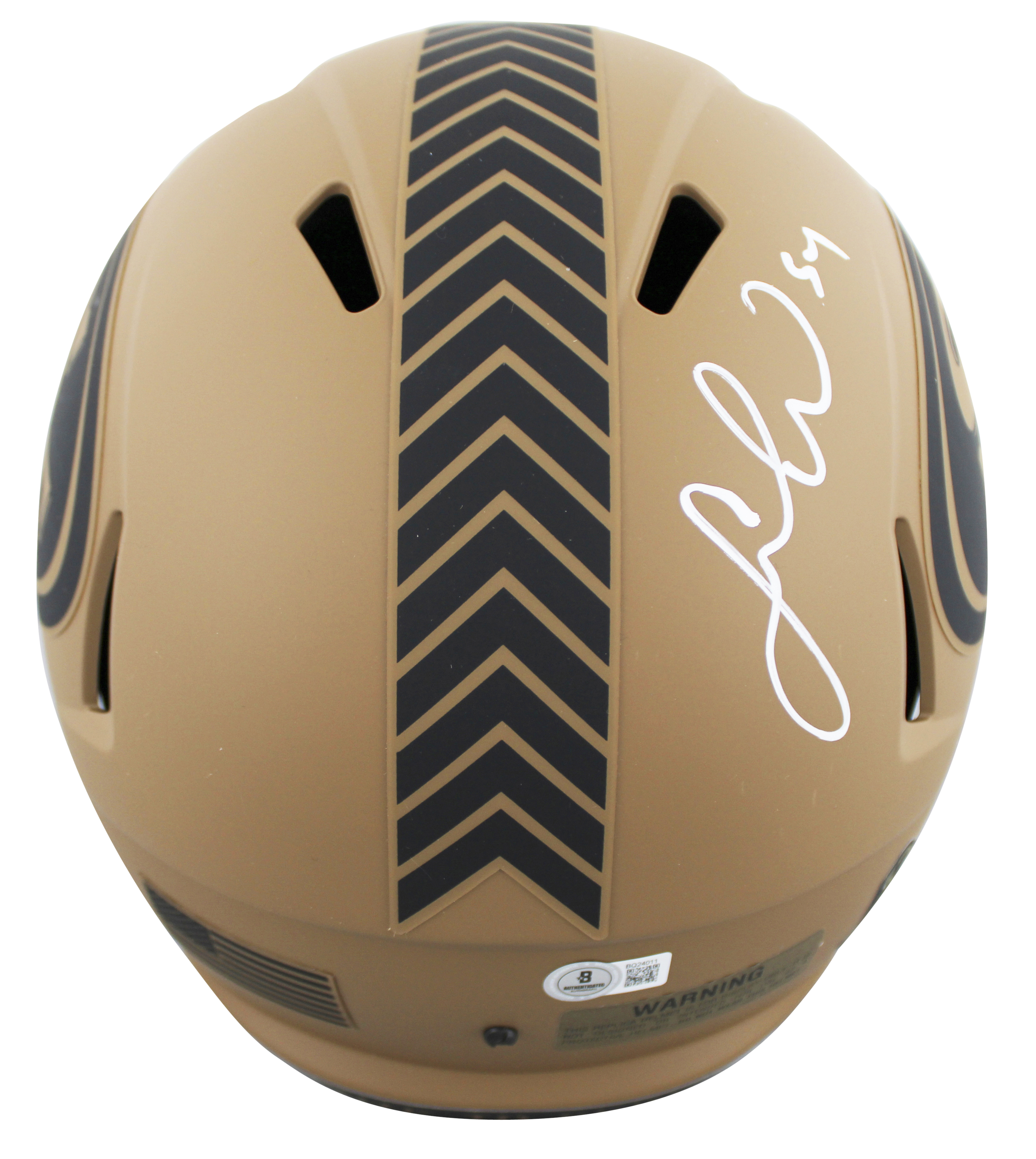 This Autographed Alternate 2023 Salute To Service II Riddell Full Size Speed Rep Helmet has been Personally Signed by Fred Warner of the San Francisco 49ers. This item is 100% Authentic to include a hologram by Beckett Authentication Services. This item will come with an affixed Beckett Authentication Services (BAS) authentication sticker, which includes a scannable QR code to verify authenticity. Please note that Beckett no longer provides serial-numbered COA cards, and the attached BAS sticker will serve as the complete authentication for this item. This is a BAS Witnessed Protection Program item which means a Beckett Authentication Service representative was present when this item was being signed. We conducted an autograph signing with Fred Warner where multiples of the same item were signed. While the photographs are representative of this item, the size, placement and strength of the signature may vary. Each item is hand signed, therefore, each autograph is unique. This item can be verified through BAS Witnessed.