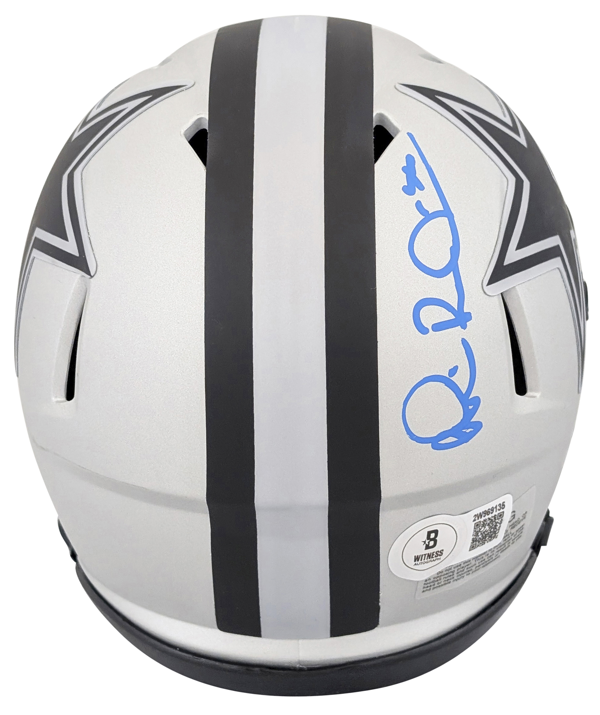 This Autographed Alternate Rave Speed Mini Helmet has been Personally Signed by Michael Irvin of the Dallas Cowboys. This item is 100% Authentic to include a hologram by Beckett Authentication Services. This item will come with an affixed Beckett Authentication Services (BAS) authentication sticker, which includes a scannable QR code to verify authenticity. Please note that Beckett no longer provides serial-numbered COA cards, and the attached BAS sticker will serve as the complete authentication for this item. This is a BAS Witnessed Protection Program item which means a Beckett Authentication Service representative was present when this item was being signed. We conducted an autograph signing with Michael Irvin where multiples of the same item were signed. While the photographs are representative of this item, the size, placement and strength of the signature may vary. Each item is hand signed, therefore, each autograph is unique. This item can be verified through BAS Witnessed.