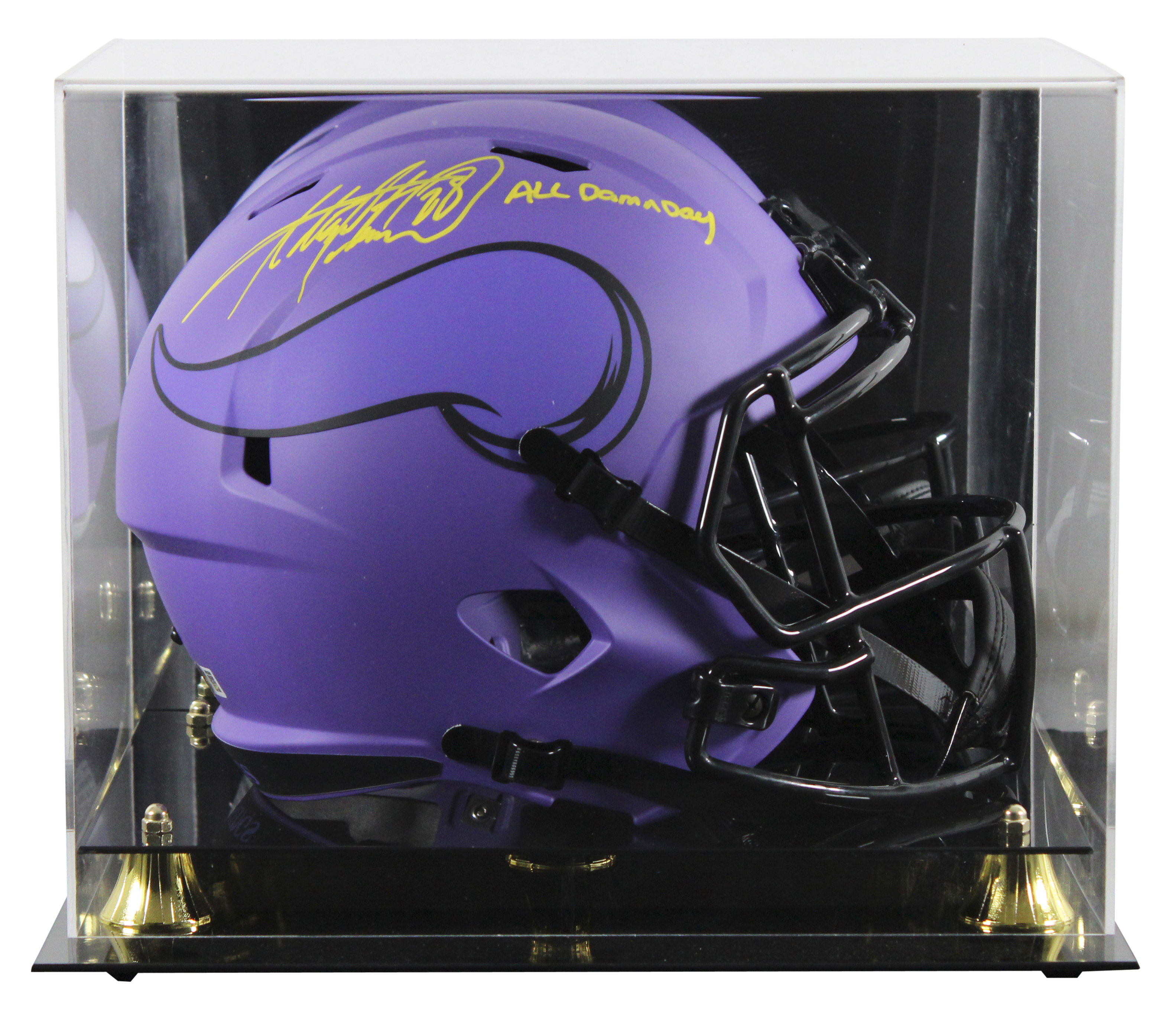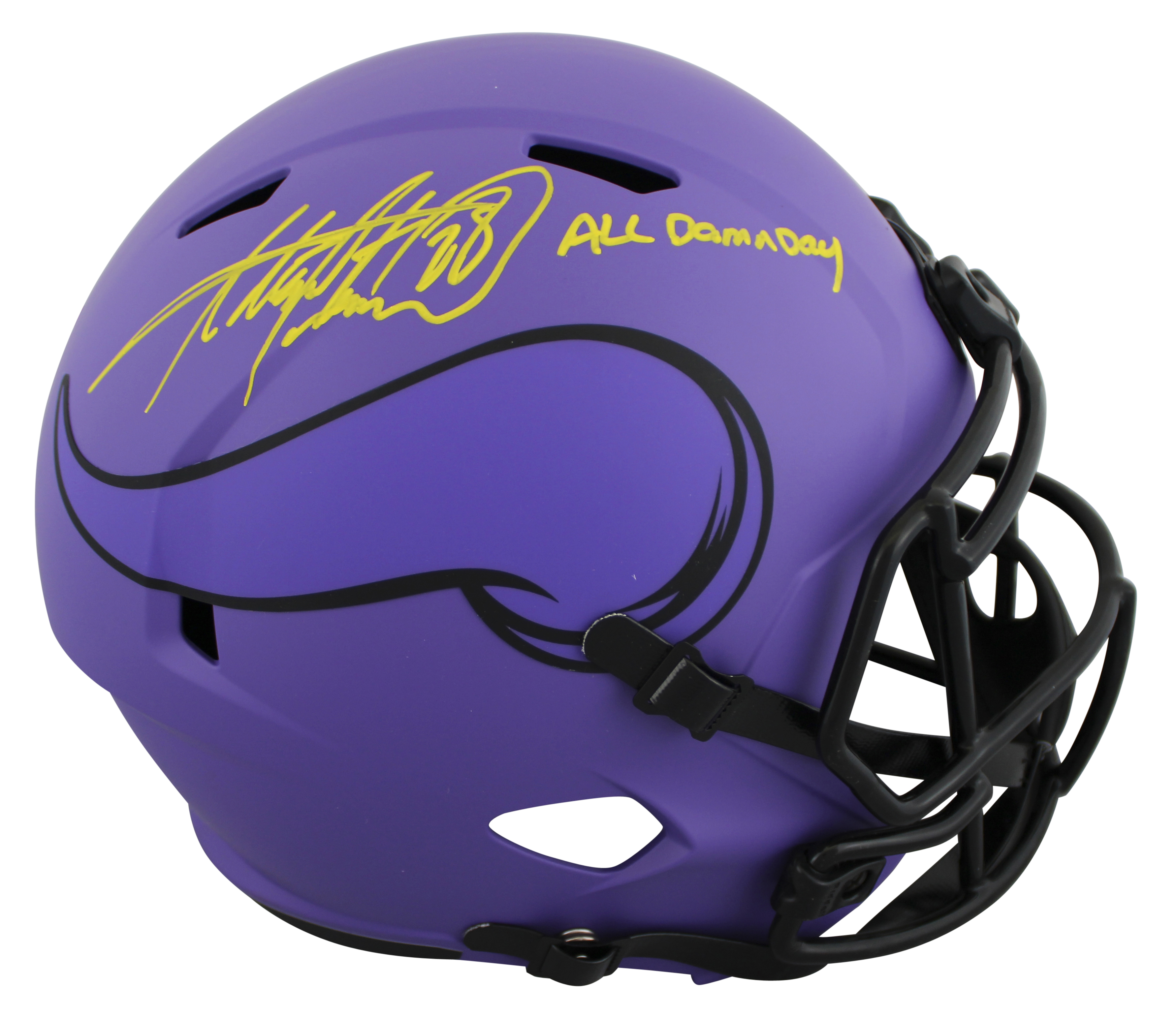 This Autographed Alternate Rave Riddell Full Size Speed Rep Helmet W/ Uv Mirrored Back Acrylic Display Case with the inscription of ""All Damn Day"" has been Personally Signed by Adrian Peterson of the Minnesota Vikings. This item is 100% Authentic to include a hologram by Beckett Authentication Services. This item will come with an affixed Beckett Authentication Services (BAS) authentication sticker, which includes a scannable QR code to verify authenticity. Please note that Beckett no longer provides serial-numbered COA cards, and the attached BAS sticker will serve as the complete authentication for this item. This is a BAS Witnessed Protection Program item which means a Beckett Authentication Service representative was present when this item was being signed. We conducted an autograph signing with Adrian Peterson where multiples of the same item were signed. While the photographs are representative of this item, the size, placement and strength of the signature may vary. Each item is hand signed, therefore, each autograph is unique. This item can be verified through BAS Witnessed.