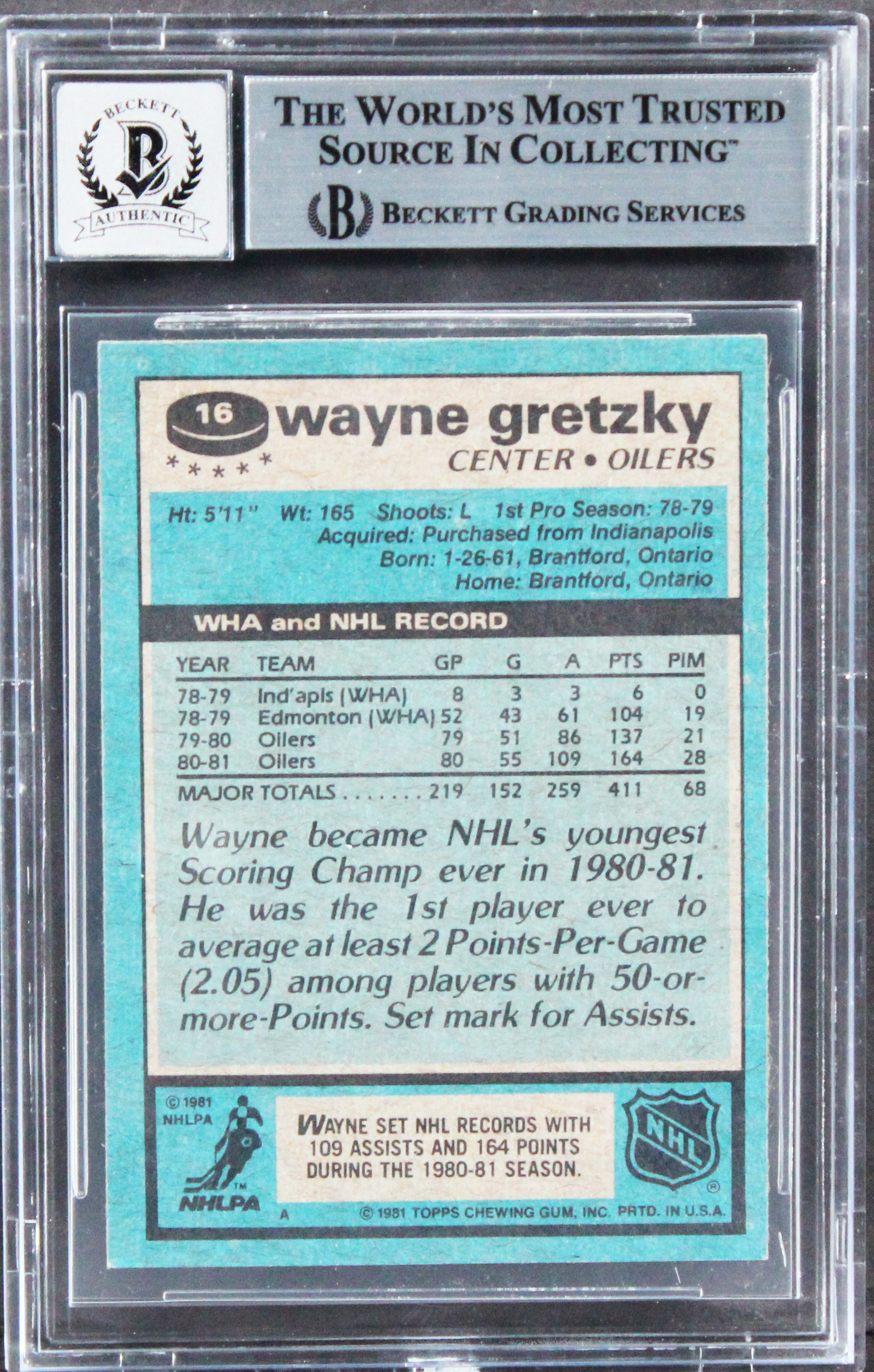 This Autographed Auto Graded Gem Mint 10! 1981 Topps #16 Card has been Personally Signed by Wayne Gretzky of the Edmonton Oilers. This item is 100% Authentic, it comes slabbed and authenticated by Beckett Authentication Services. The authenticity can be verified on Beckett Authentication Services website.