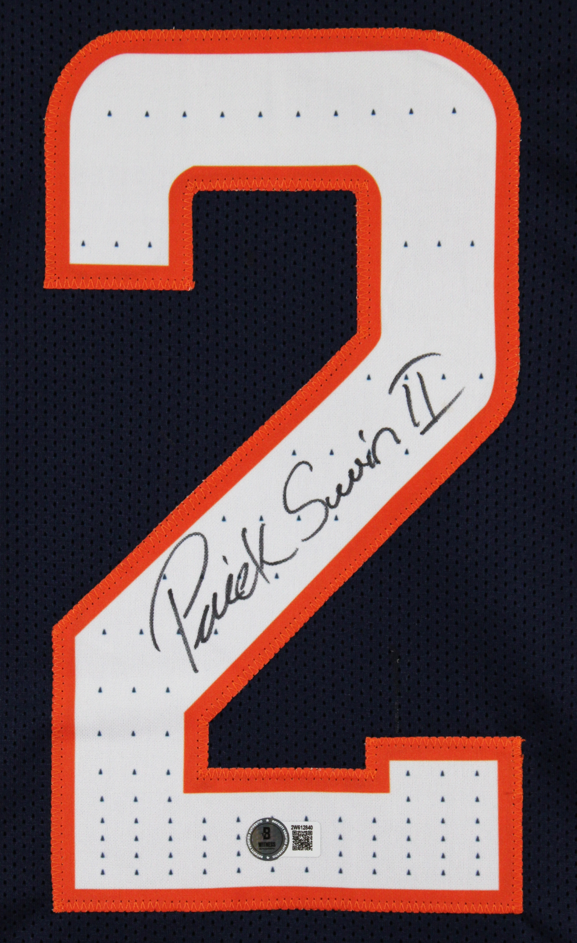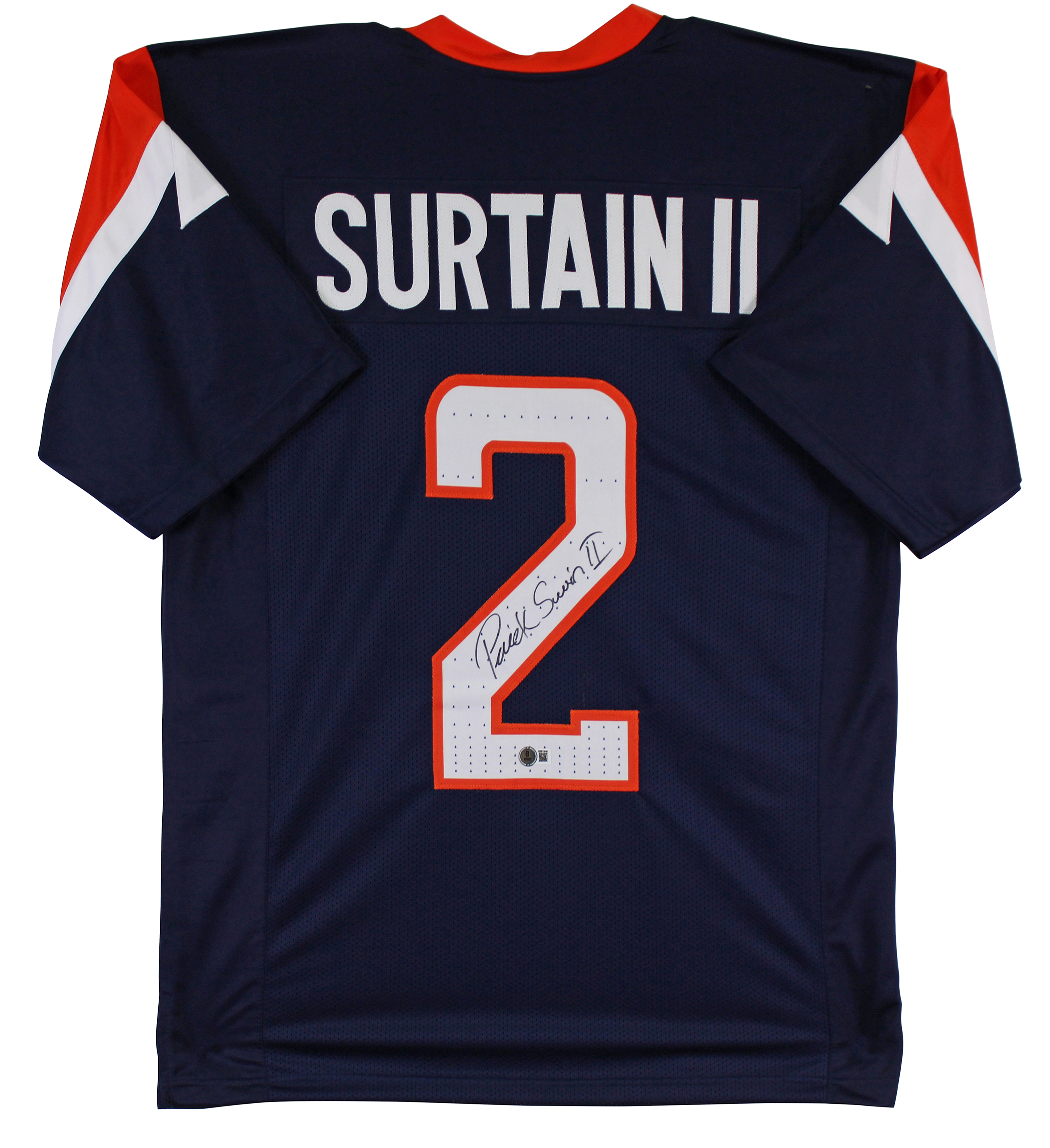 This Autographed Navy Blue Pro Style Jersey has been Personally Signed by Patrick Surtain II of the Denver Broncos. This item is 100% Authentic to include a hologram by Beckett Authentication Services. This item will come with an affixed Beckett Authentication Services (BAS) authentication sticker, which includes a scannable QR code to verify authenticity. Please note that Beckett no longer provides serial-numbered COA cards, and the attached BAS sticker will serve as the complete authentication for this item. This is a BAS Witnessed Protection Program item which means a Beckett Authentication Service representative was present when this item was being signed. We conducted an autograph signing with Patrick Surtain II where multiples of the same item were signed. While the photographs are representative of this item, the size, placement and strength of the signature may vary. Each item is hand signed, therefore, each autograph is unique. This item can be verified through BAS Witnessed. This is a X-Large sized, non-branded, custom-stitched Jersey.