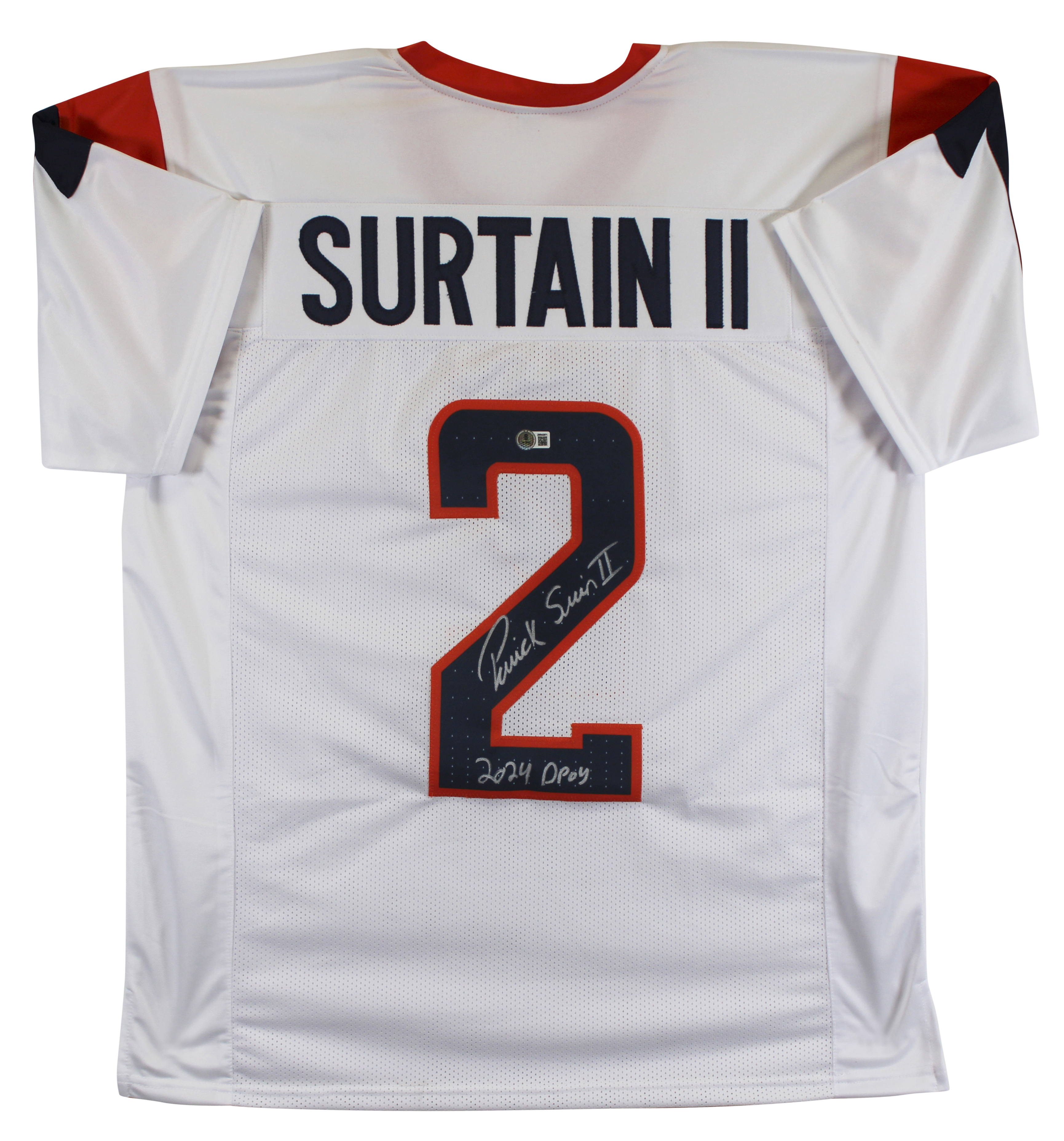 This Autographed White Pro Style Jersey with the inscription of "2024 DPOY" has been Personally Signed by Patrick Surtain II of the Denver Broncos. This item is 100% Authentic to include a hologram by Beckett Authentication Services. This item will come with an affixed Beckett Authentication Services (BAS) authentication sticker, which includes a scannable QR code to verify authenticity. Please note that Beckett no longer provides serial-numbered COA cards, and the attached BAS sticker will serve as the complete authentication for this item. This is a BAS Witnessed Protection Program item which means a Beckett Authentication Service representative was present when this item was being signed. We conducted an autograph signing with Patrick Surtain II where multiples of the same item were signed. While the photographs are representative of this item, the size, placement and strength of the signature may vary. Each item is hand signed, therefore, each autograph is unique. This item can be verified through BAS Witnessed. This is a X-Large sized, non-branded, custom-stitched Jersey.