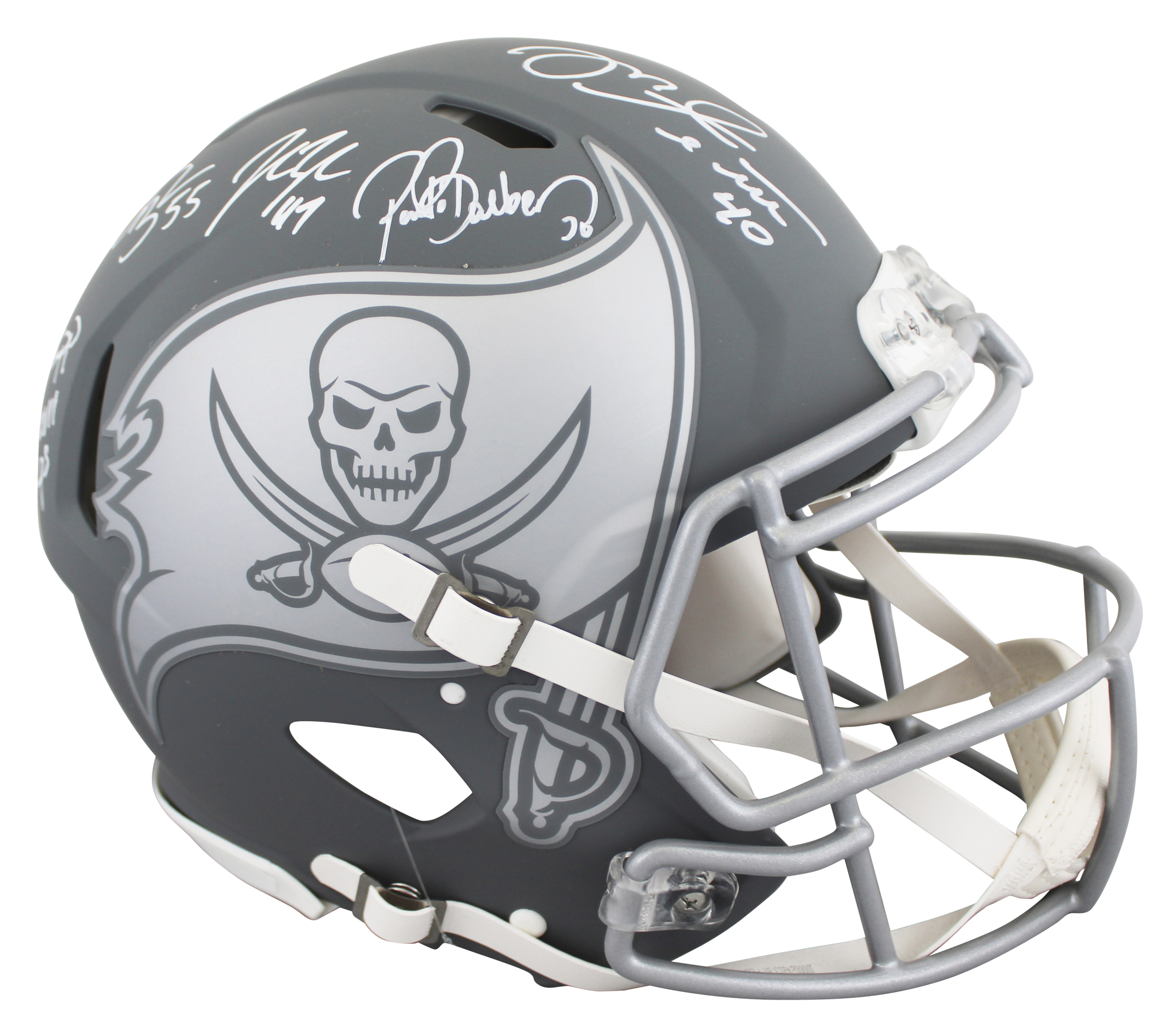 This Autographed Alternate Slate Riddell Authentic Full Size Speed Proline Helmet with the inscription of "SB XXXVII Champs (Sapp)" has been Personally Signed by John Lynch, Ronde Barber, Mike Alstott, Derrick Brooks & Warren Sapp of the Tampa Bay Buccaneers. This item is 100% Authentic to include a hologram by Beckett Authentication Services. This item will come with an affixed Beckett Authentication Services (BAS) authentication sticker, which includes a scannable QR code to verify authenticity. Please note that Beckett no longer provides serial-numbered COA cards, and the attached BAS sticker will serve as the complete authentication for this item. This is a BAS Witnessed Protection Program item which means a Beckett Authentication Service representative was present when this item was being signed. We conducted an autograph signing with John Lynch, Ronde Barber, Mike Alstott, Derrick Brooks & Warren Sapp where multiples of the same item were signed. While the photographs are representative of this item, the size, placement and strength of the signature may vary. Each item is hand signed, therefore, each autograph is unique. This item can be verified through BAS Witnessed.