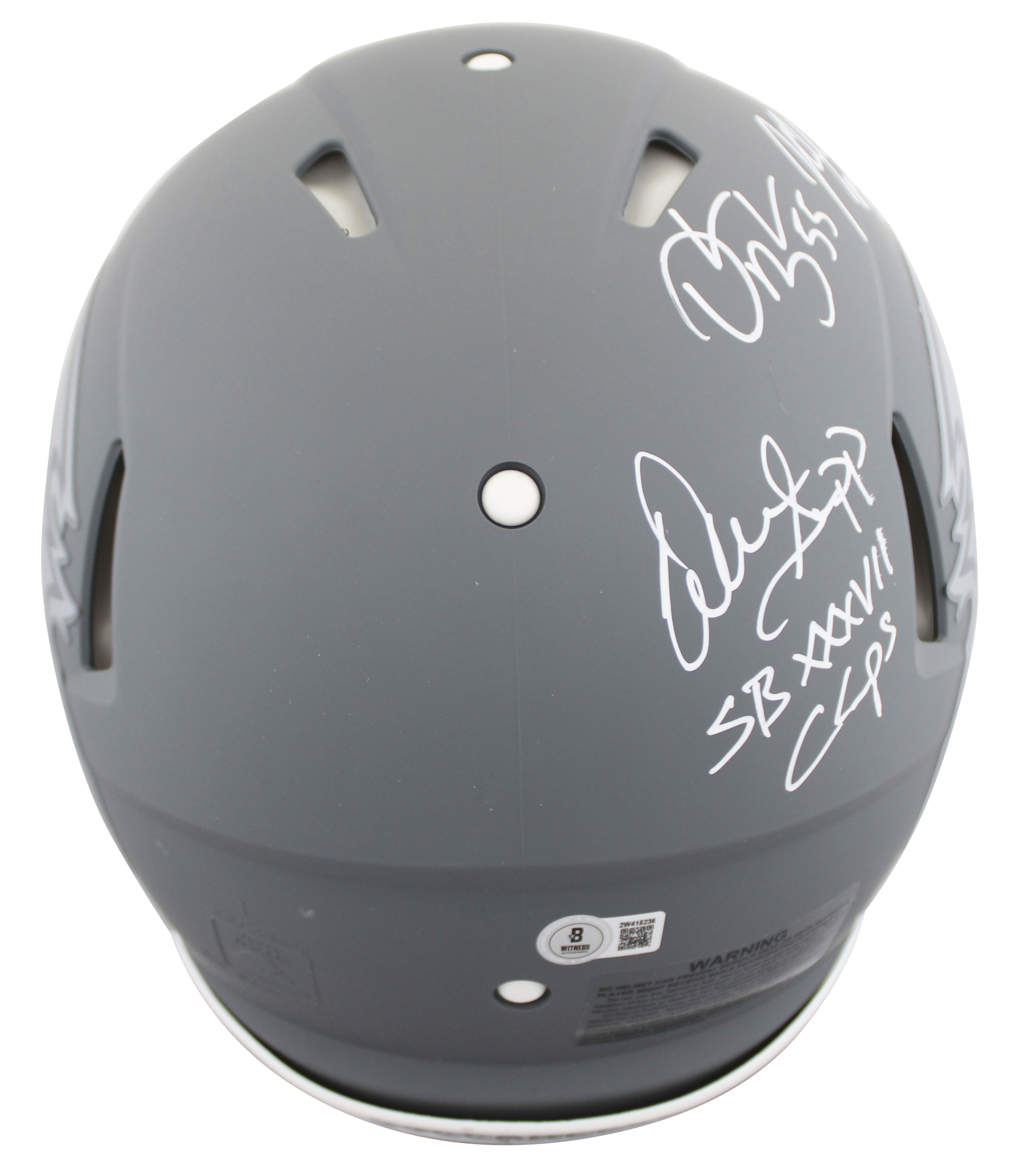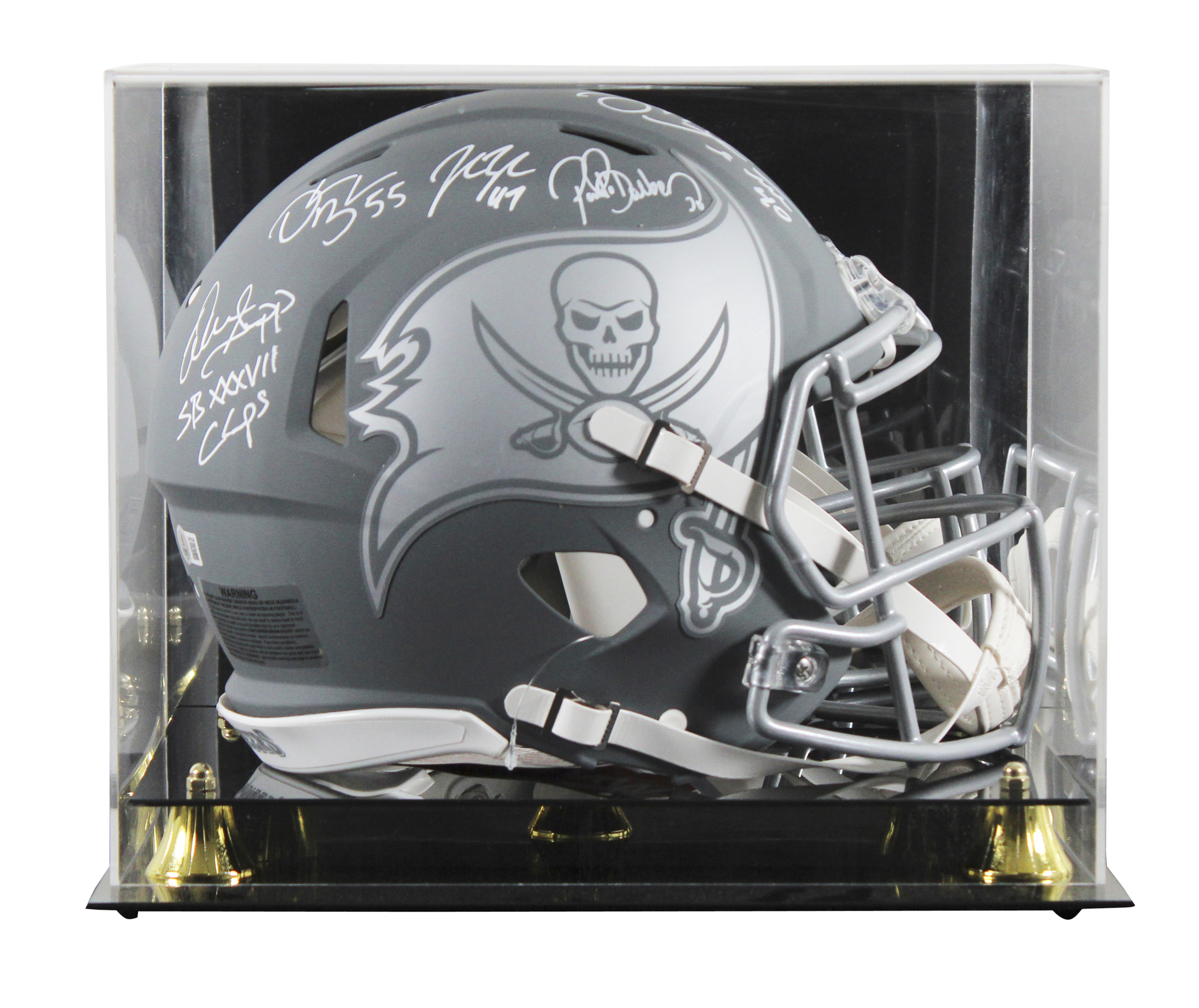 This Autographed Alternate Slate Riddell Full Size Speed Proline Helmet W/ Uv Mirrored Back Acrylic Display Case with the inscription of "SB XXXVII Champs (Sapp)" has been Personally Signed by John Lynch, Ronde Barber, Mike Alstott, Derrick Brooks & Warren Sapp of the Tampa Bay Buccaneers. This item is 100% Authentic to include a hologram by Beckett Authentication Services. This item will come with an affixed Beckett Authentication Services (BAS) authentication sticker, which includes a scannable QR code to verify authenticity. Please note that Beckett no longer provides serial-numbered COA cards, and the attached BAS sticker will serve as the complete authentication for this item. This is a BAS Witnessed Protection Program item which means a Beckett Authentication Service representative was present when this item was being signed. We conducted an autograph signing with John Lynch, Ronde Barber, Mike Alstott, Derrick Brooks & Warren Sapp where multiples of the same item were signed. While the photographs are representative of this item, the size, placement and strength of the signature may vary. Each item is hand signed, therefore, each autograph is unique. This item can be verified through BAS Witnessed.