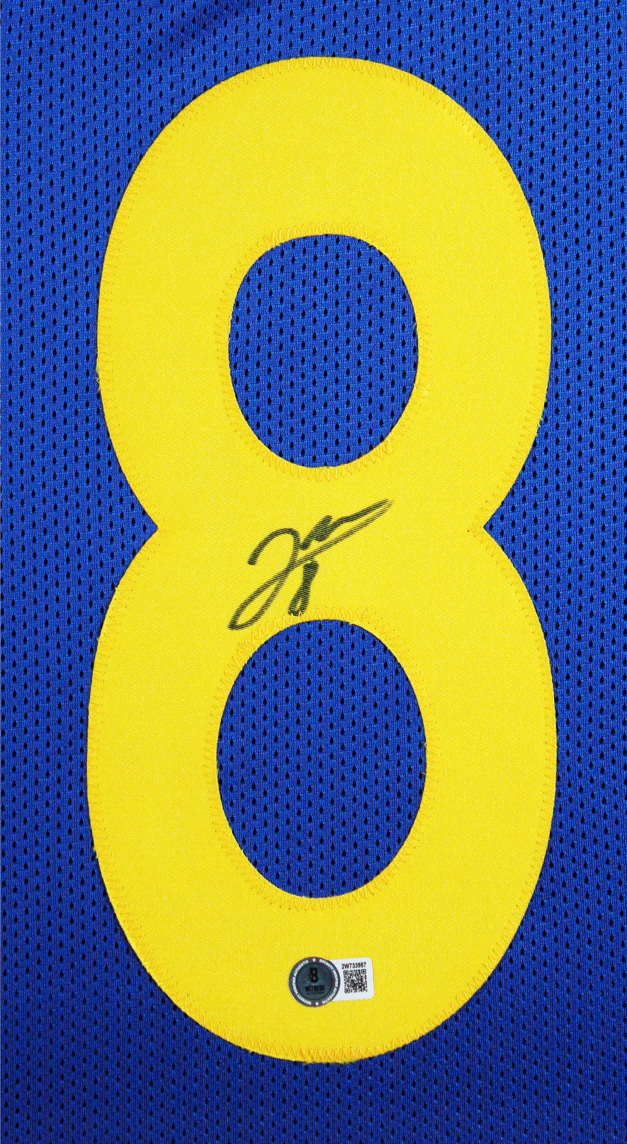 This Autographed Blue Pro Style Framed Jersey has been Personally Signed by Jared Verse of the Los Angeles Rams. This item is 100% Authentic to include a hologram by Beckett Authentication Services. This item will come with an affixed Beckett Authentication Services (BAS) authentication sticker, which includes a scannable QR code to verify authenticity. Please note that Beckett no longer provides serial-numbered COA cards, and the attached BAS sticker will serve as the complete authentication for this item. This is a BAS Witnessed Protection Program item which means a Beckett Authentication Service representative was present when this item was being signed. We have multiples of this same item. While the photographs are representative of this item, the size, placement and strength of the signature may vary. Each item is hand signed, therefore, each autograph is unique. This item has been professionally framed to overall dimensions of approximately 32 x 37 inches. This is a X-Large sized, non-branded, custom-stitched Framed Jersey. This jersey will be framed to order, it will take 3-4 days from purchase date for it to ship.